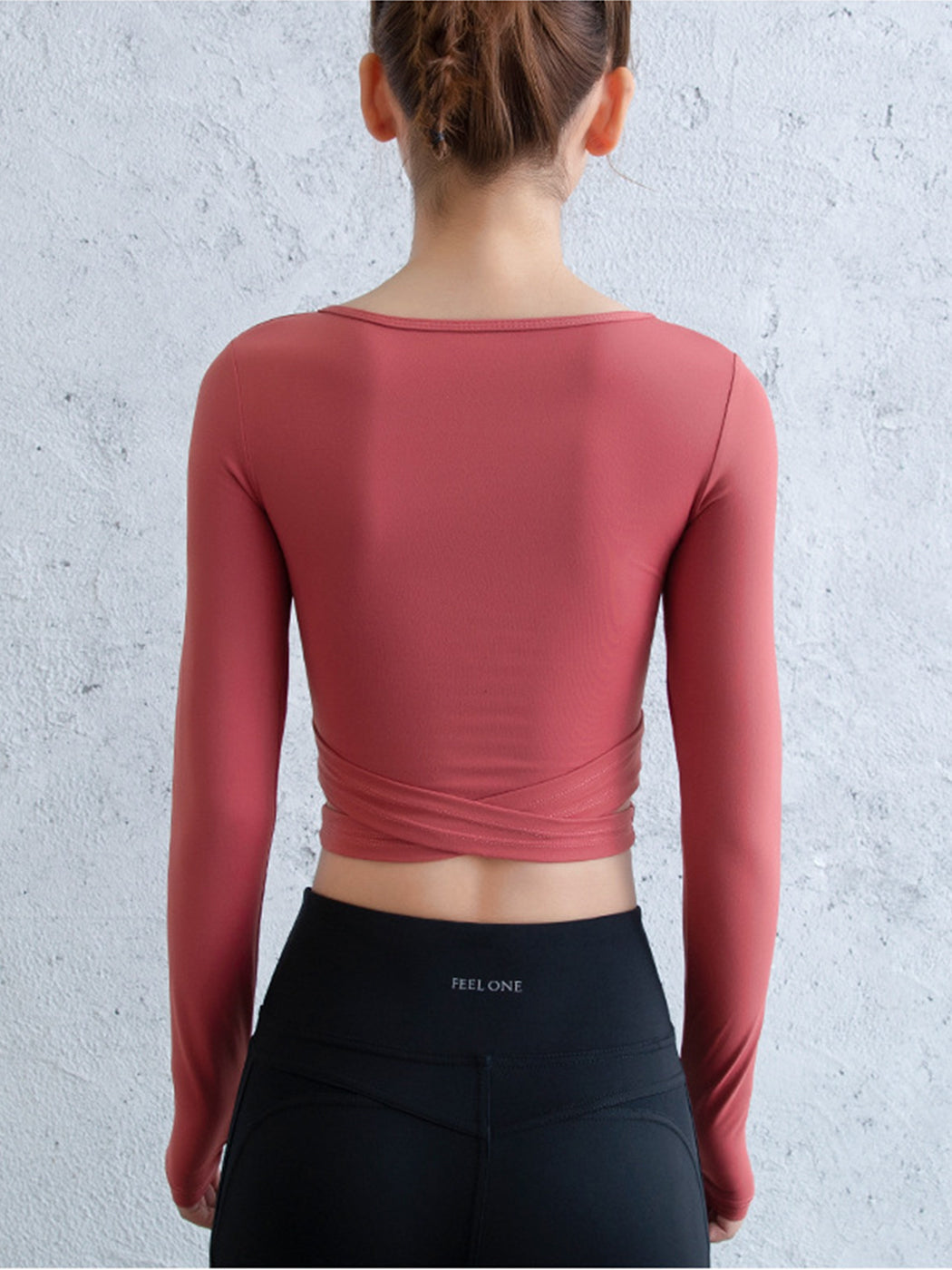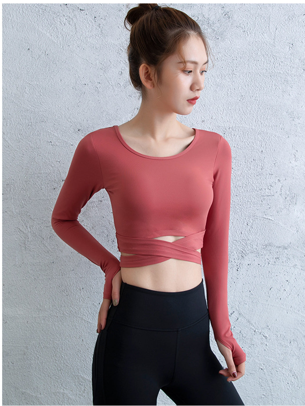 This yoga top has the perfect amount of skin showing. With this cute criss cross band a cross the hem, plus it also has built in cups. We got you covered!