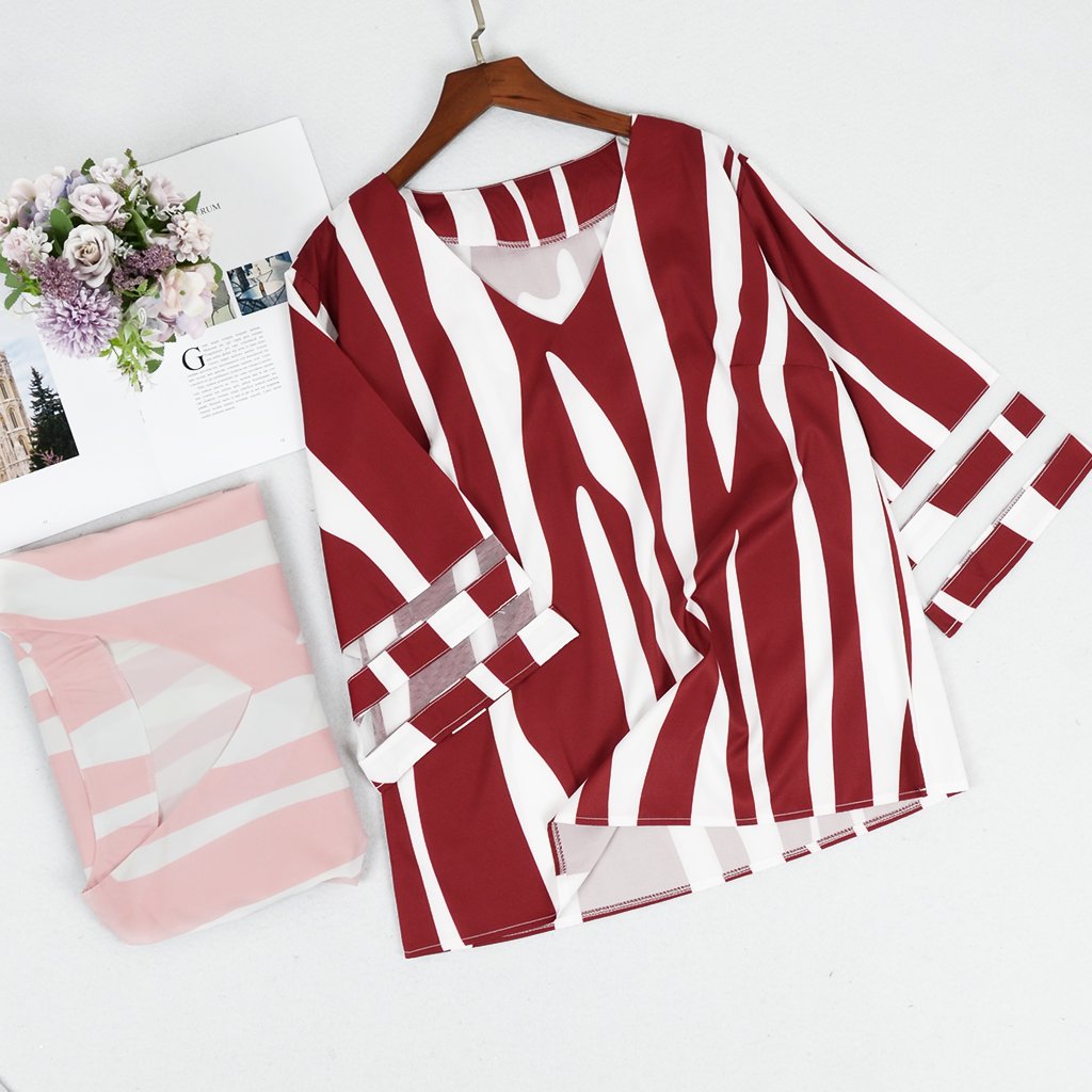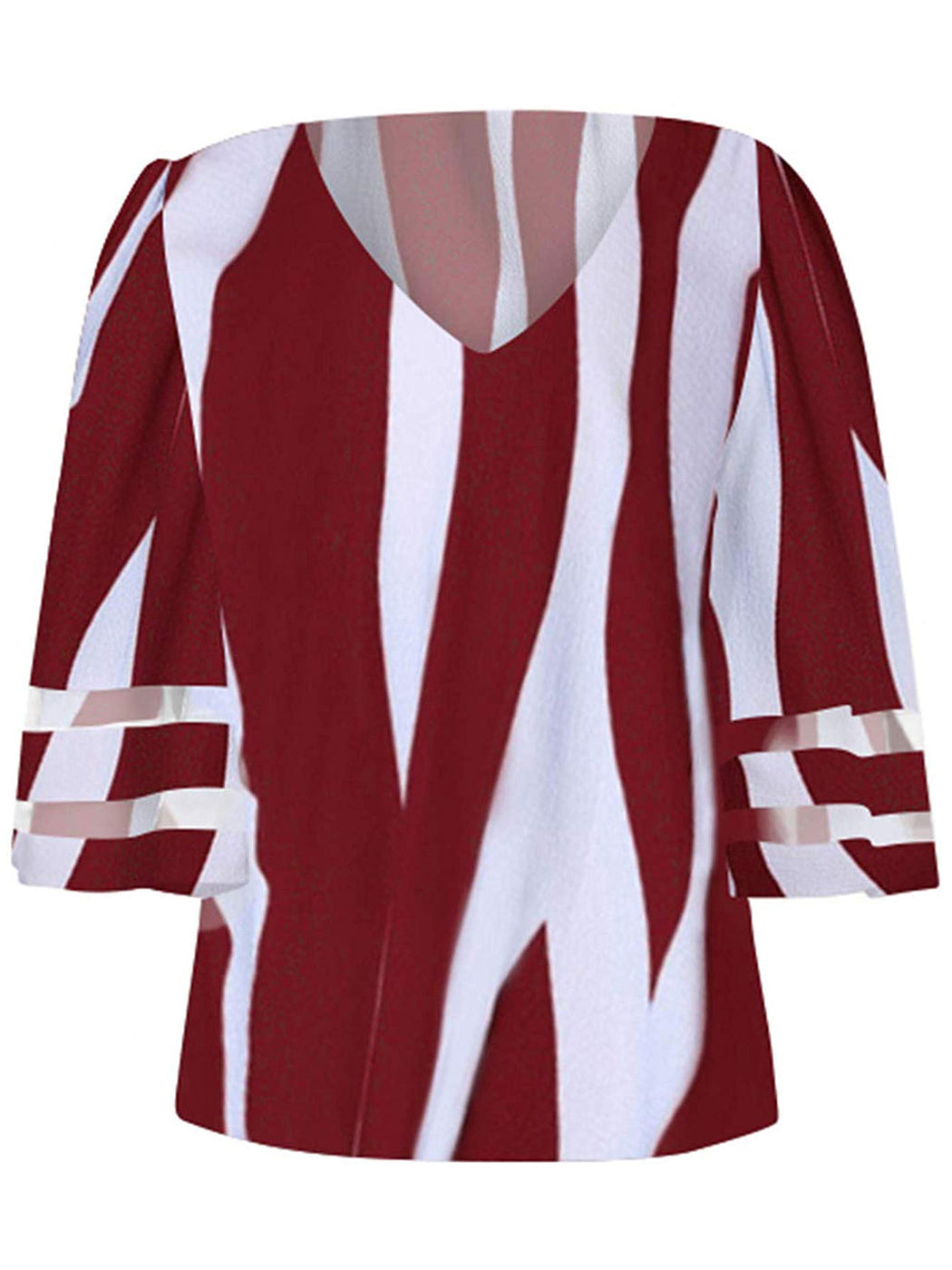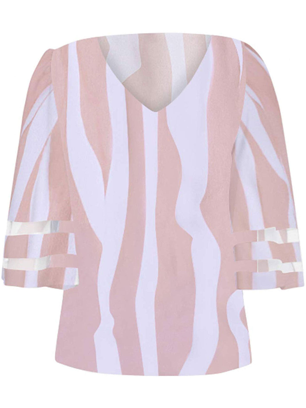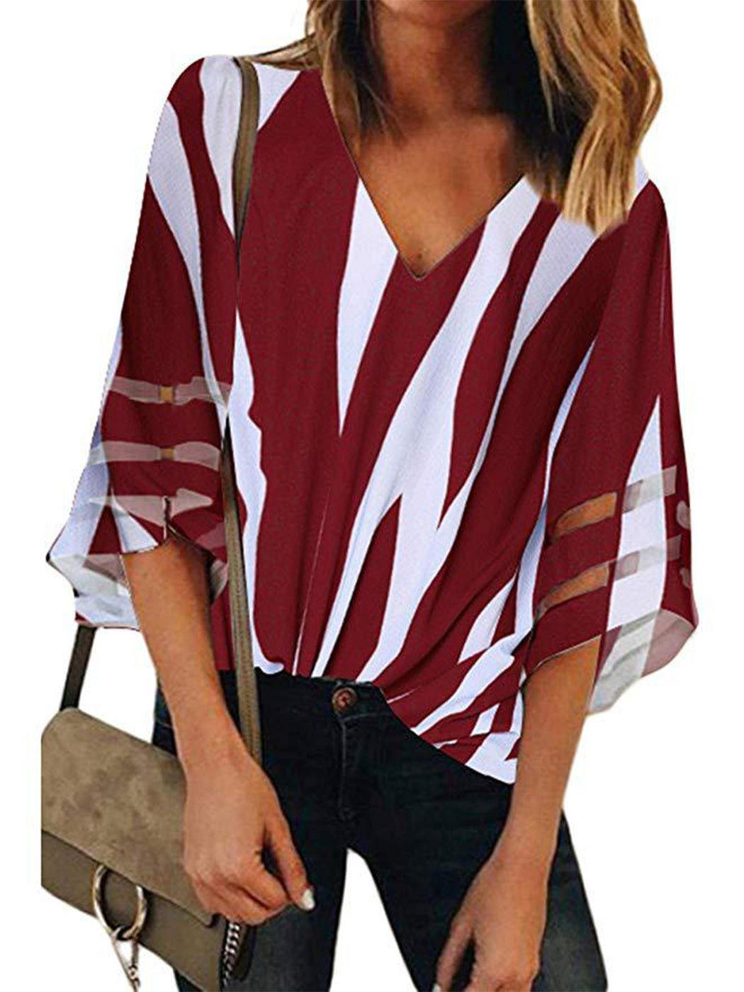 A classic v-neck blouse gets an update with full, fluttery sleeves cut with?mesh stripe insets. Pair it with jeans and booties for a night out look or pointed toe flats for workwear. This style has the most unique and effortless chic look with a unique print.?