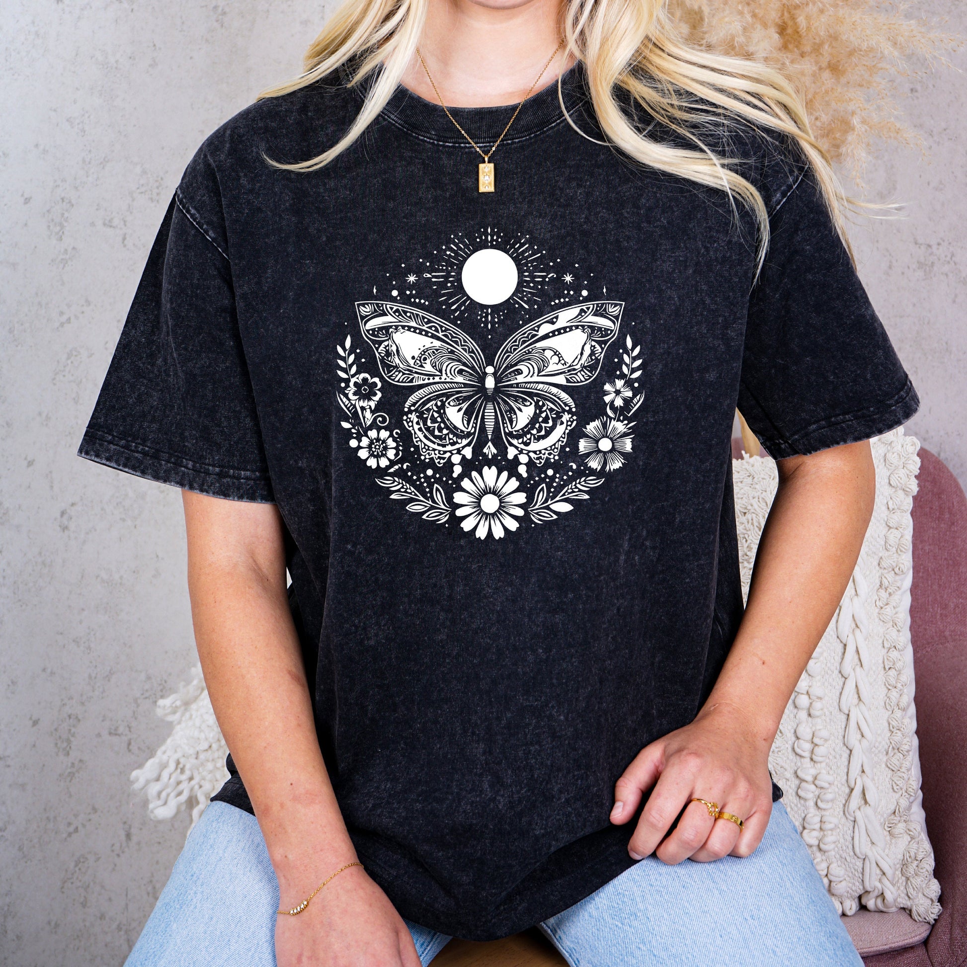 Butterfly & Flower Sunburst T-Shirt - Bold White Design, Acid Wash Aesthetic, Boho Shirts, Oversized Shirts, Wanderlust, Plant Girl