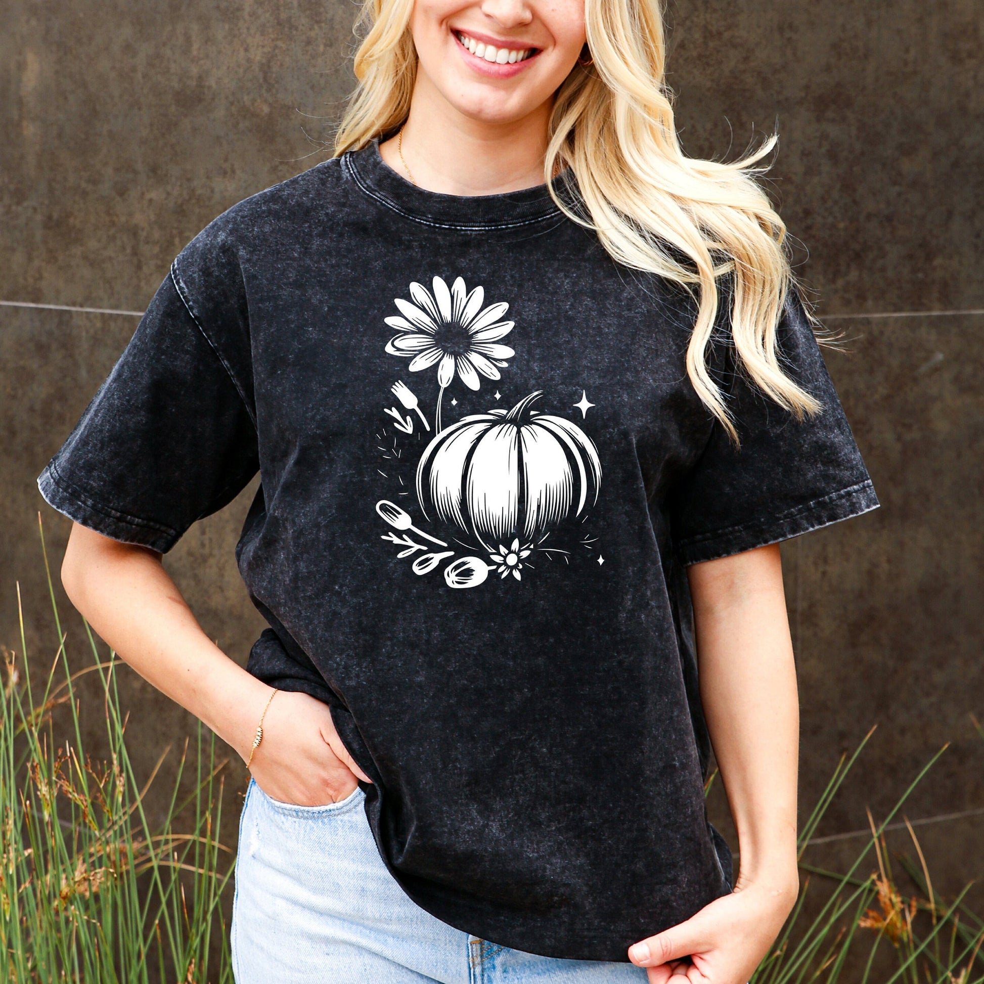 We're so excited to create something special for you with our new acid wash tee! Elevate your autumn style with our Pumpkin & Sunflower Boho Autumn Tee. This shirt showcases a charming pumpkin surrounded by flowers, with a large sunflower in the background, creating a captivating display of floral elegance perfect for autumn events and bohemian style enthusiasts.