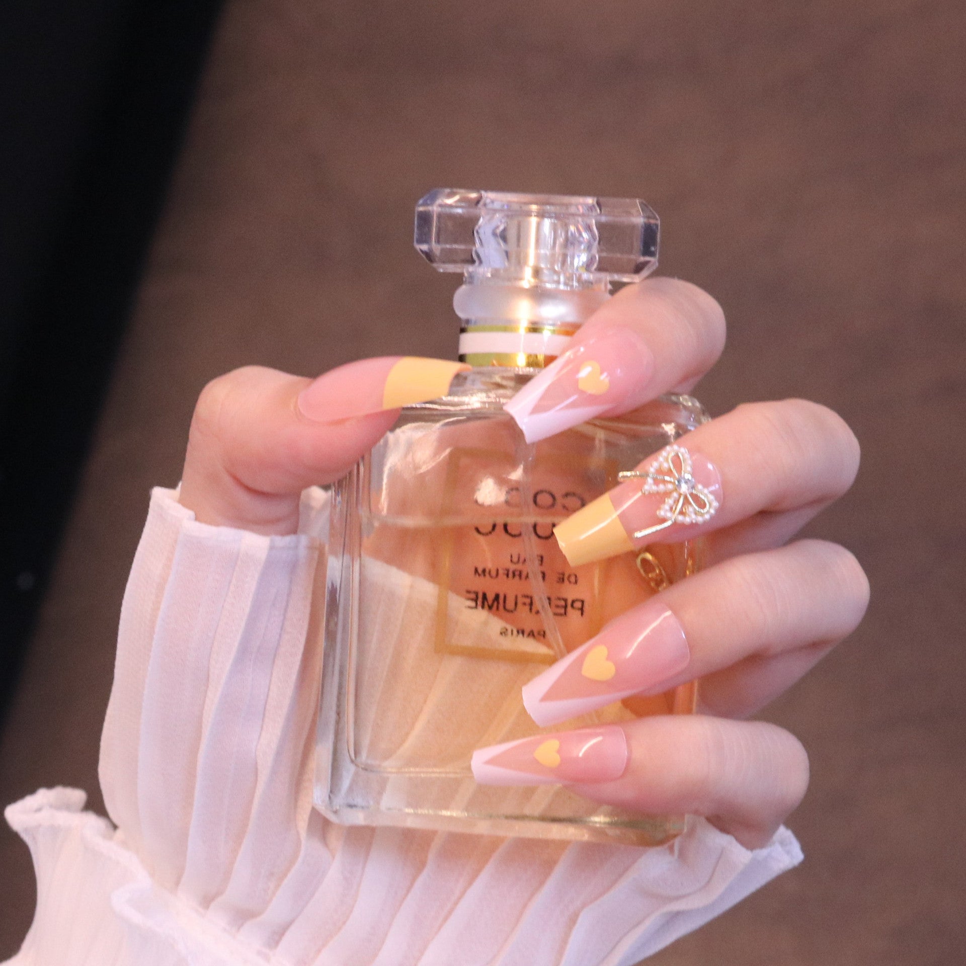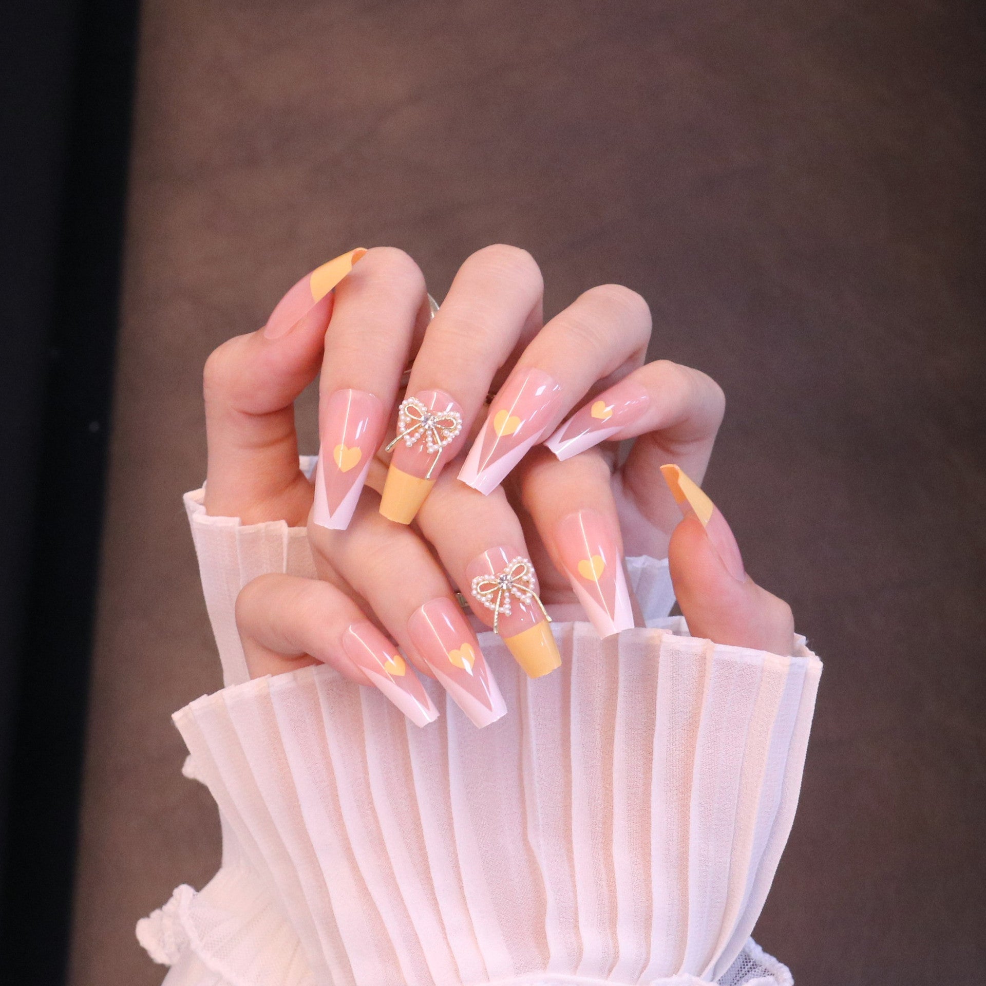 The Anna-Kaci press on nail details a?light yellow?shade?and a French tip. Features a 3D bow charm embellished with pearl beads and a?diamond-like crystal in the?center.?