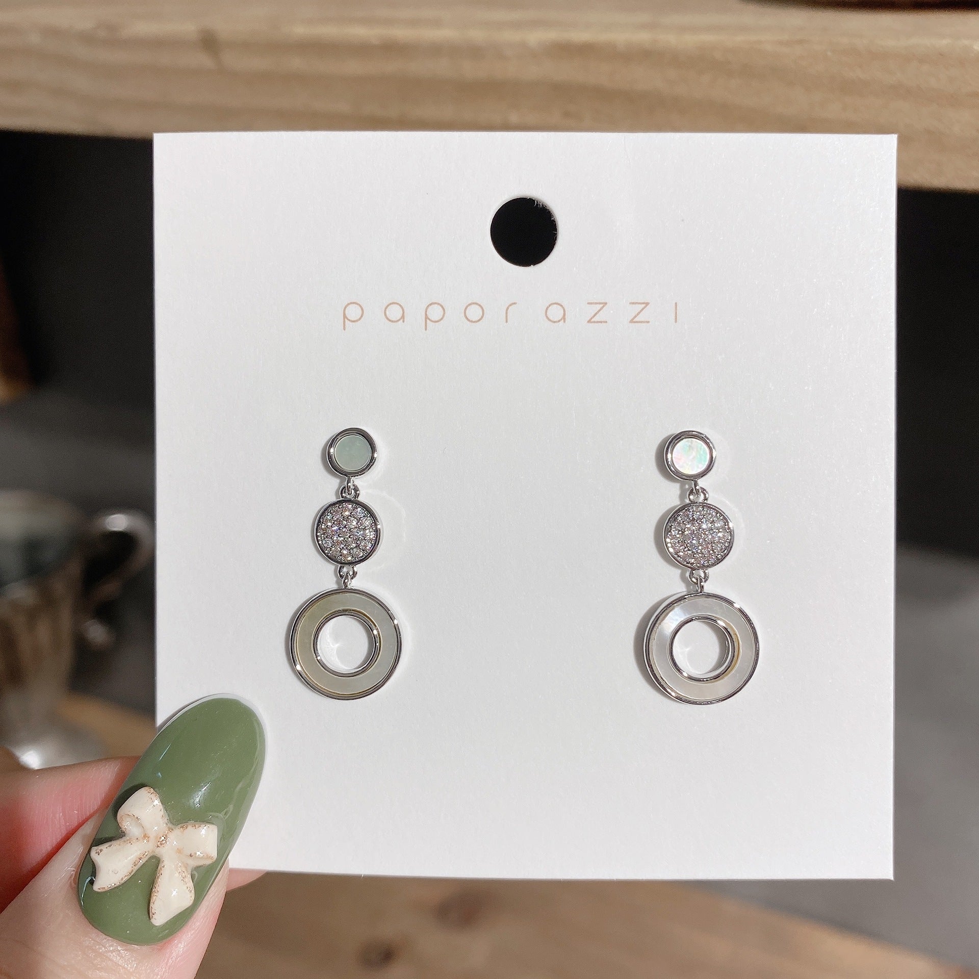 The Anna-Kaci earring details a triple circle design with different unique layers. The top and bottom features an iridescent stone while the middle layer is embellished with diamond-like crystals.