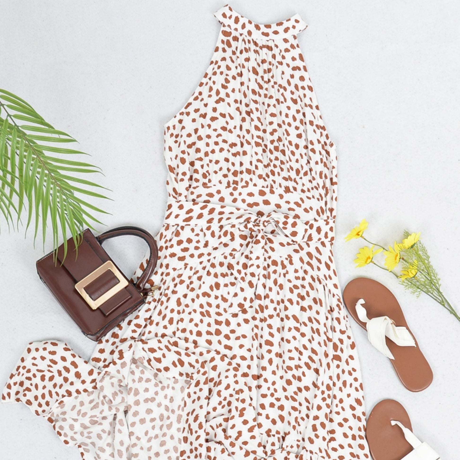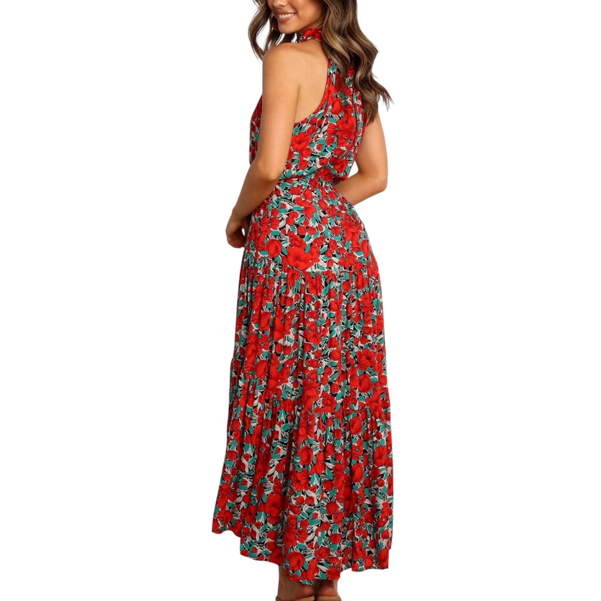 Halter Neck Floral Maxi Dress with Waist Tie and Flowing Skirt