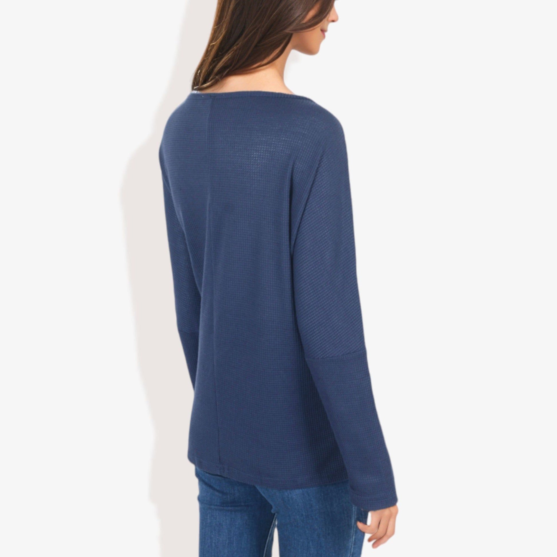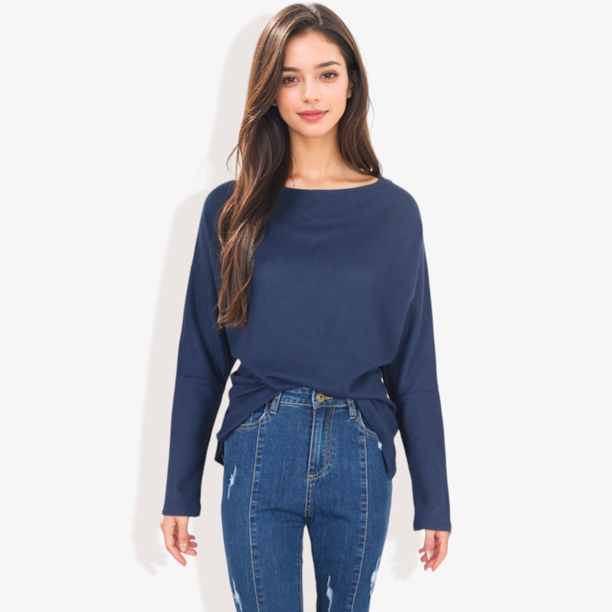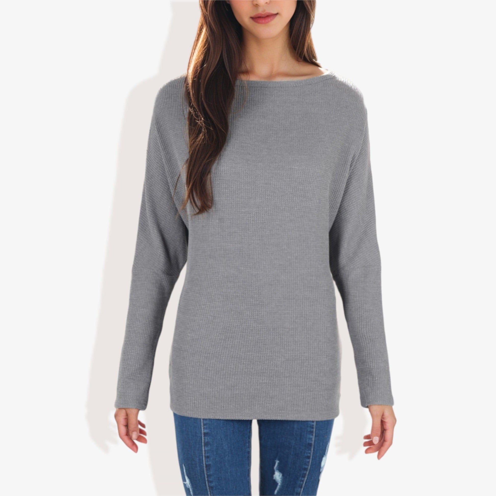 Open Neck Waffle Knit Dolman Sleeve Side Slit Tunic Pullover