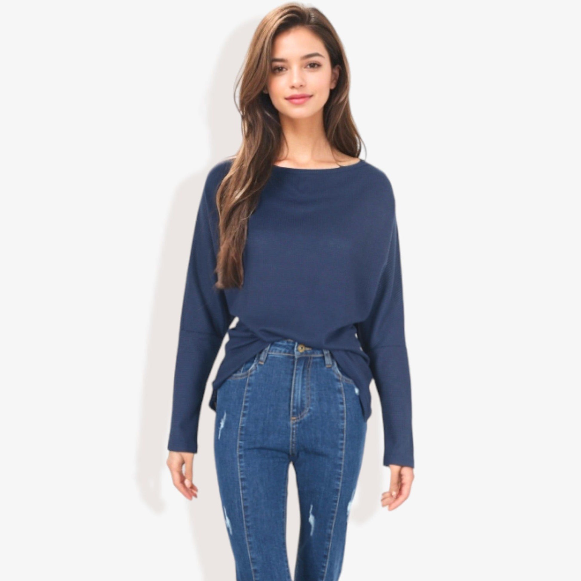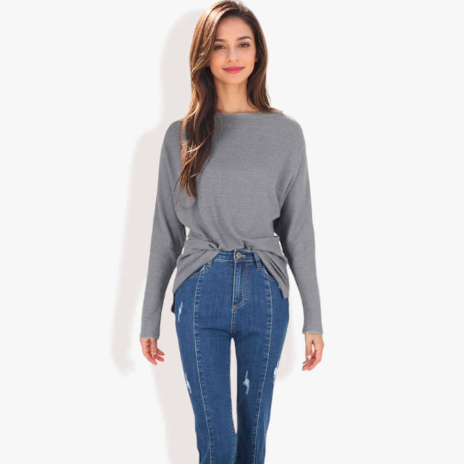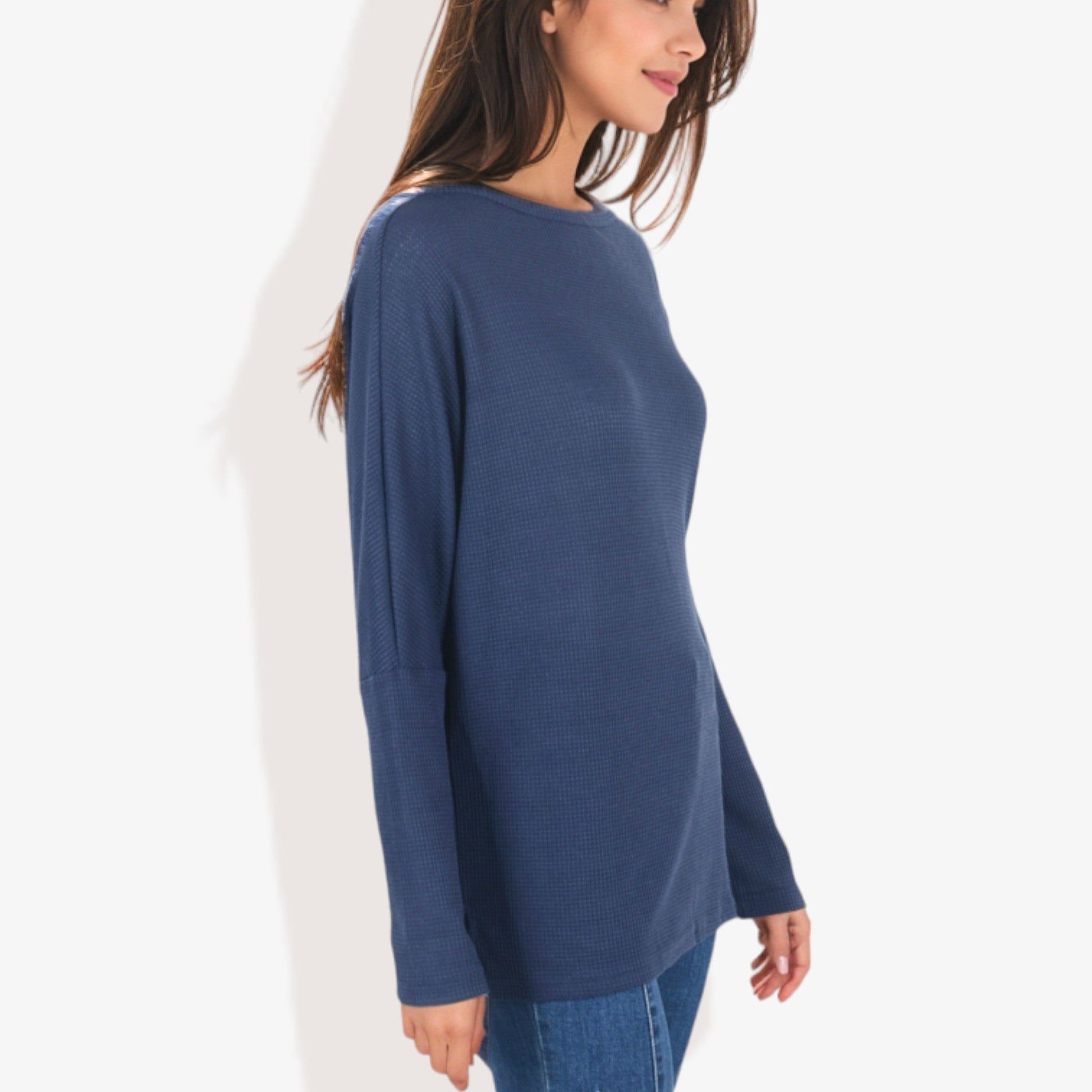 Open Neck Waffle Knit Dolman Sleeve Side Slit Tunic Pullover