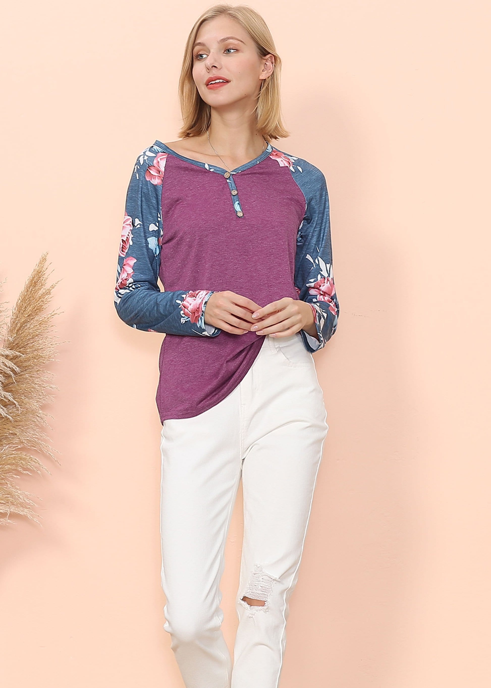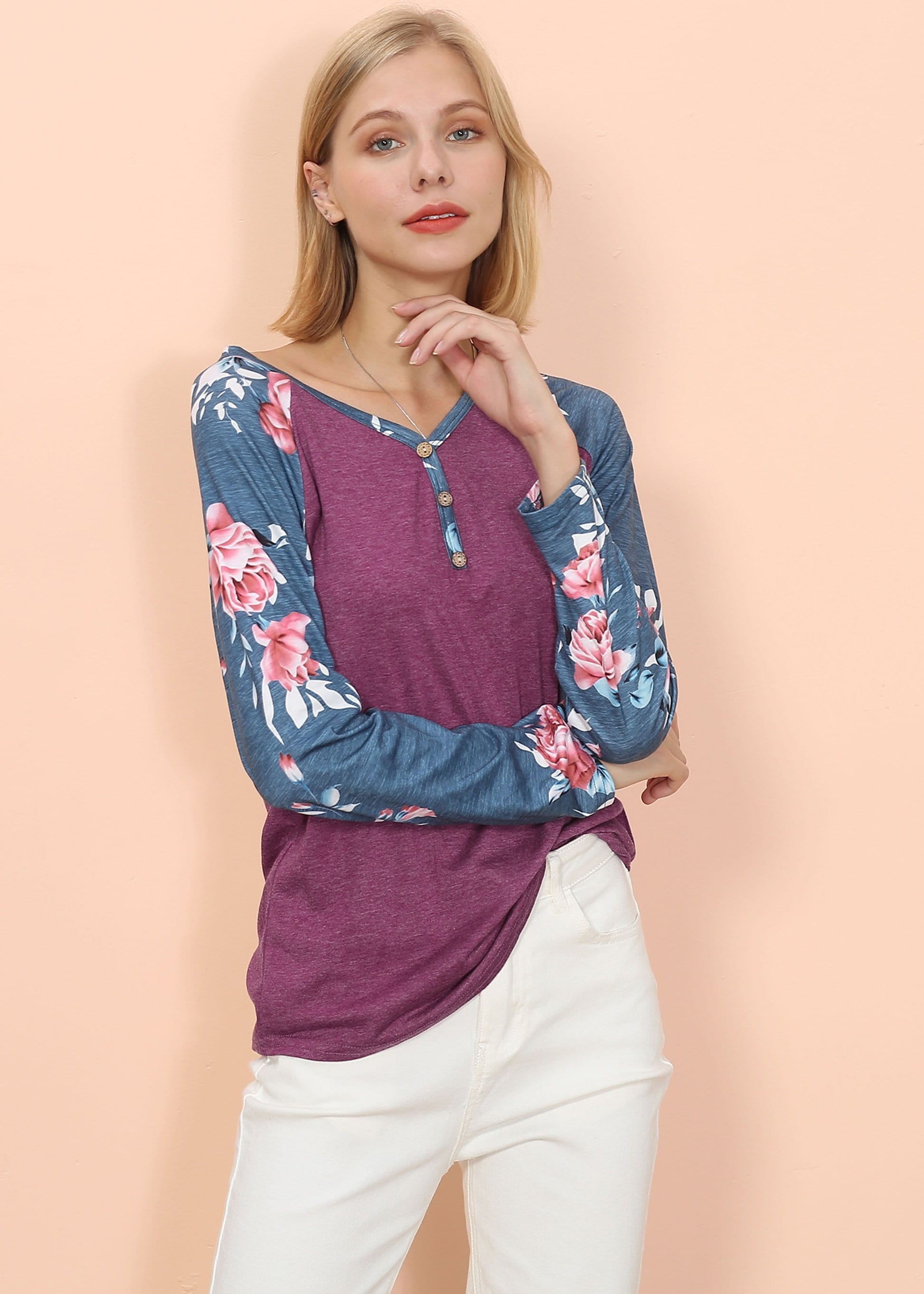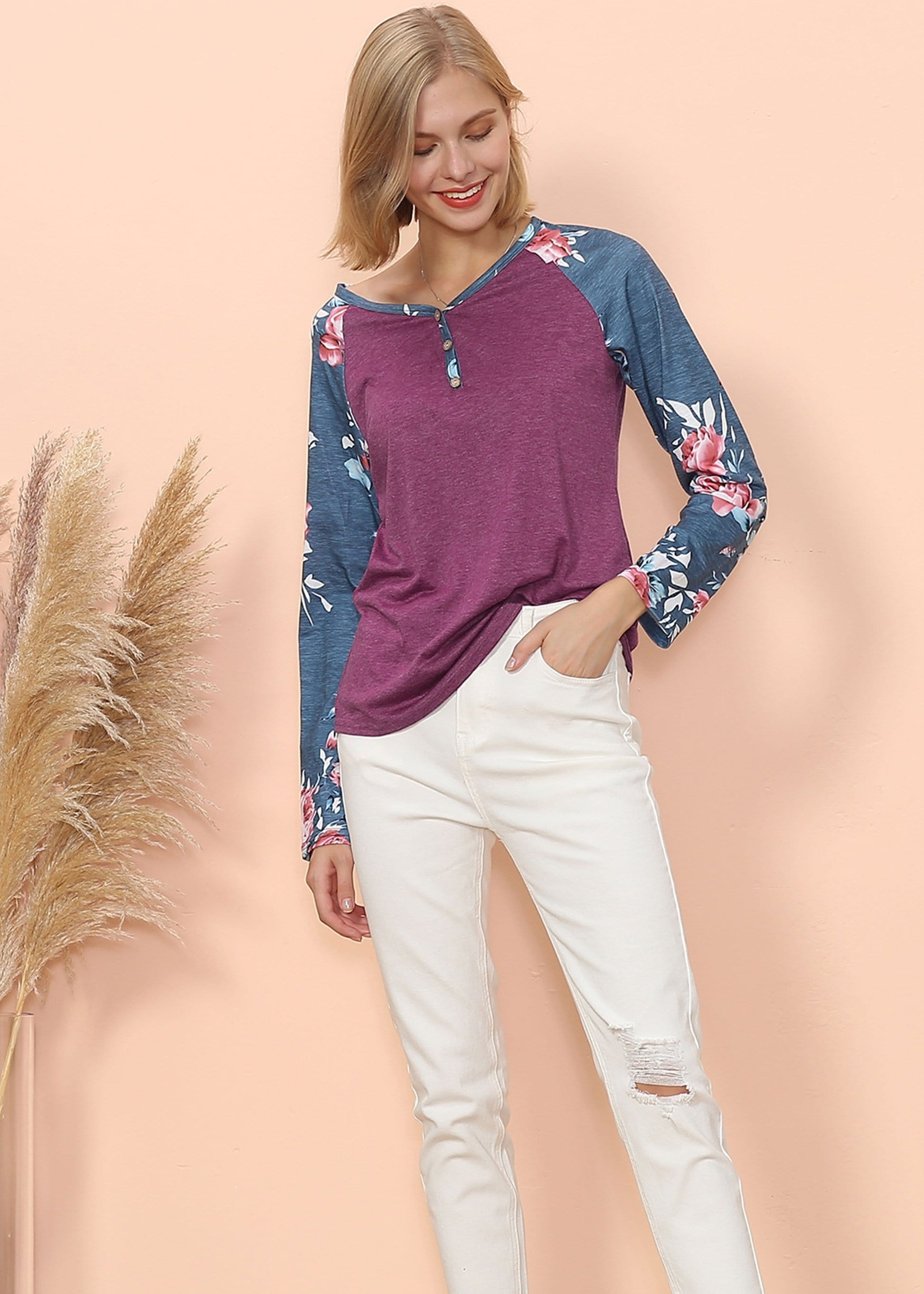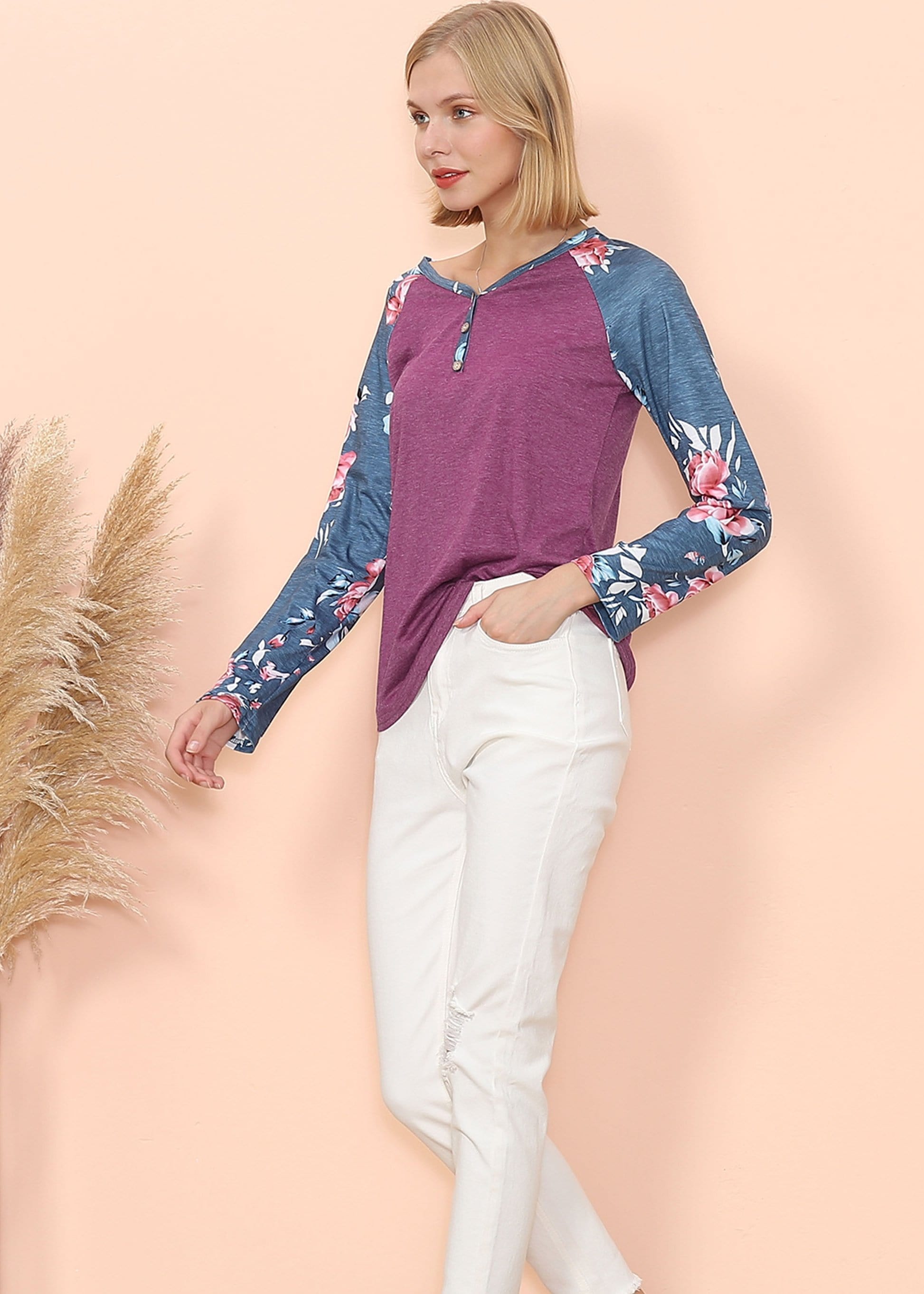 The Anna-Kaci long sleeve is detailed with gorgeous floral print patterns that add that soft and welcoming pop of style. Detailed with 3 button up Henley design, straight long sleeves, and a relaxed fit. Pair it with your favorite denim jeans for an easy go-to fall and winter look.