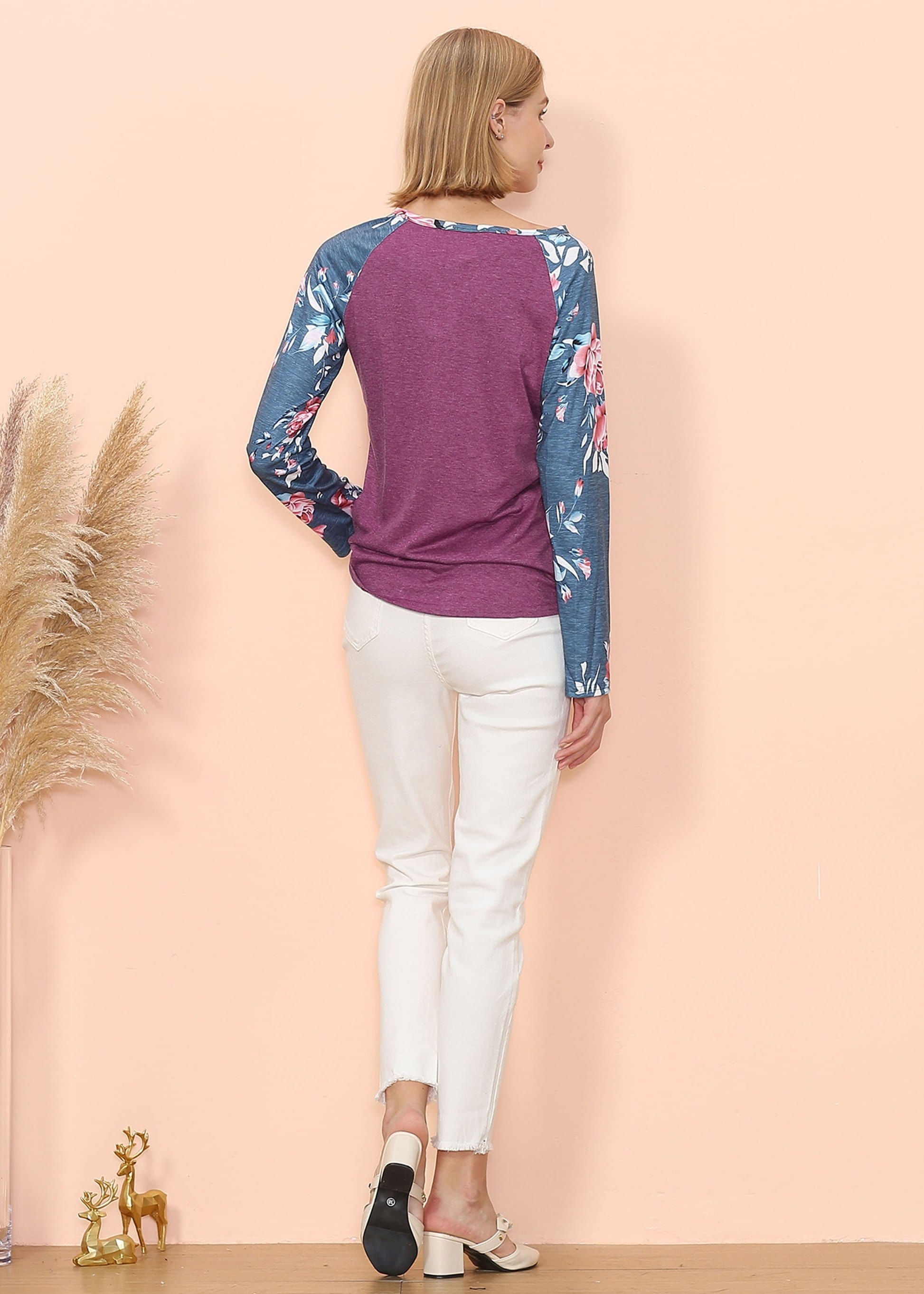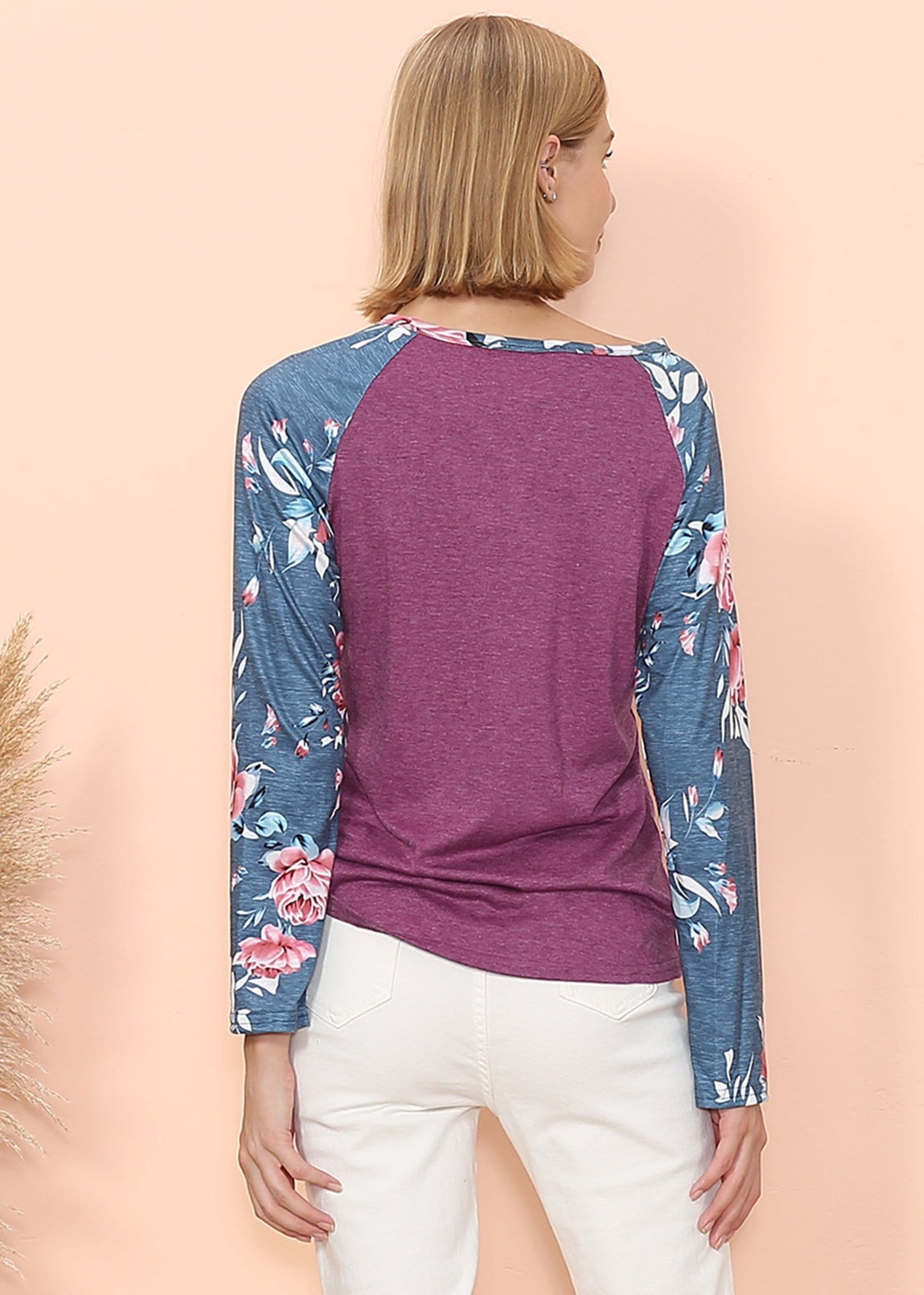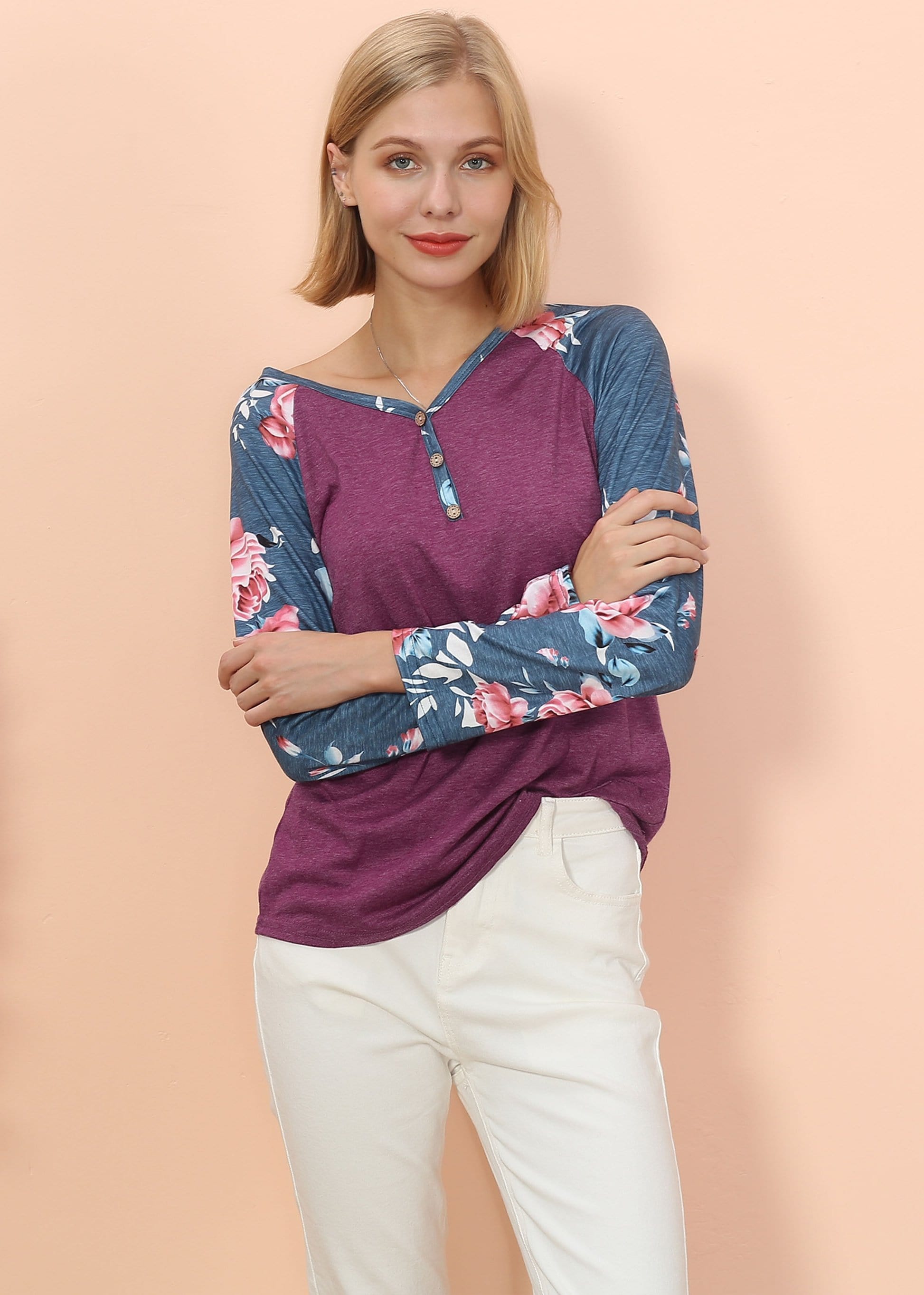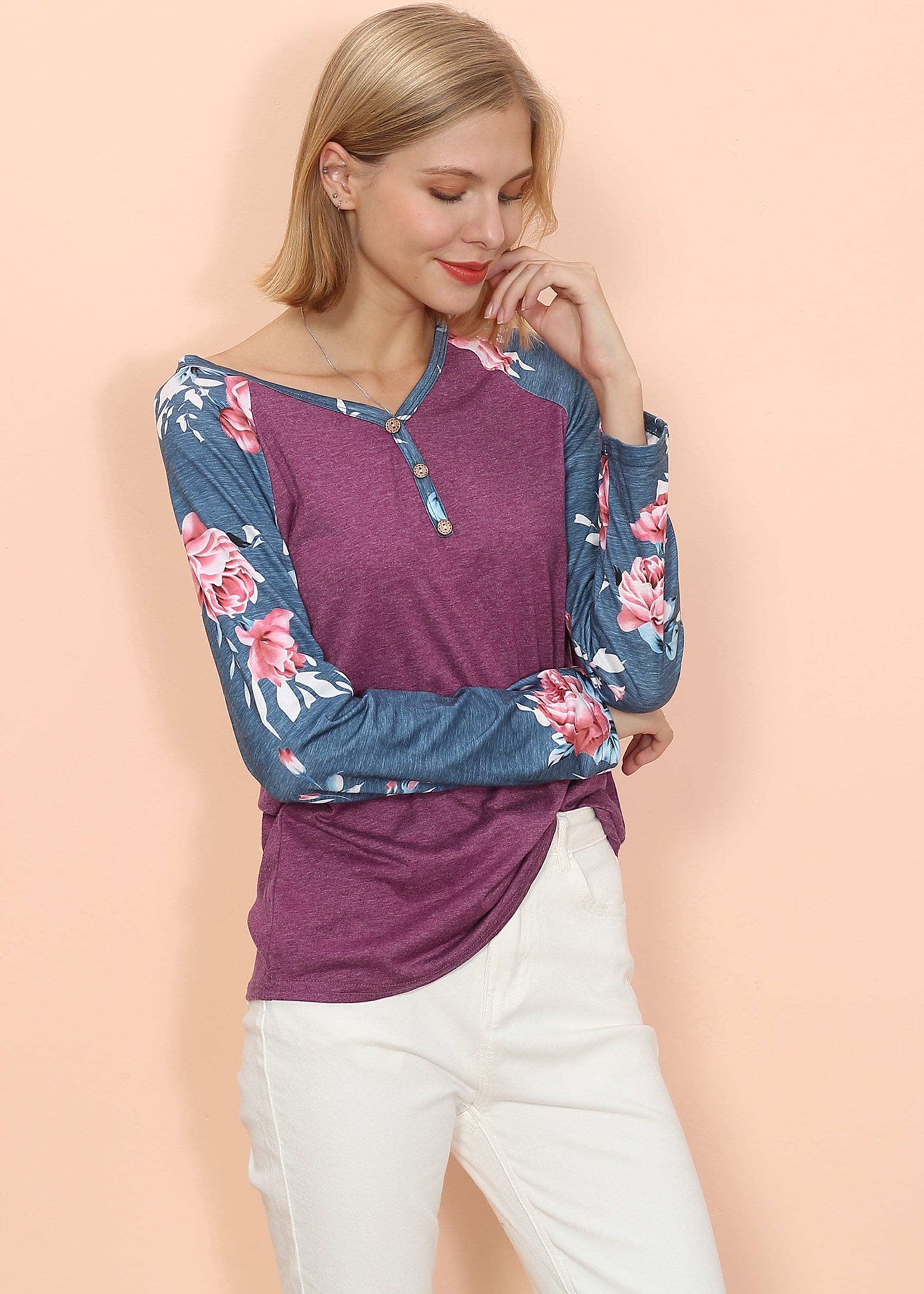 The Anna-Kaci long sleeve is detailed with gorgeous floral print patterns that add that soft and welcoming pop of style. Detailed with 3 button up Henley design, straight long sleeves, and a relaxed fit. Pair it with your favorite denim jeans for an easy go-to fall and winter look.