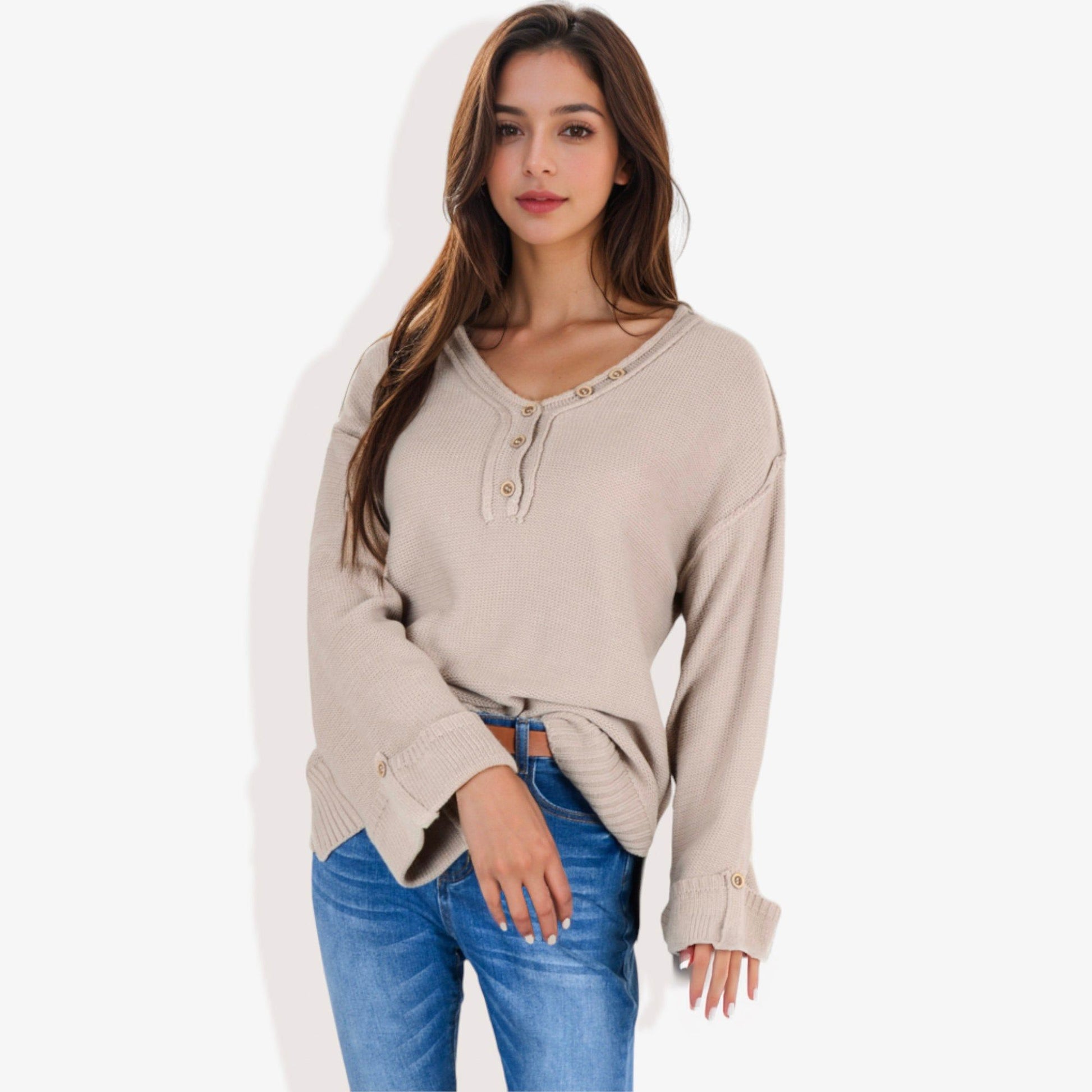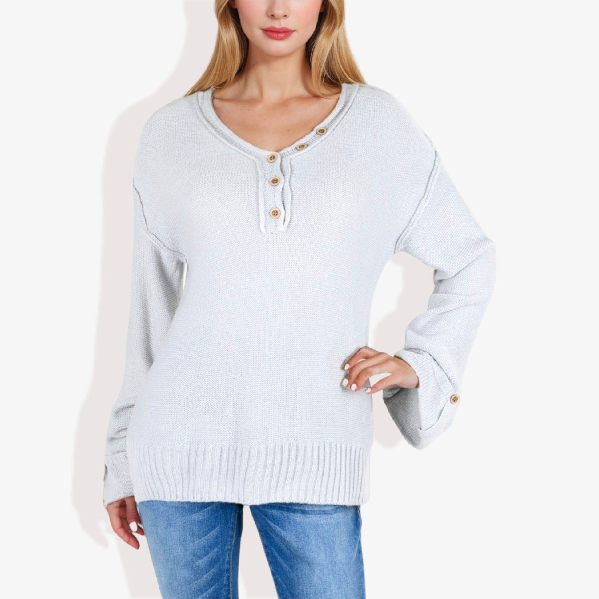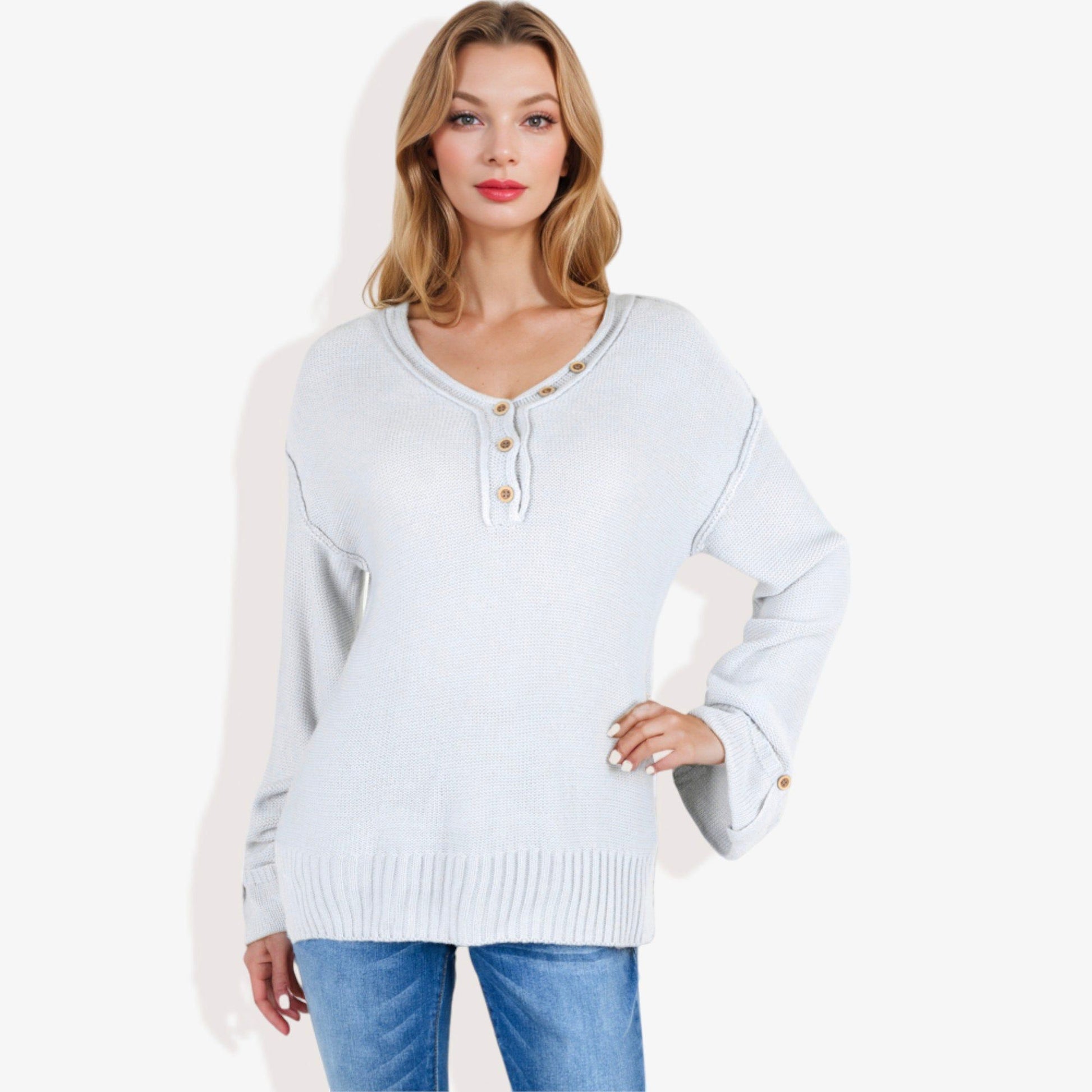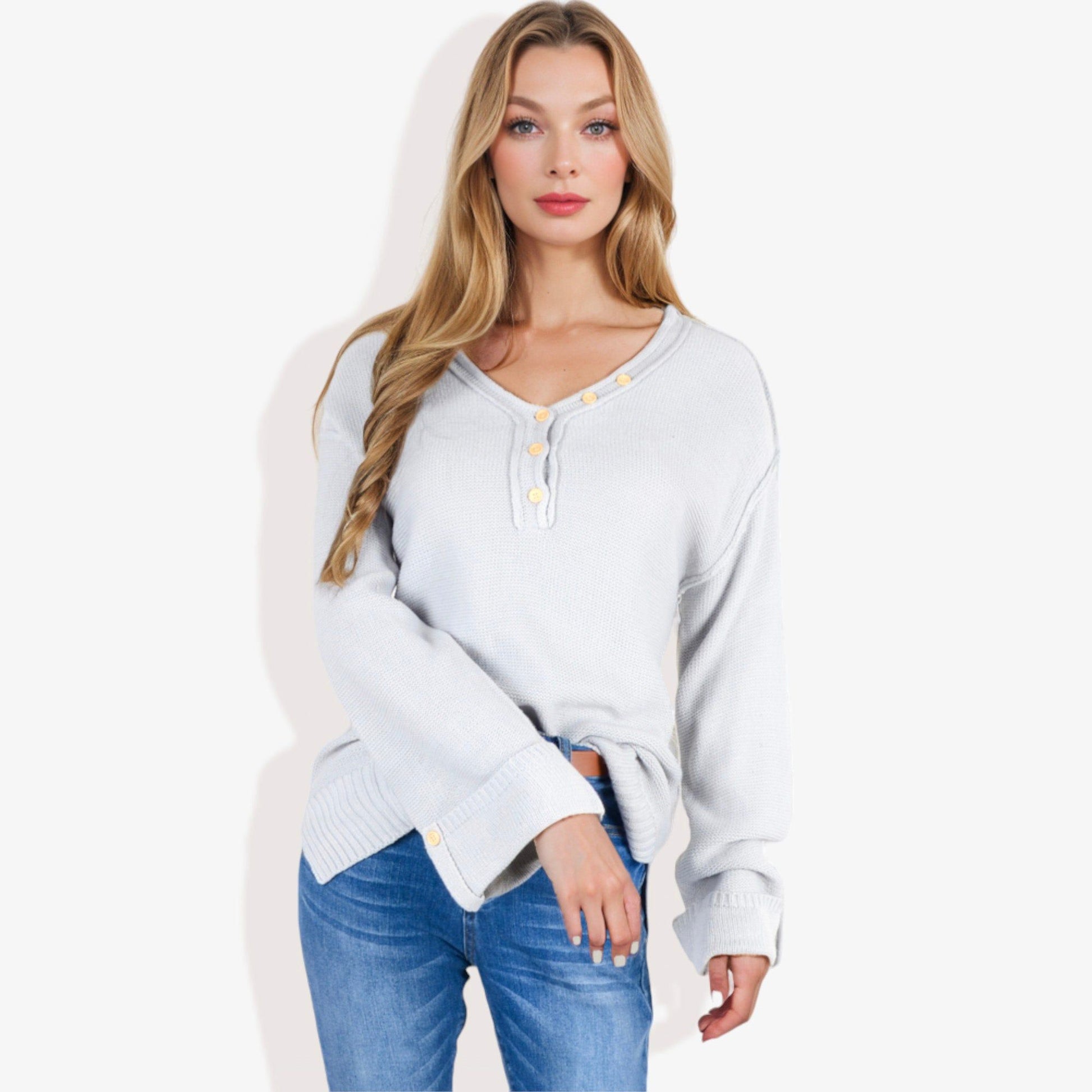 Long Sleeve V-Neck Henley Knit Sweater with Button Details