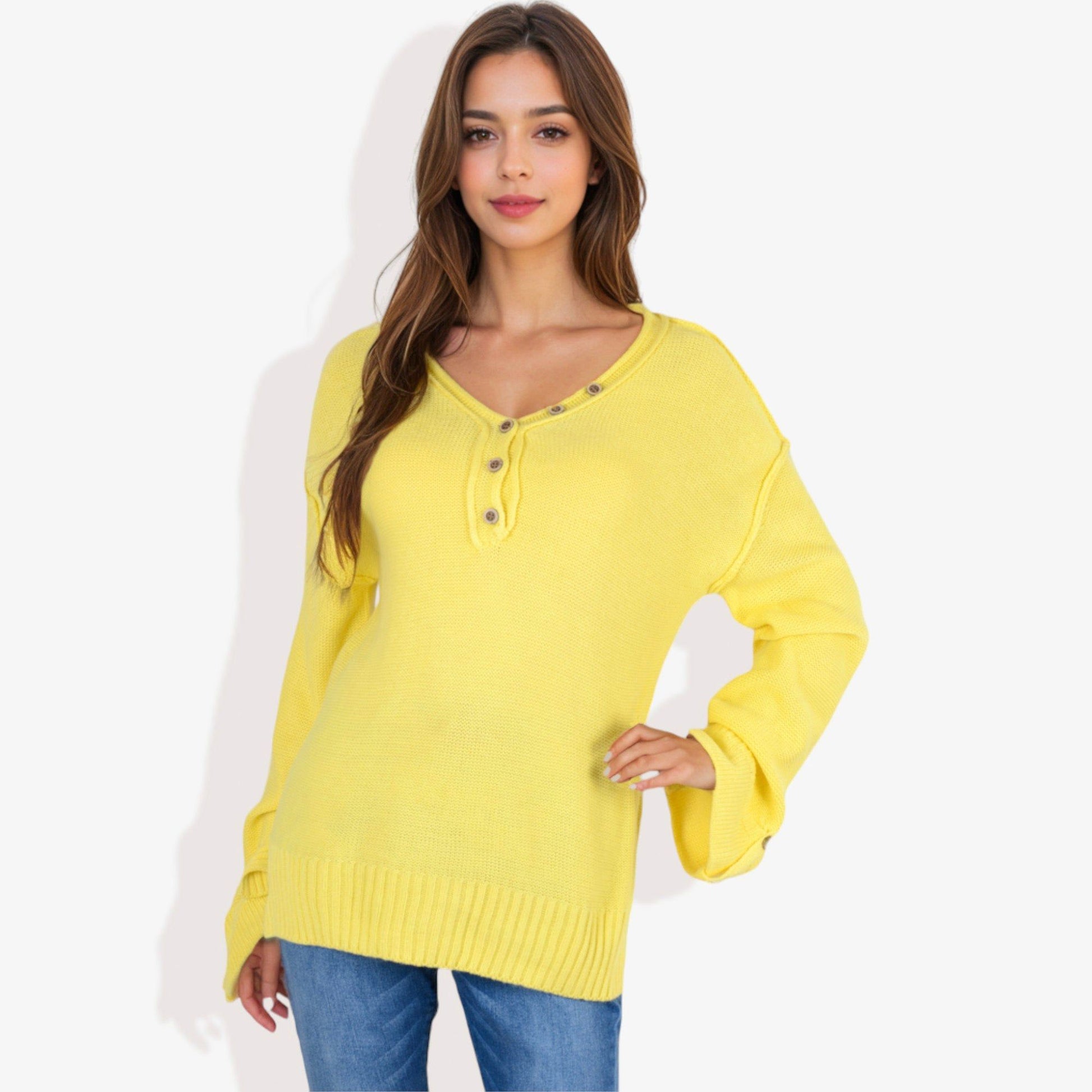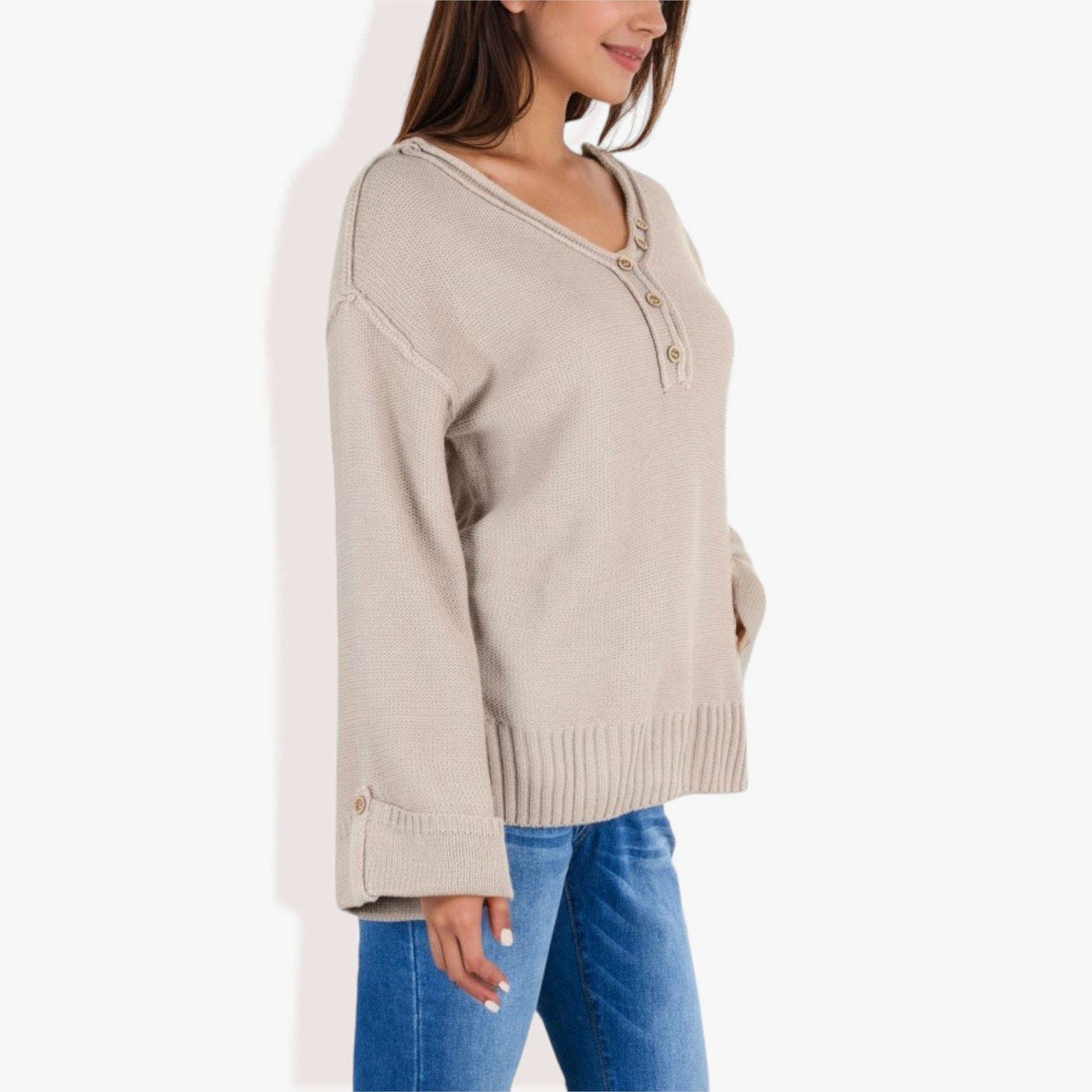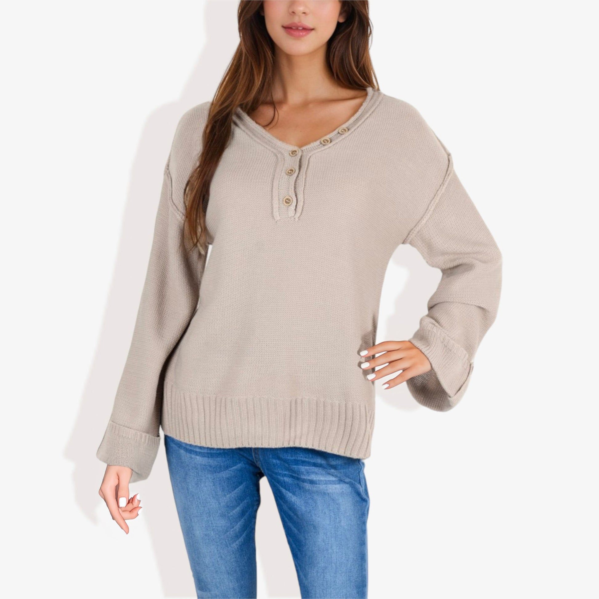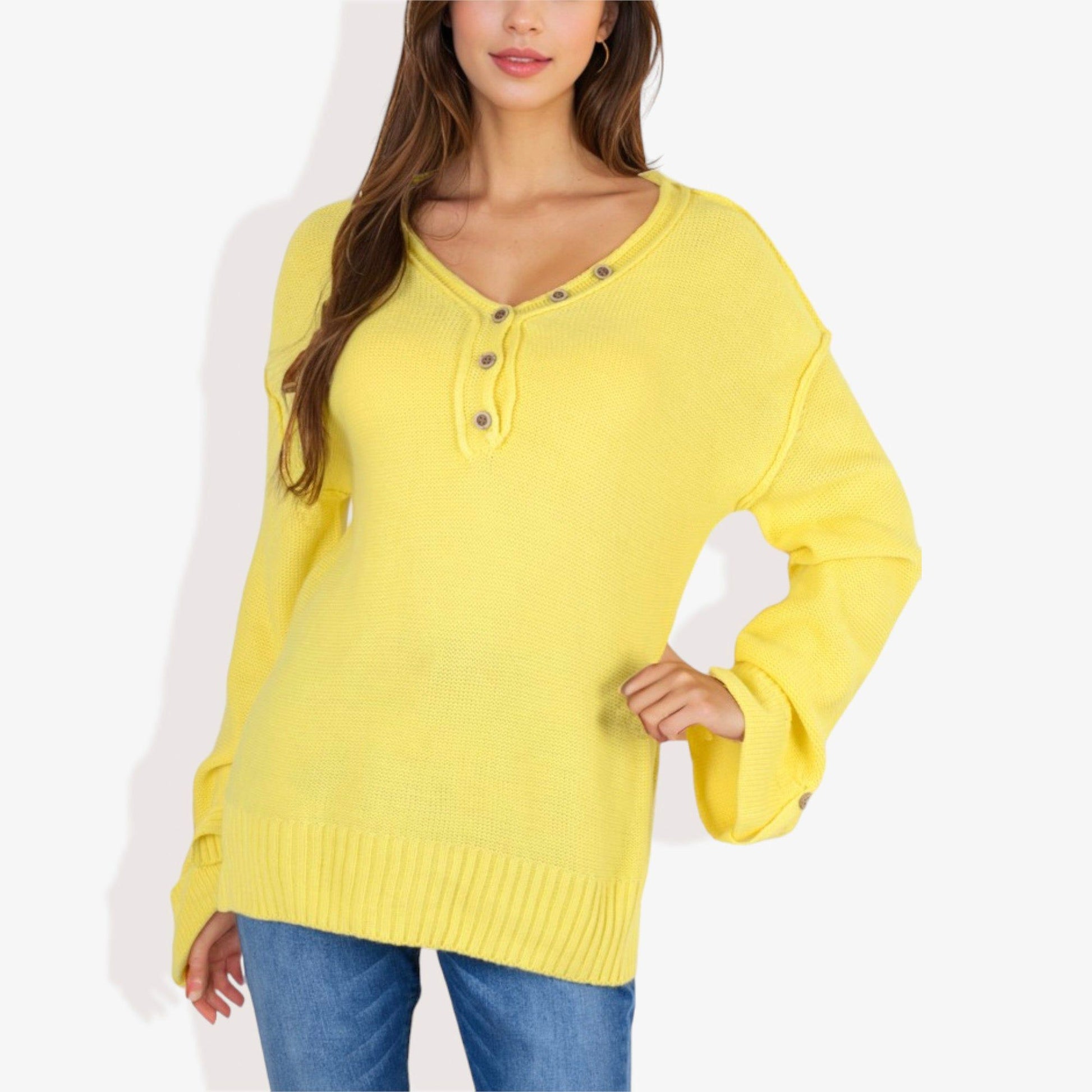 Long Sleeve V-Neck Henley Knit Sweater with Button Details