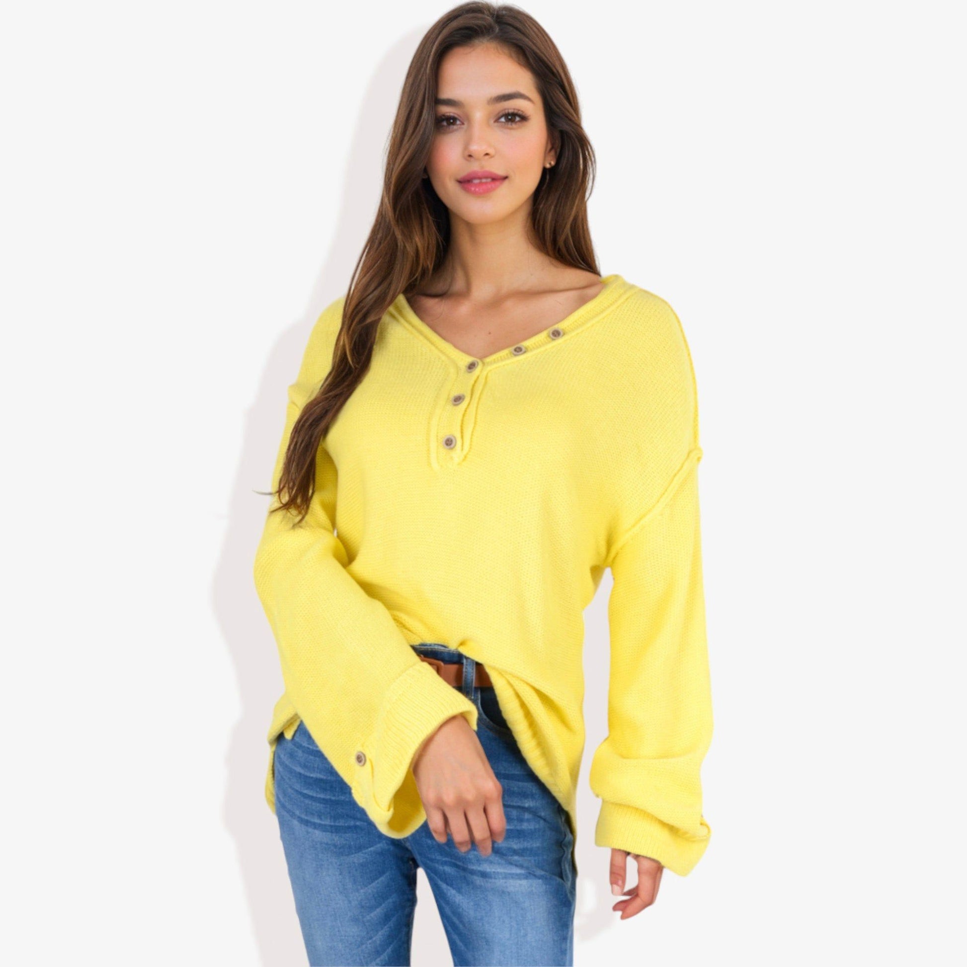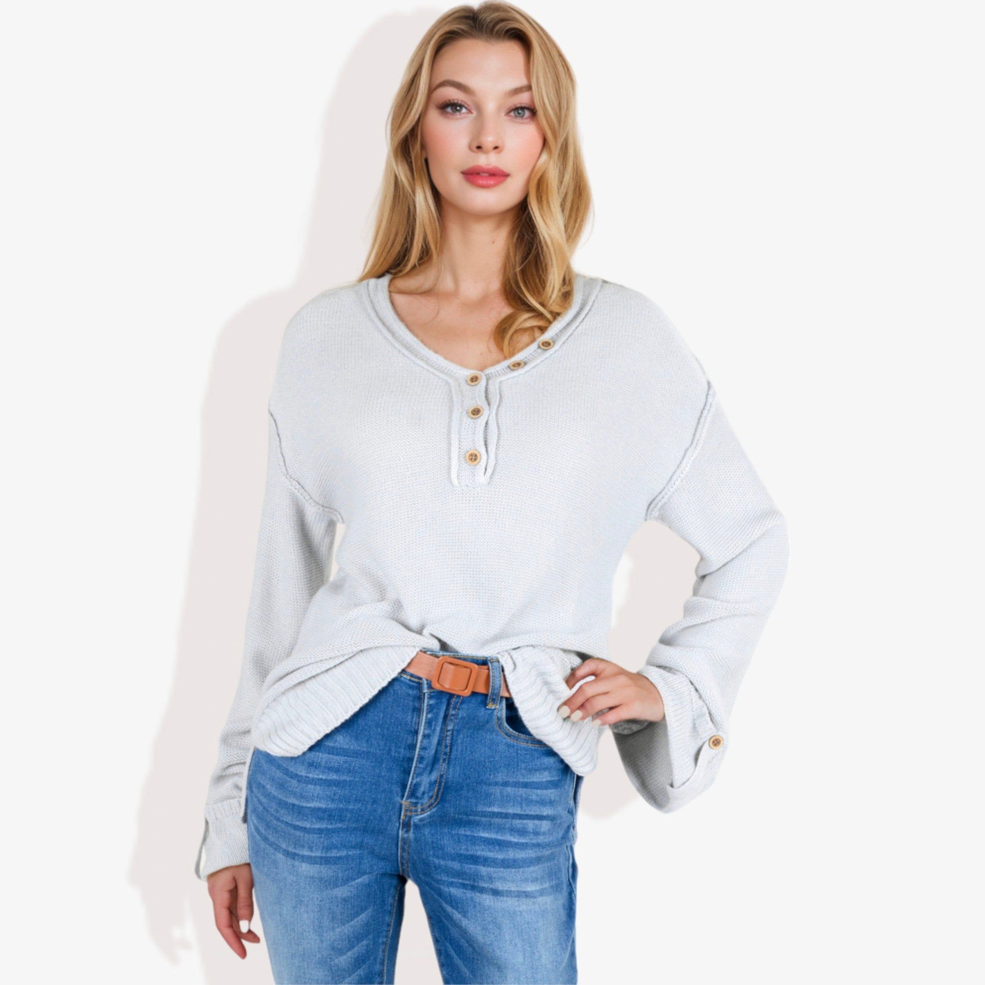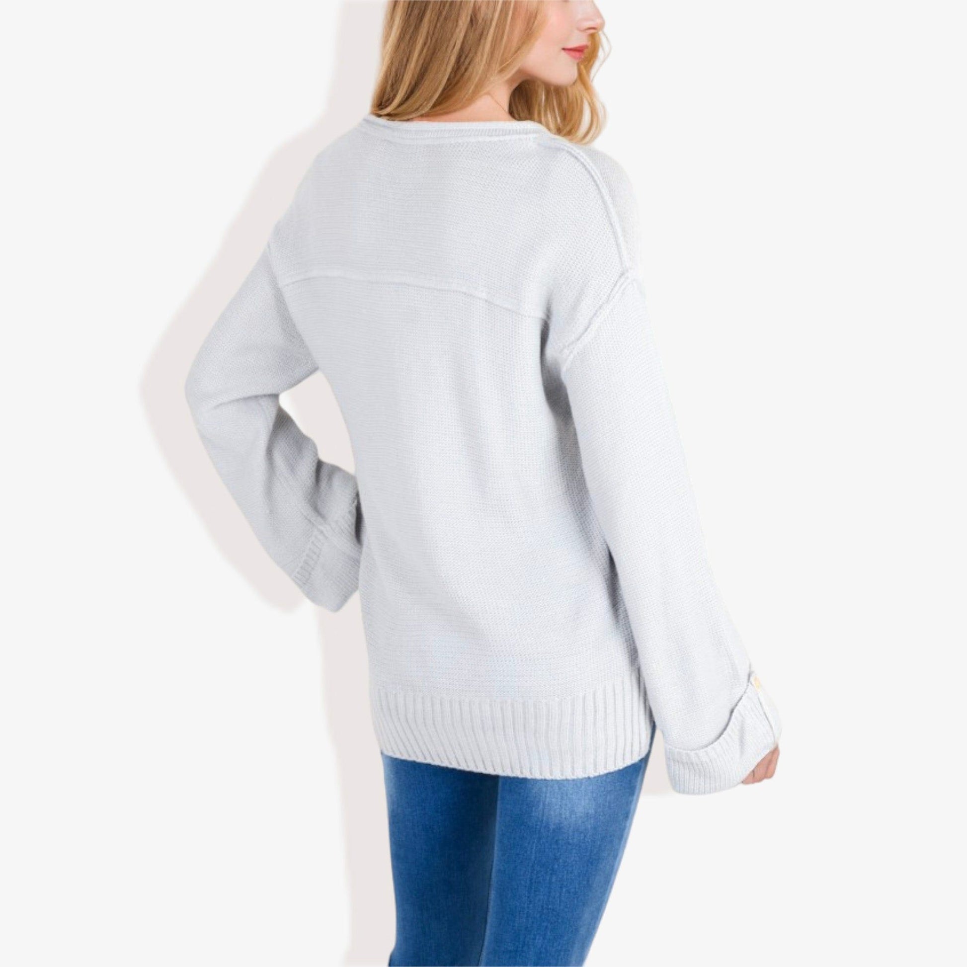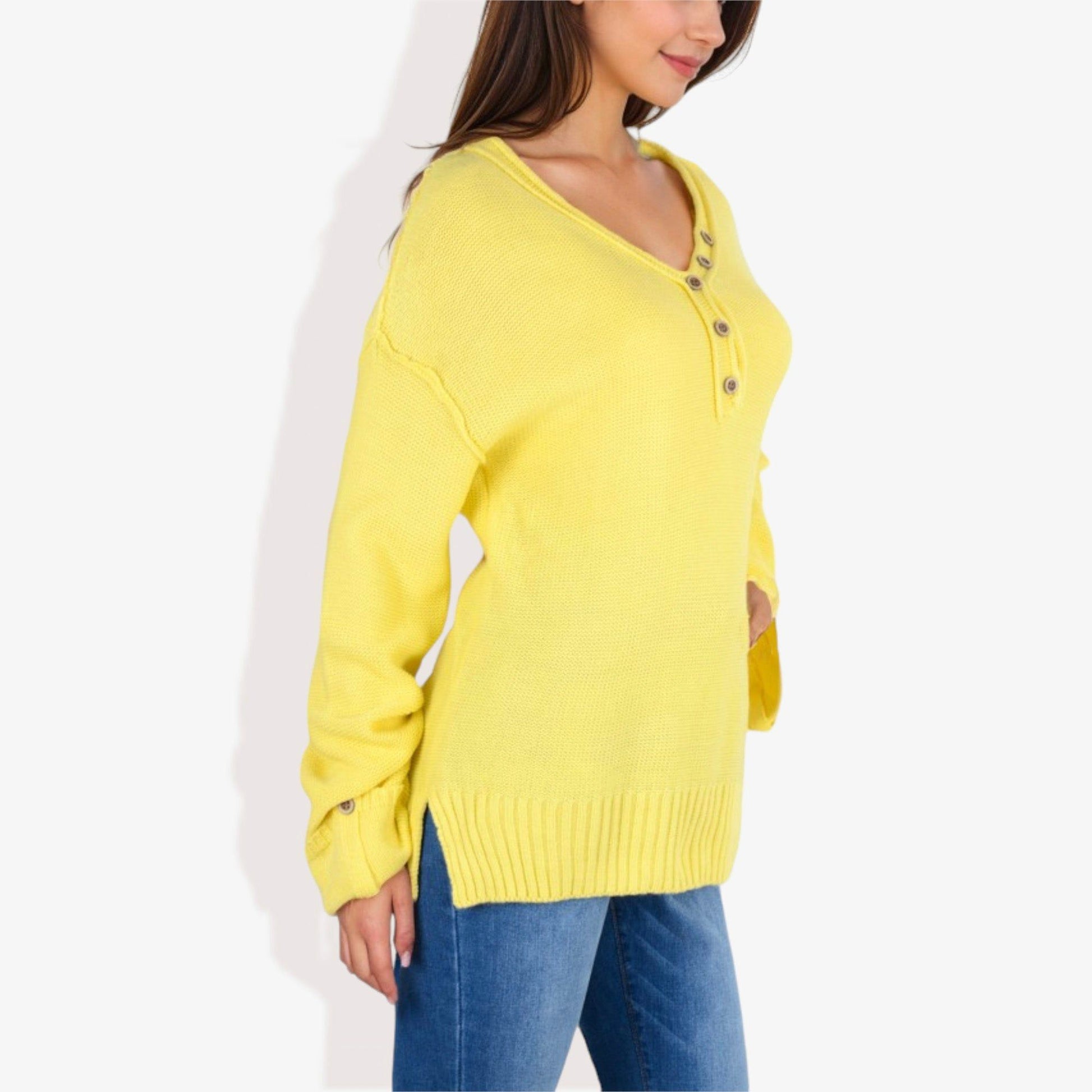 Long Sleeve V-Neck Henley Knit Sweater with Button Details