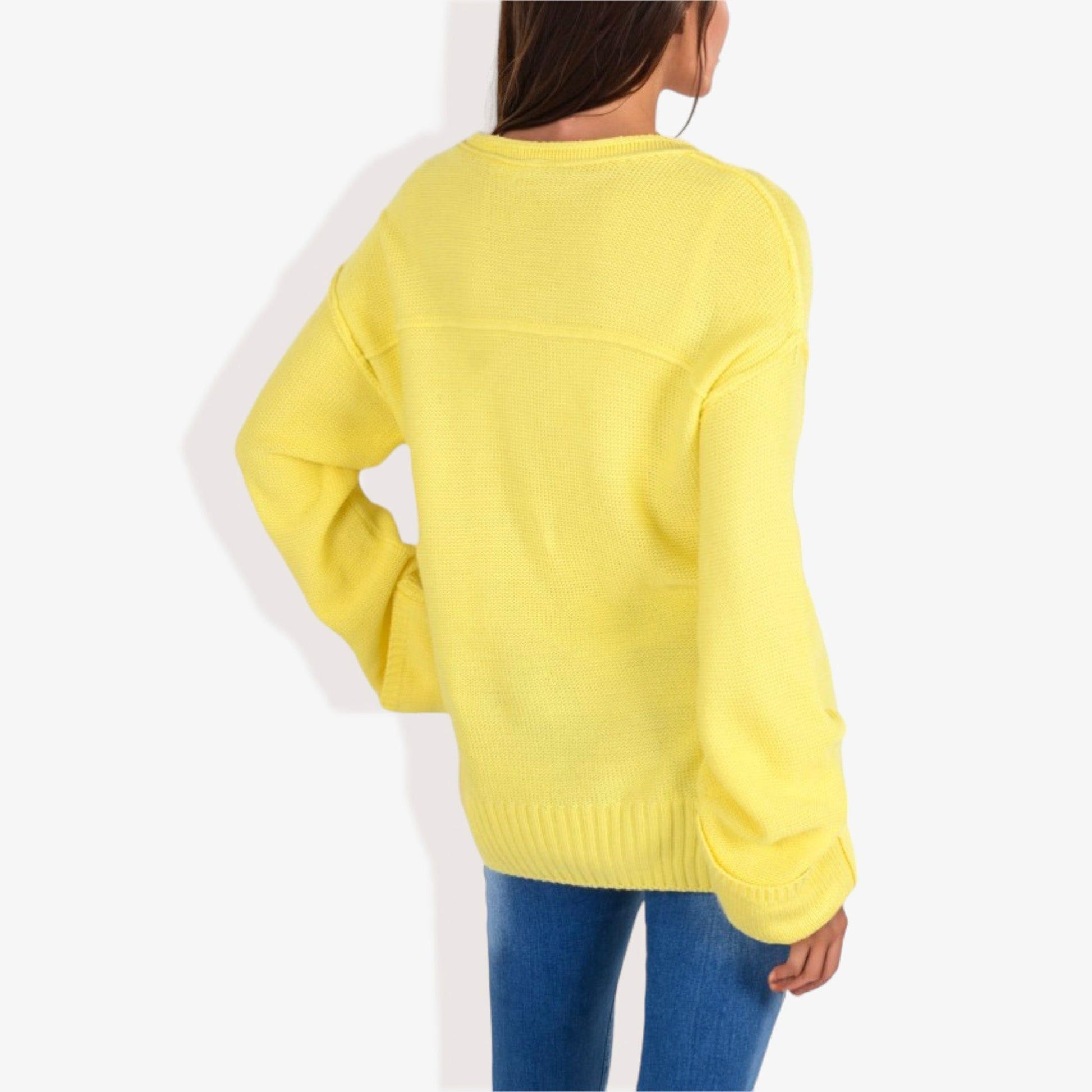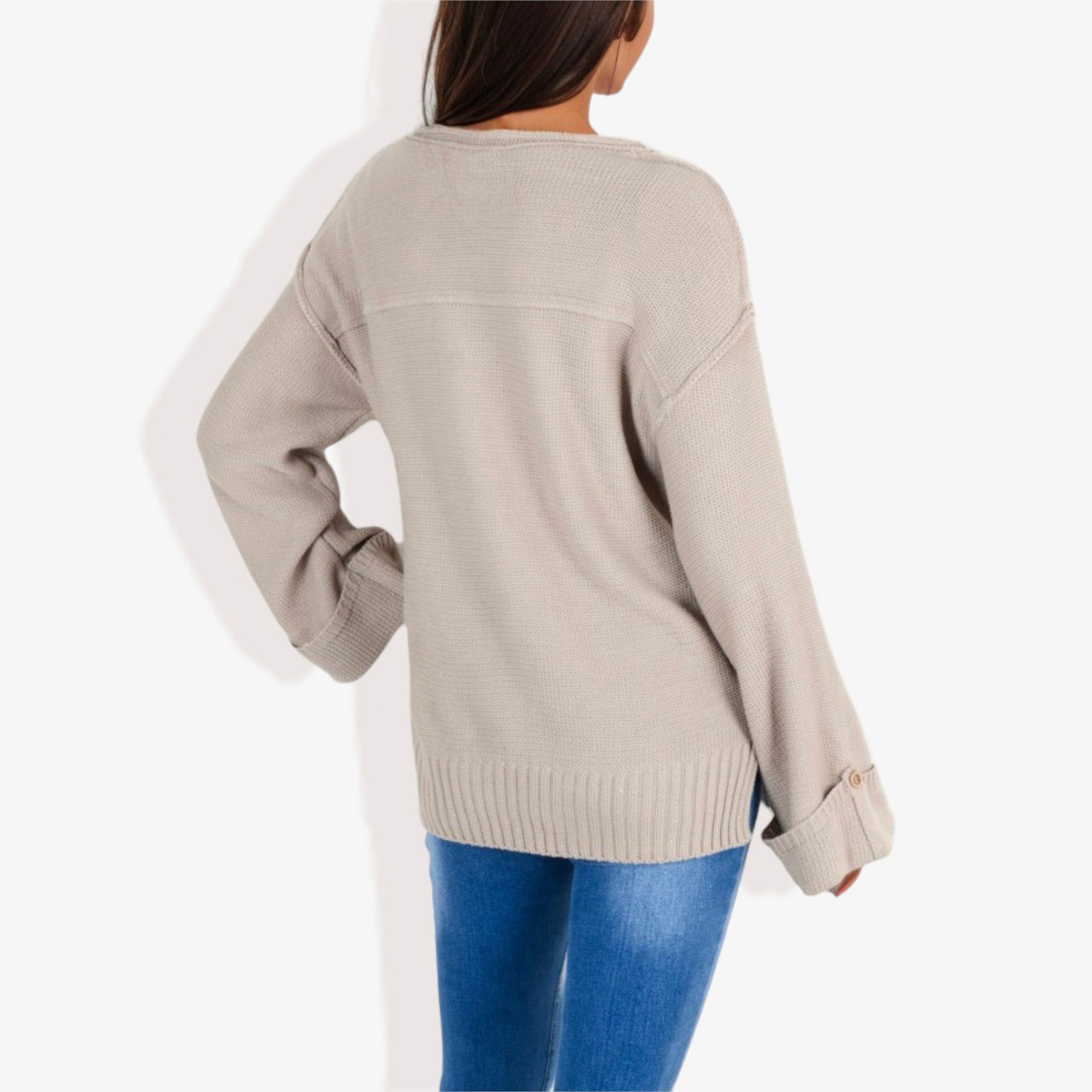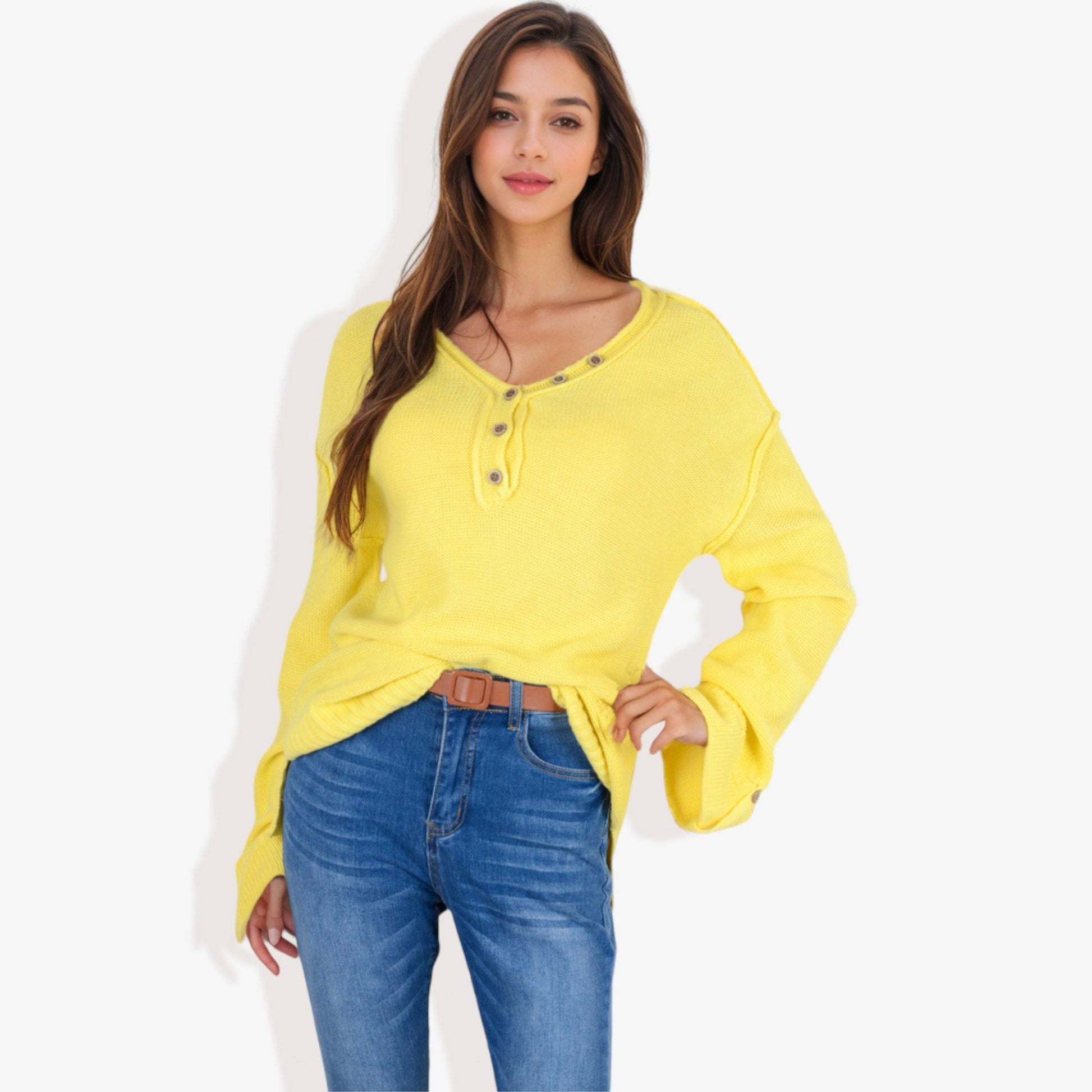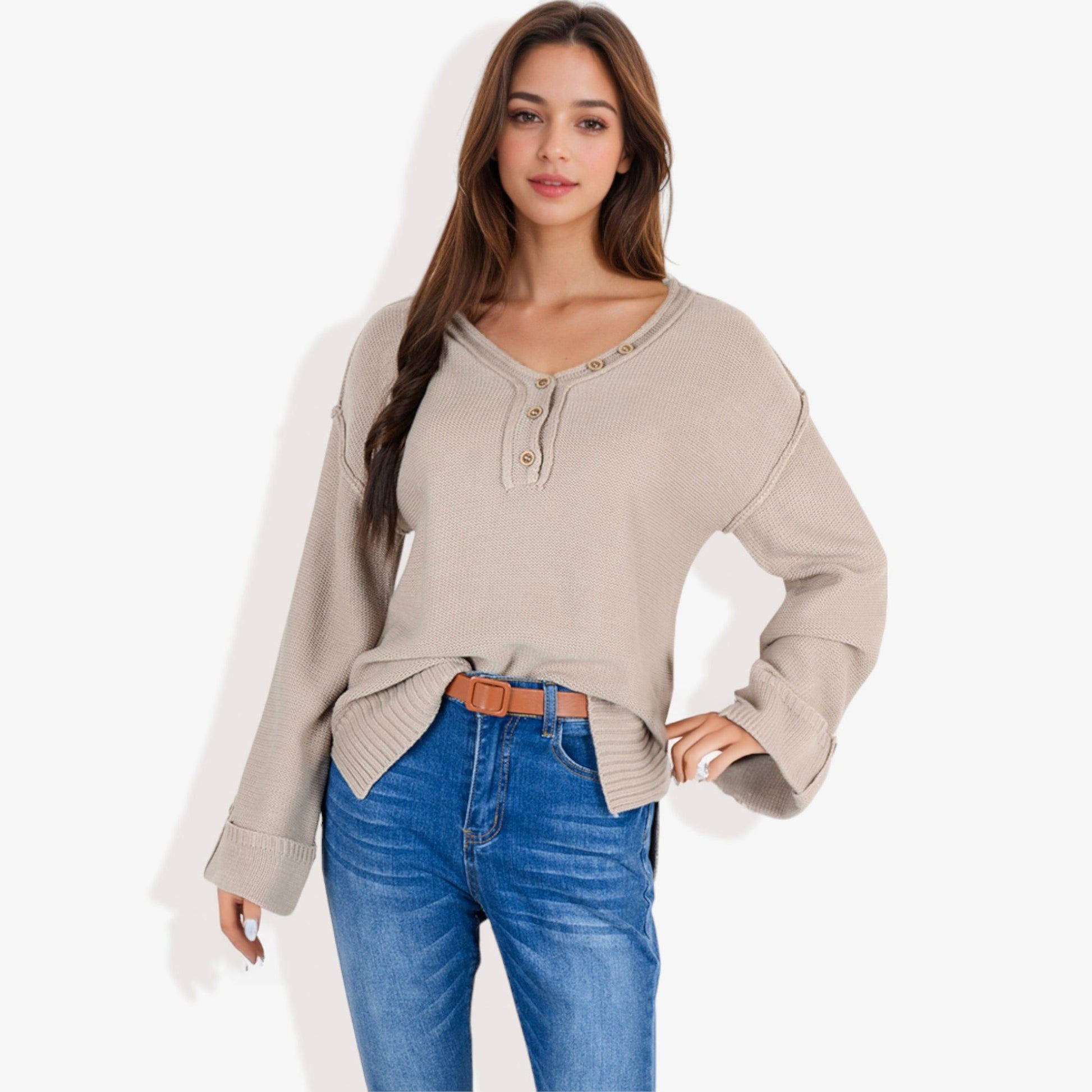 Long Sleeve V-Neck Henley Knit Sweater with Button Details