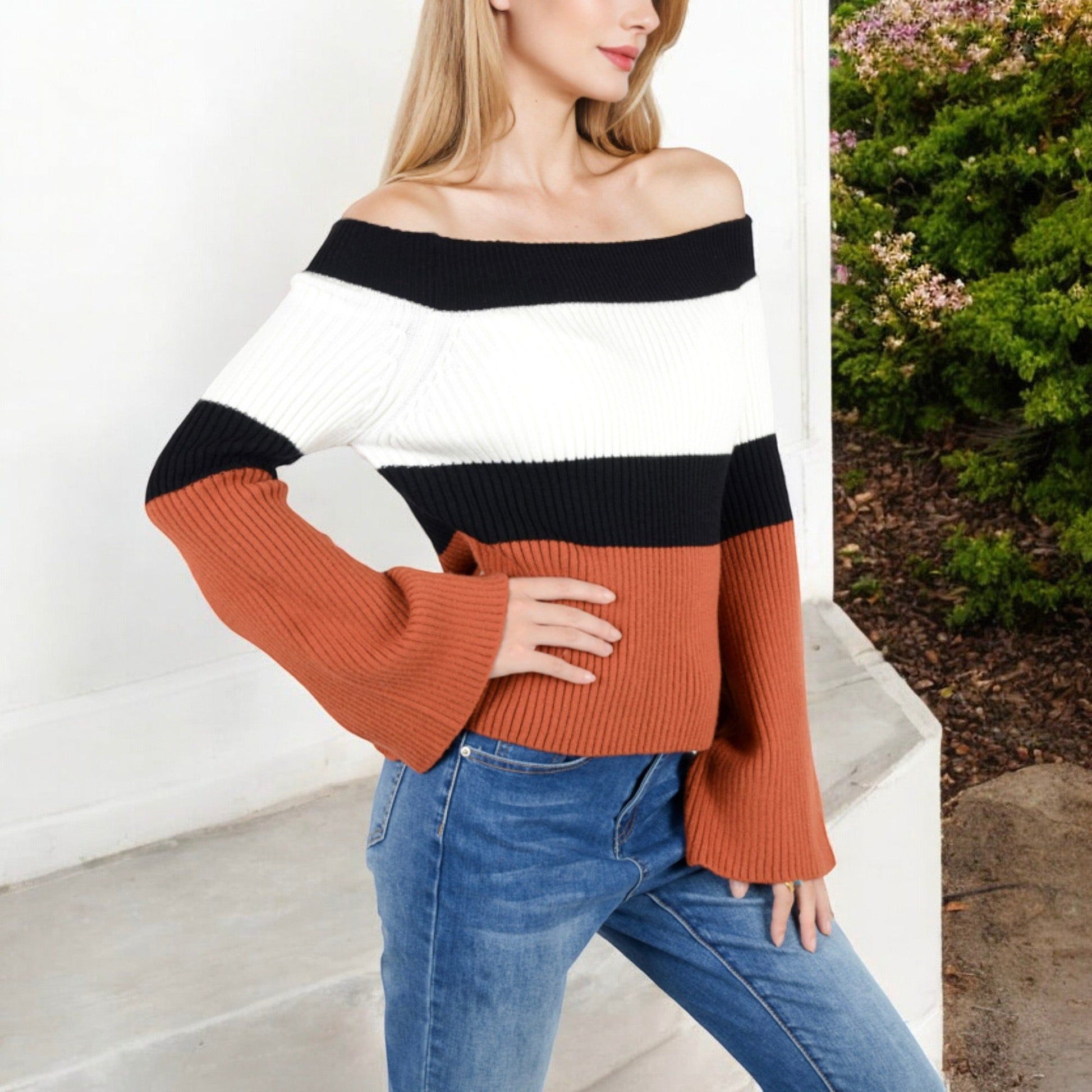 Off-Shoulder Ribbed Sweater with Color Block Flared Sleeves