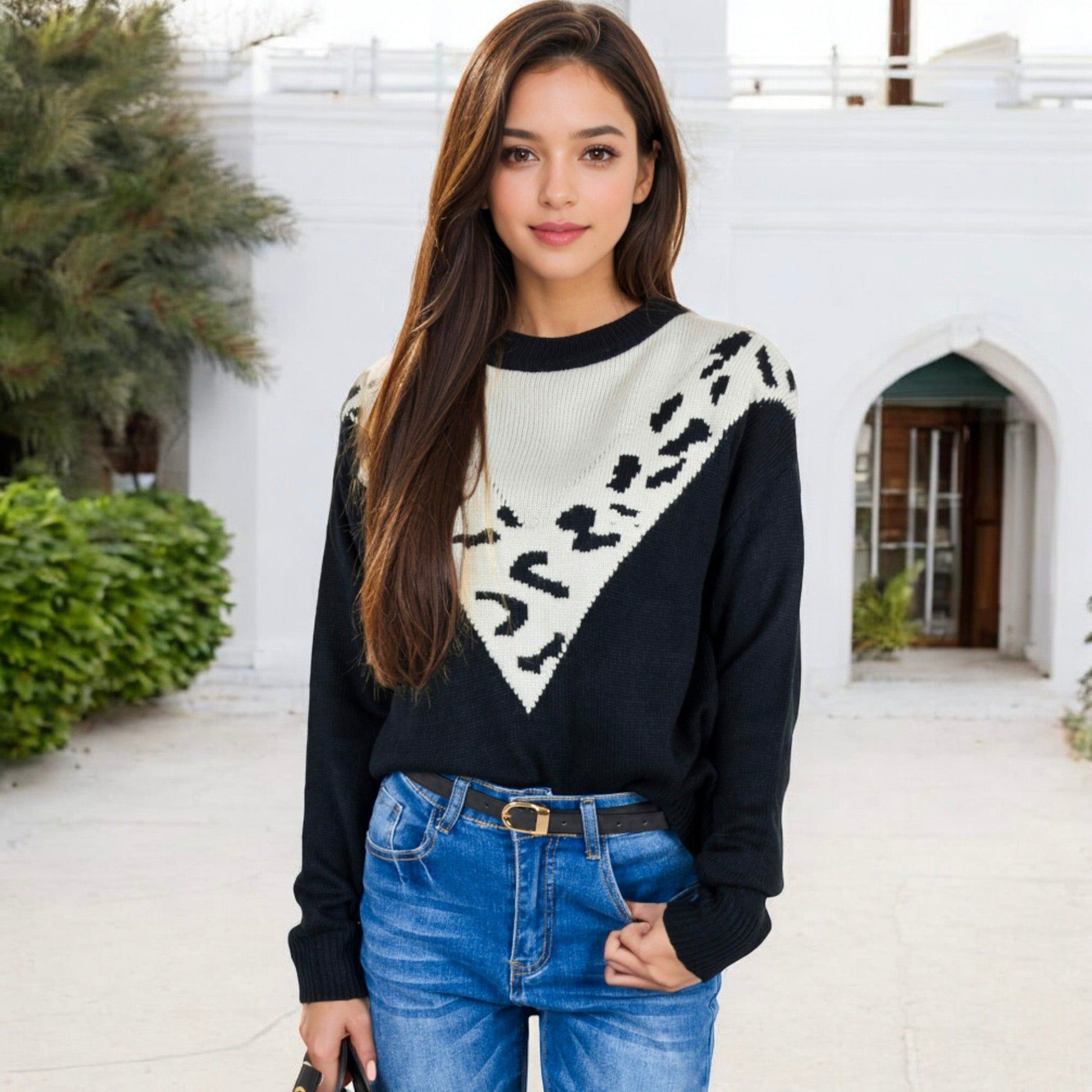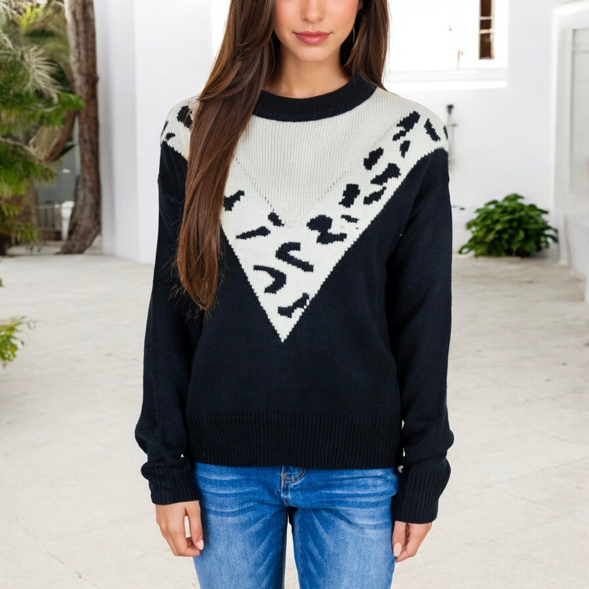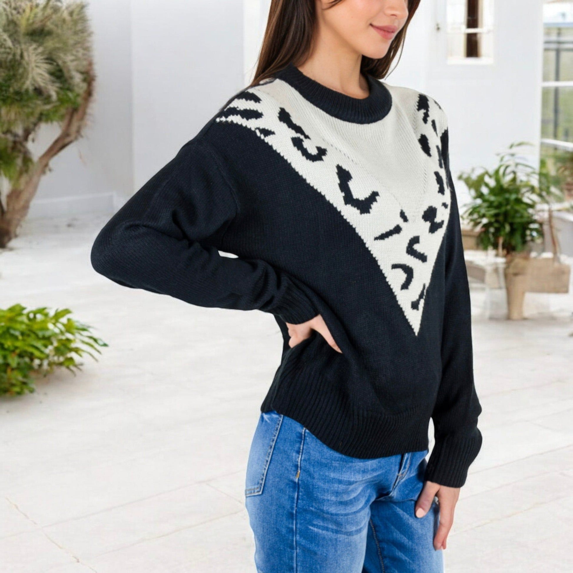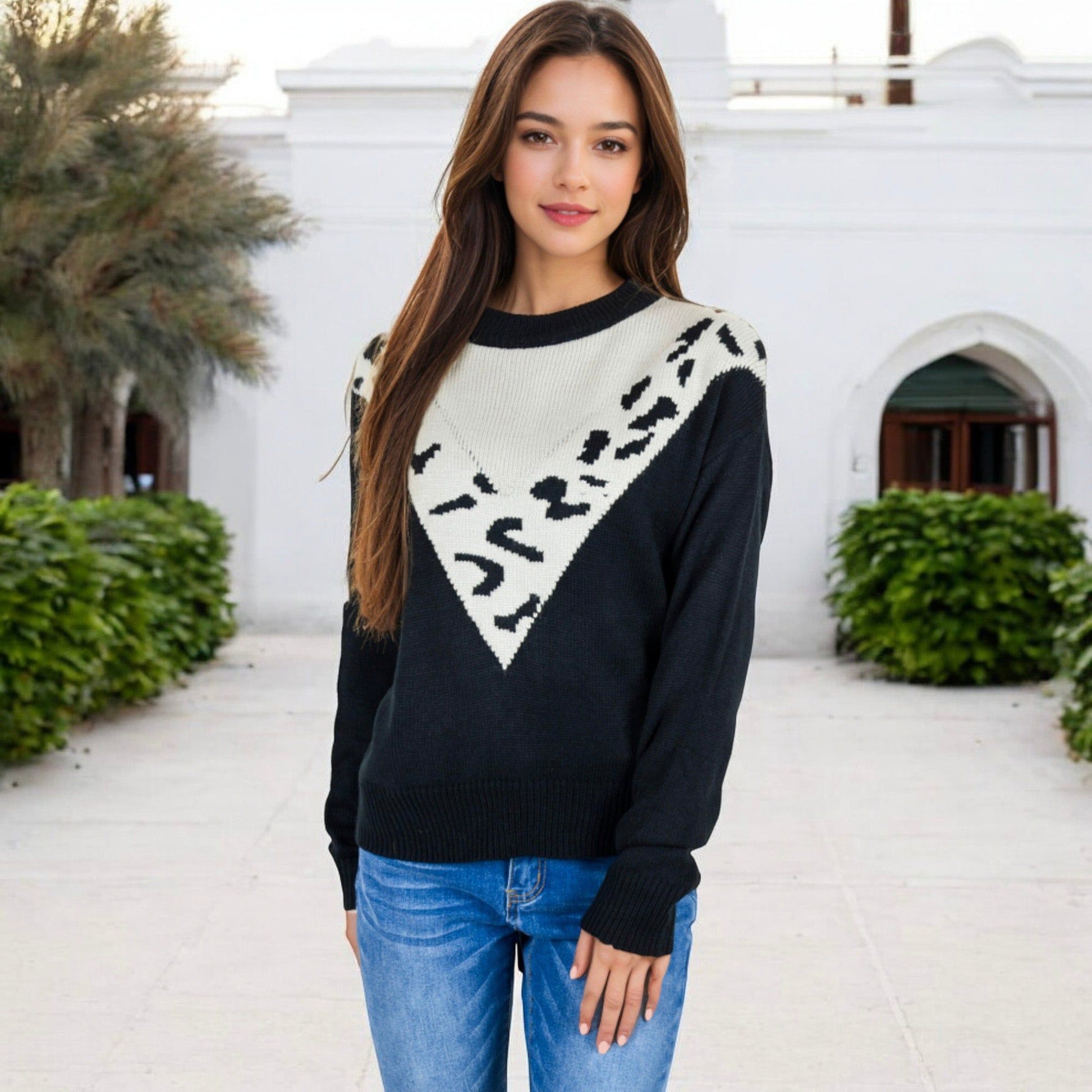 Crew Neck Sweater with Contrast Leopard Print Chevron Design