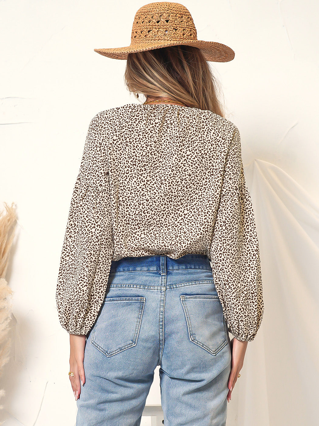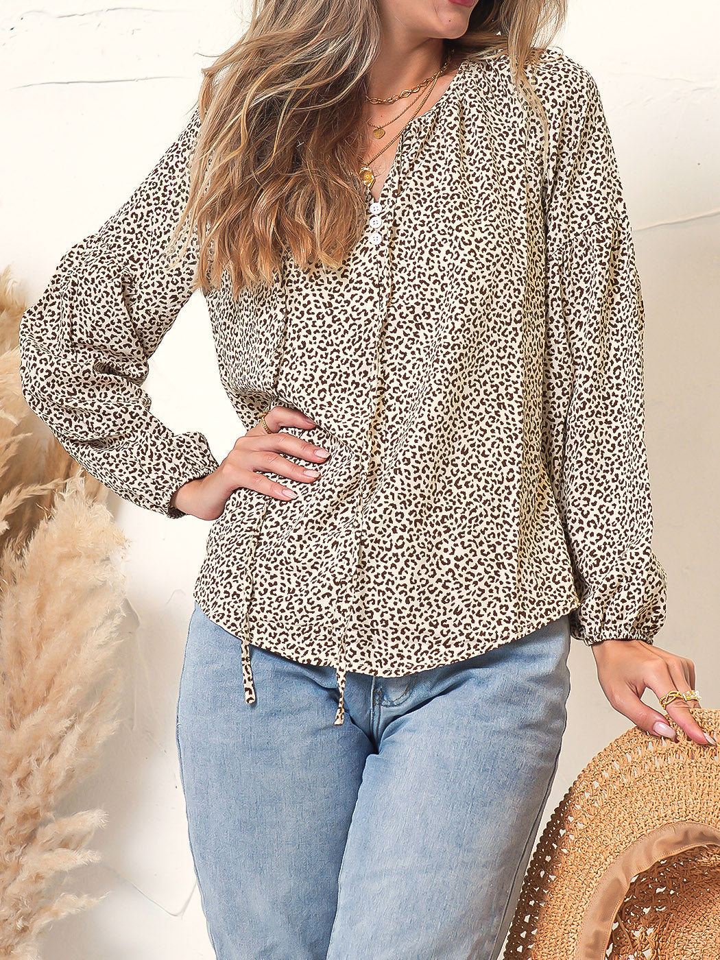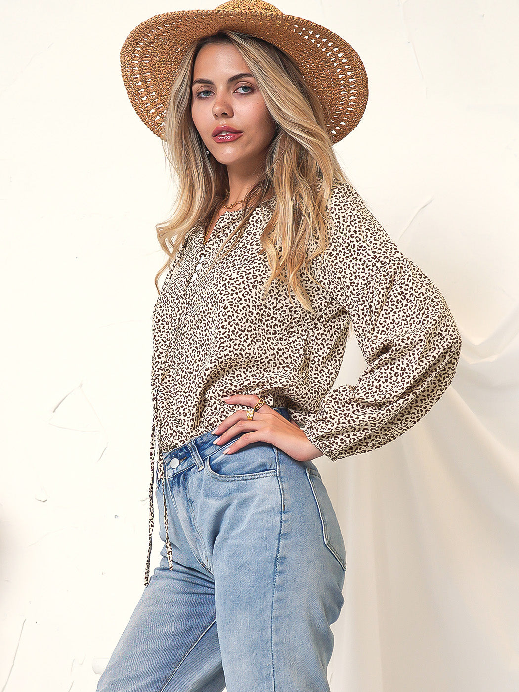 The Anna-Kaci blouse is detailed with a fierce cheetah print. Features a tie neck, button detail, drop shoulder, long sleeves, rounded hem, and loose fit. Pair it with a denim midi skirt and heels for a bold look.