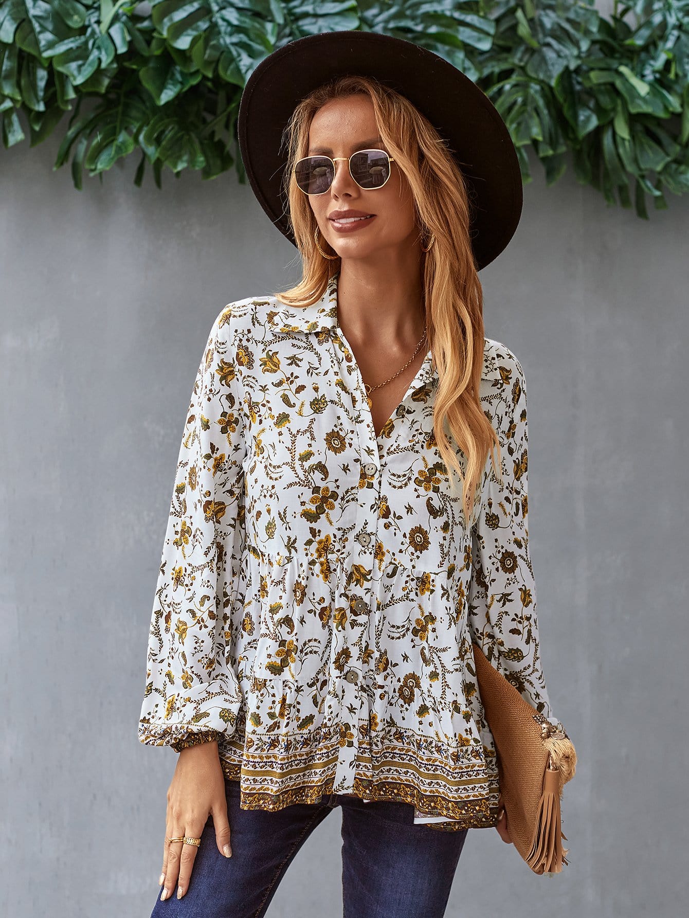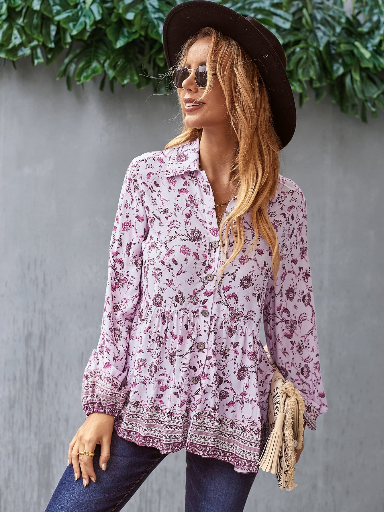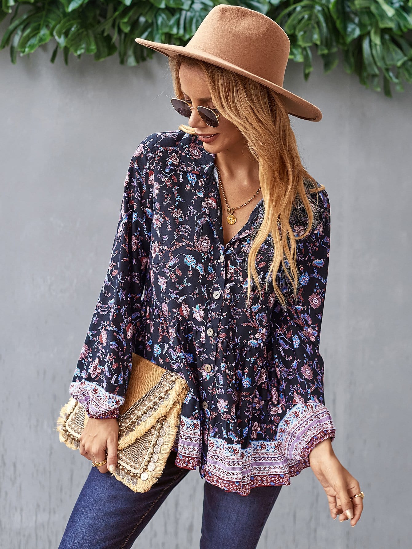 The Anna-Kaci blouse is detailed with a classic floral boho print. Features a collar, button down closure, long sleeves, and flowy fit. Pair it with trousers and sunnies for a pretty look.