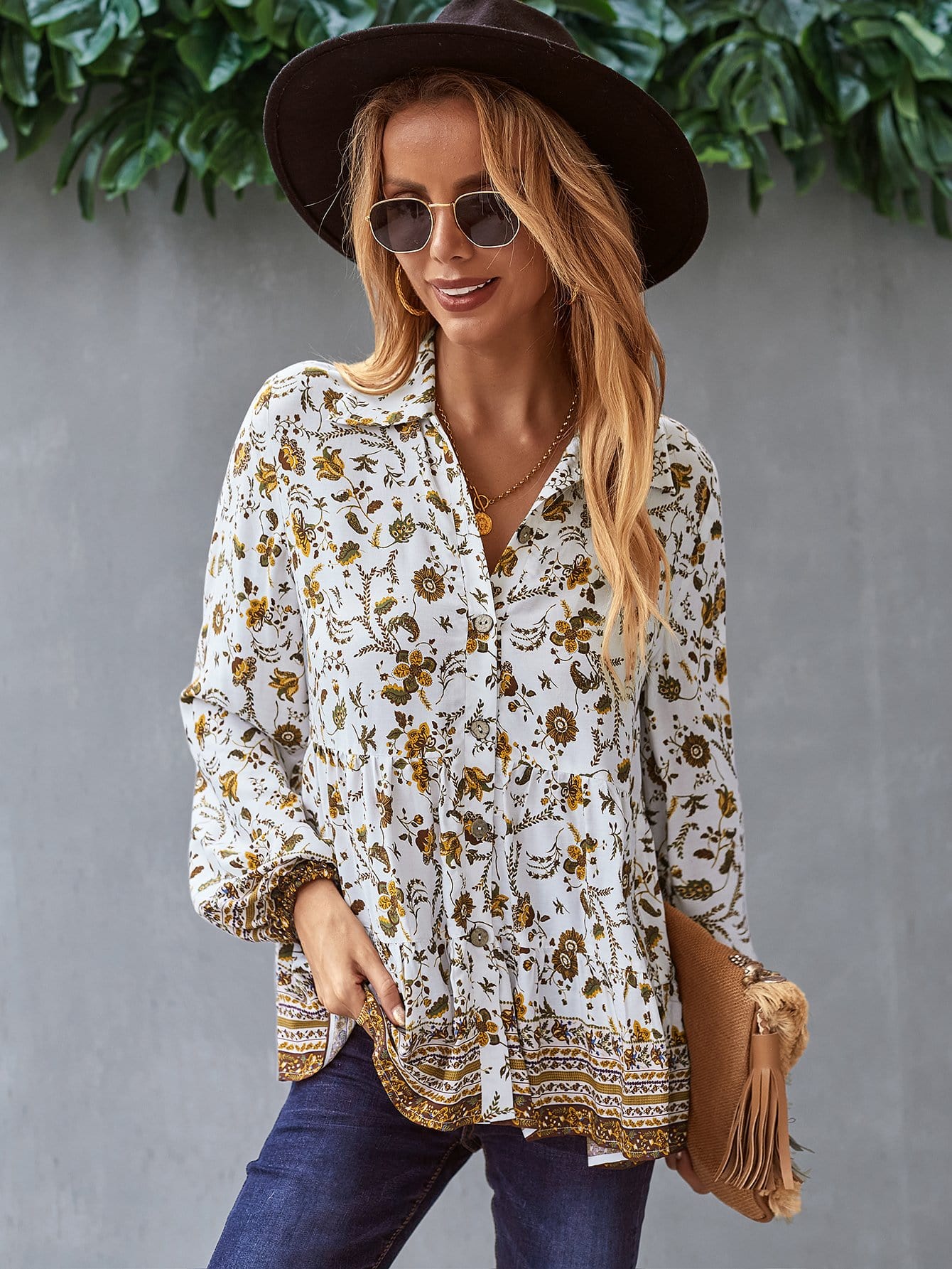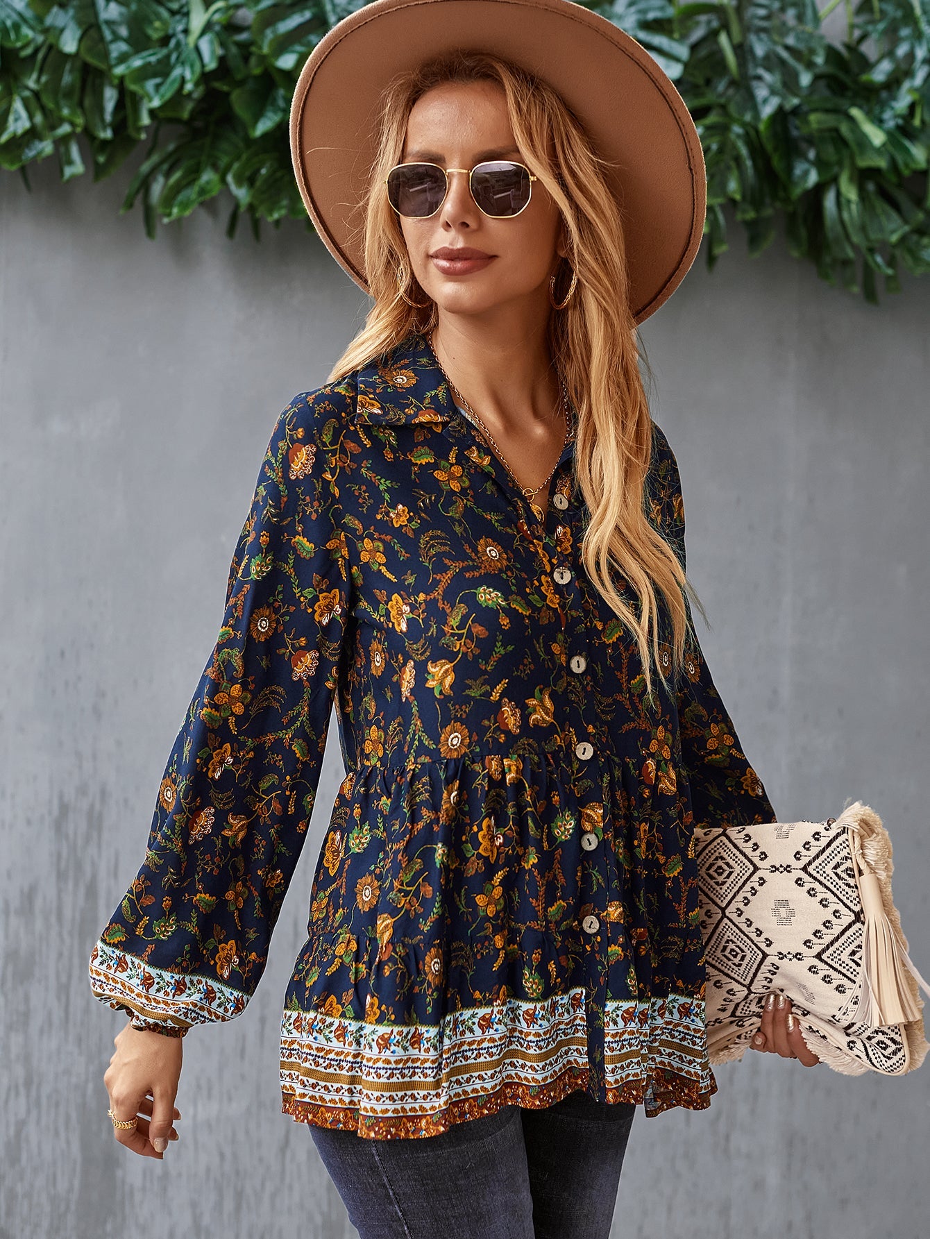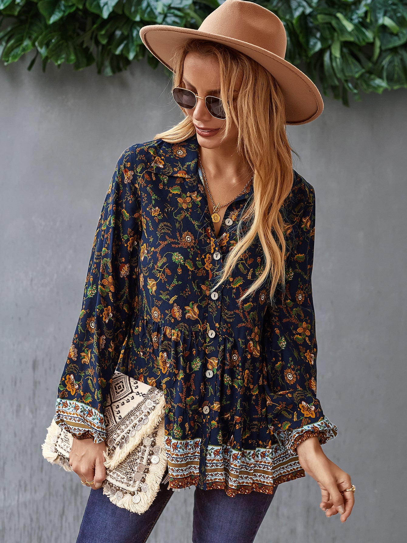 The Anna-Kaci blouse is detailed with a classic floral boho print. Features a collar, button down closure, long sleeves, and flowy fit. Pair it with trousers and sunnies for a pretty look.