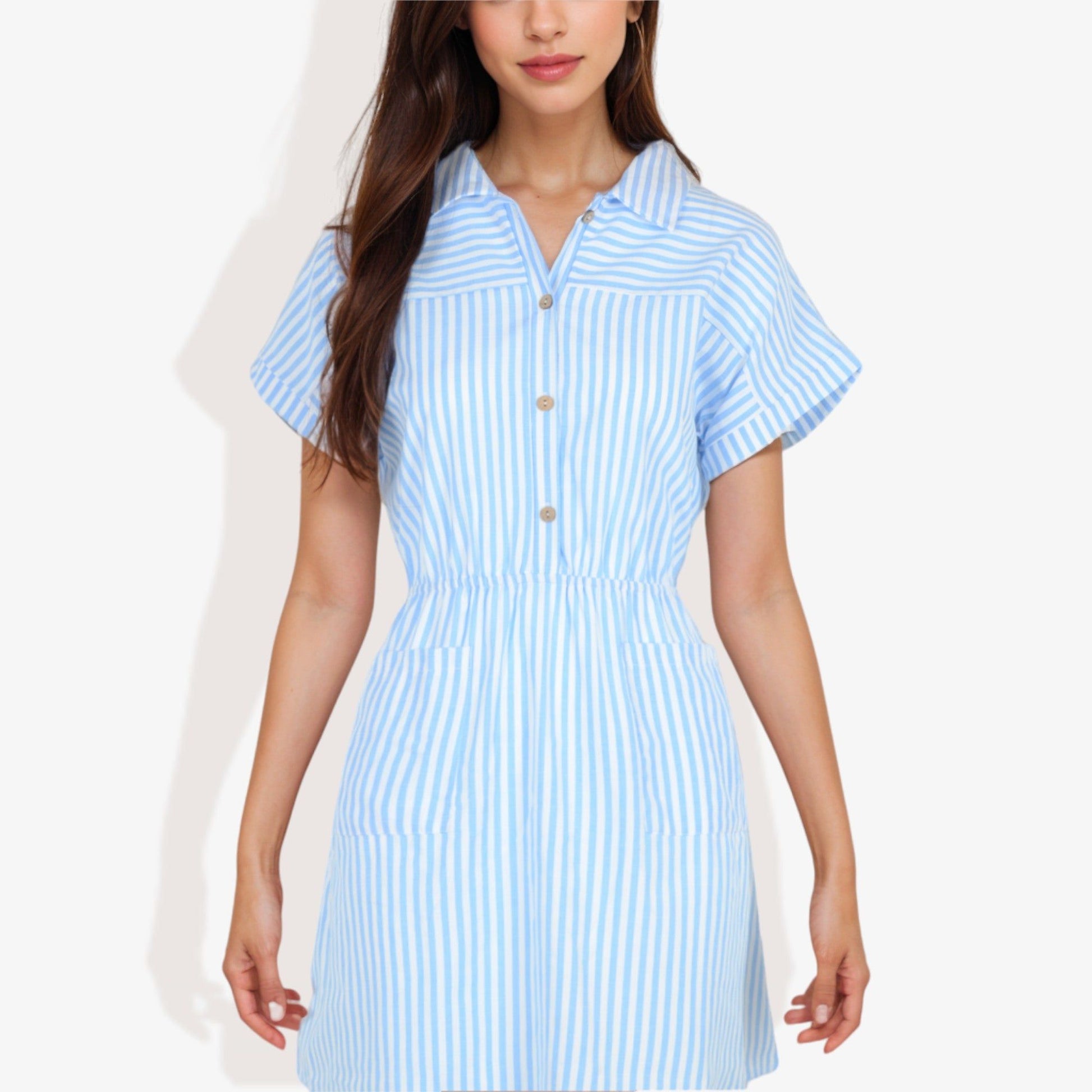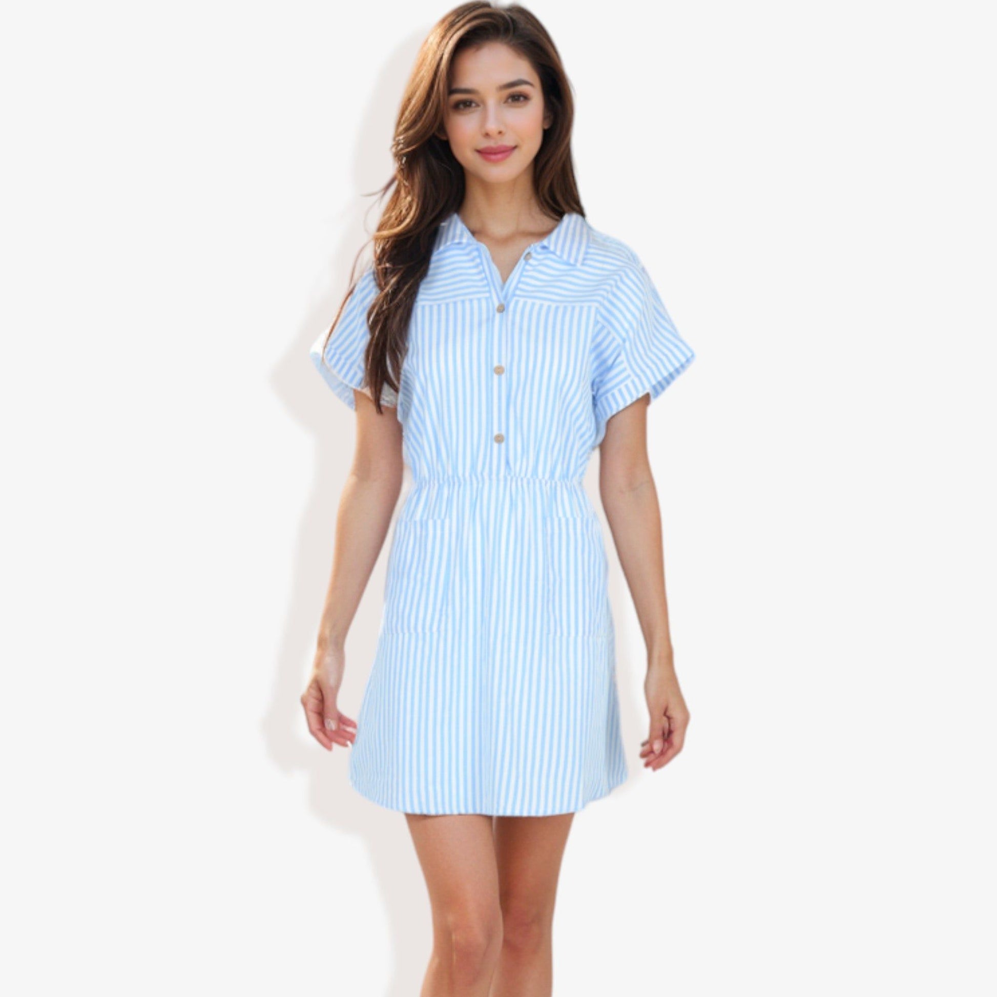The Anna-Kaci Women's Short Sleeve Striped Shirt Dress with Button Front and Elastic Waist is the perfect casual summer dress. Crafted from lightweight, breathable fabric, this dress features a classic striped pattern and a button-front design that adds a touch of timeless style. The elastic waist provides a comfortable and flattering fit, while the short sleeves keep you cool on warm days. Ideal for a variety of occasions, from beach outings to casual brunches, this versatile dress pairs effortlessly with sandals, sneakers, or wedges for an easy, chic look. Perfect for a mom on the go or anyone who appreciates stylish and comfortable fashion, this striped shirt dress is a must-have addition to your summer wardrobe.