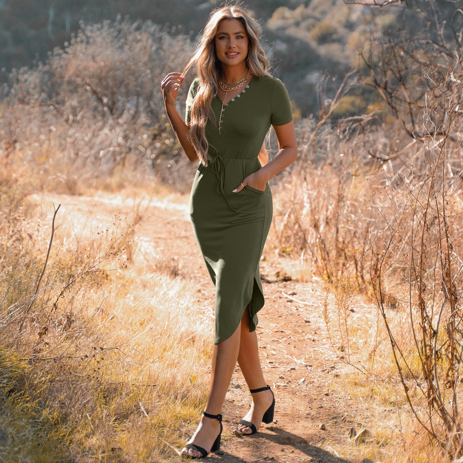The Anna-Kaci dress is detailed with a unique rounded hem. Features solid color, henley style buttons, short sleeves, drawstring waist, side pockets, semi-bodycon fit, and knee length. Pair it with a necklace and sneakers for an easygoing look.