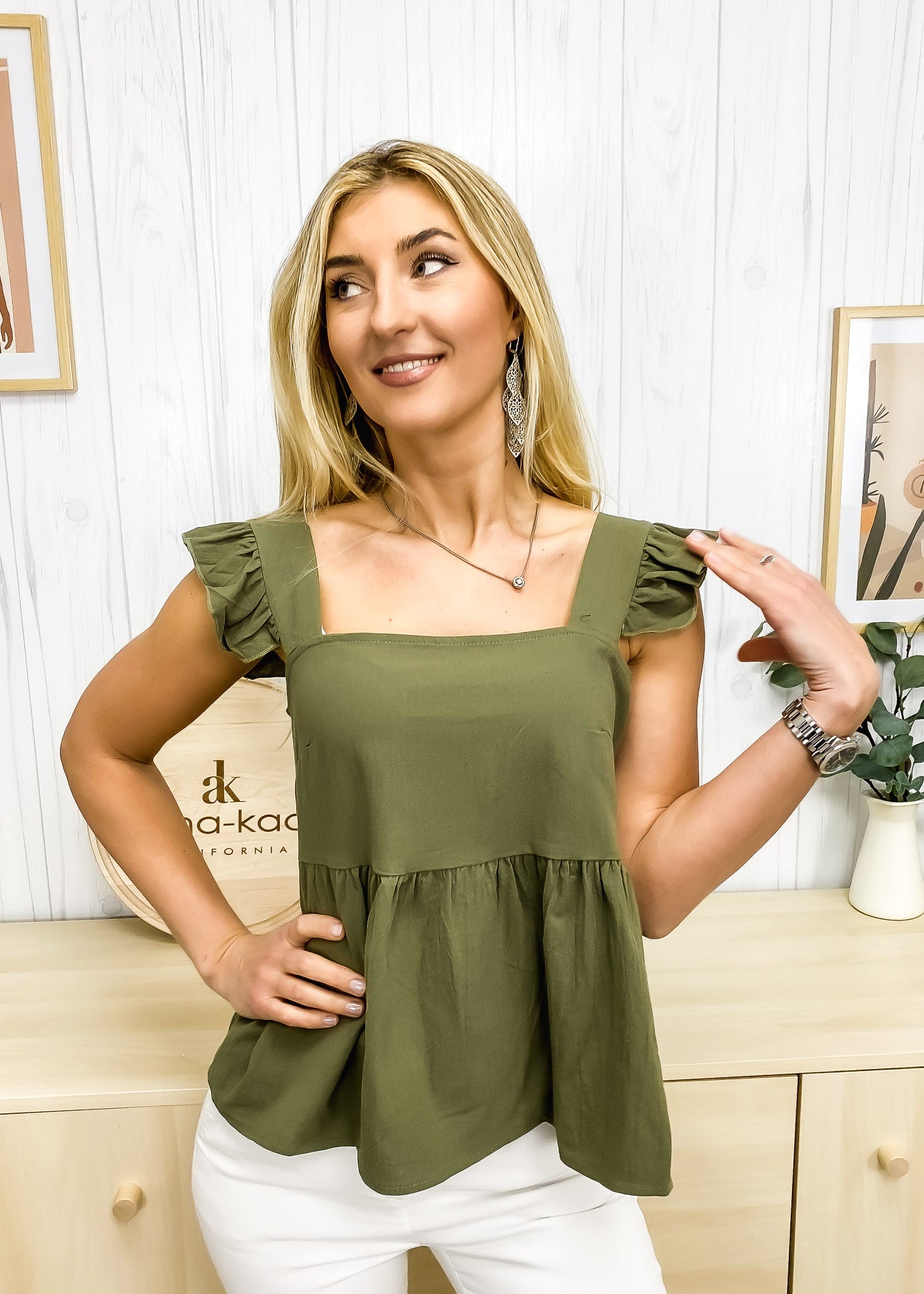 ?The Anna-Kaci top is detailed with feminine ruffle straps. Features a square neck line, sleeveless, peplum hem, and regular fit. Pair it with boyfriend jeans and a baseball cap for a juxtaposing look.