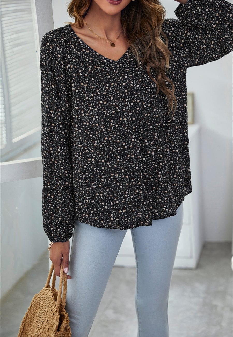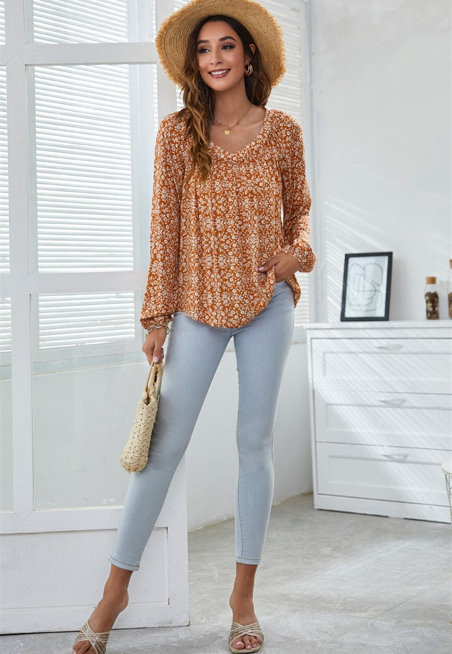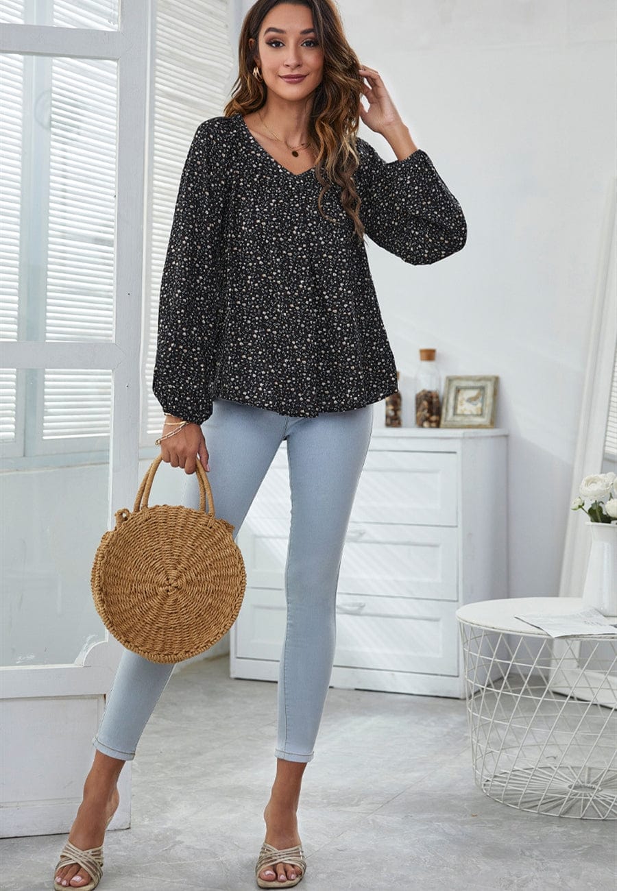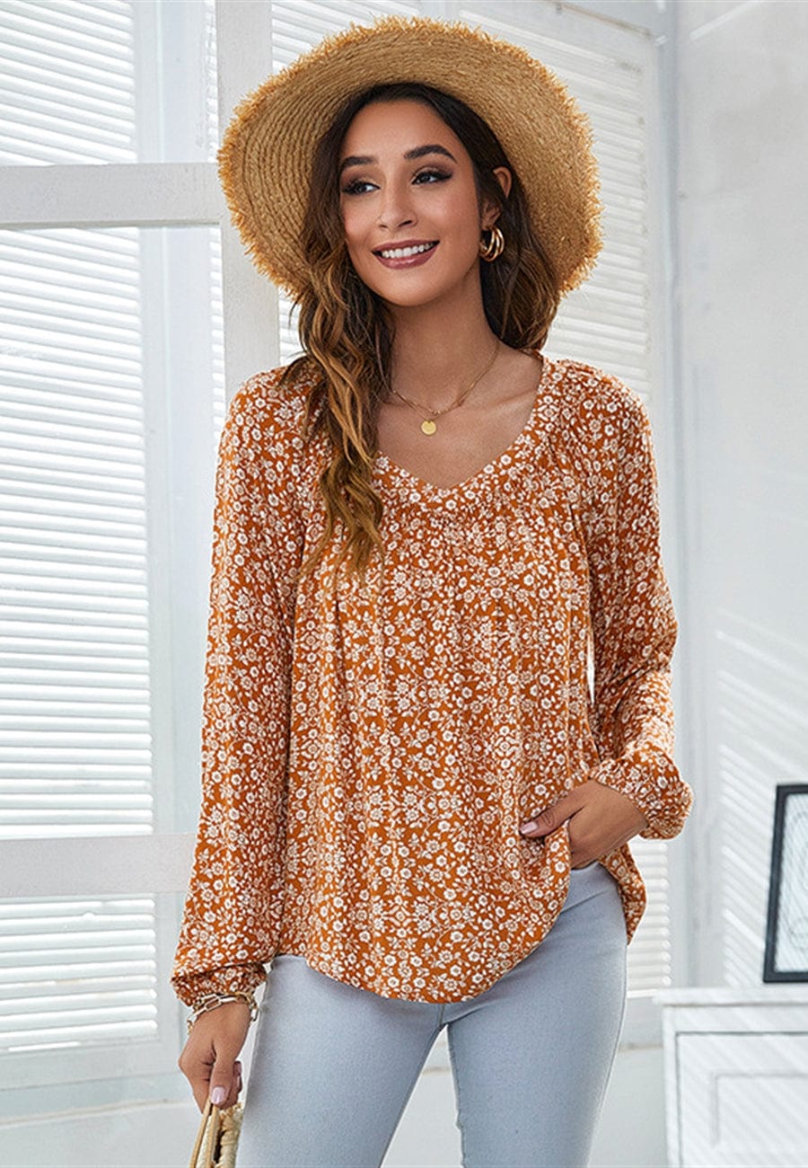 The Anna-Kaci blouse is detailed with a classic v neck line. Features a floral print, long sleeves, and loose fit. Pair it with jeans and boots for a nice spring look.