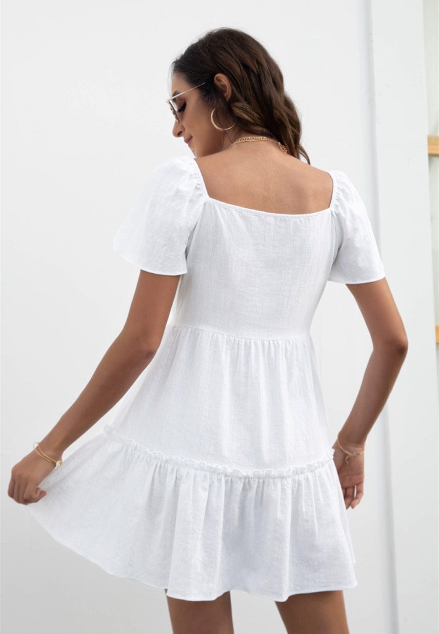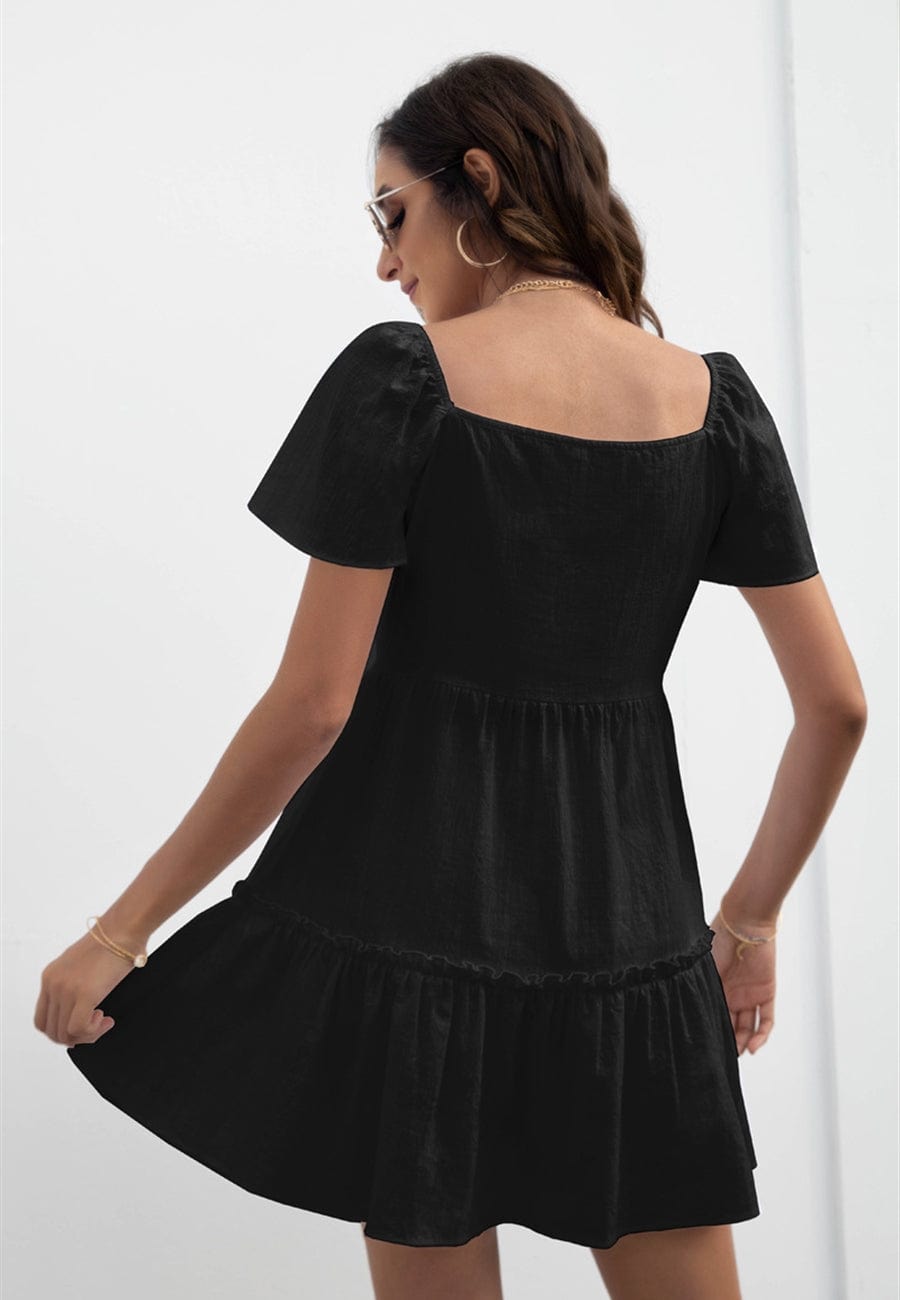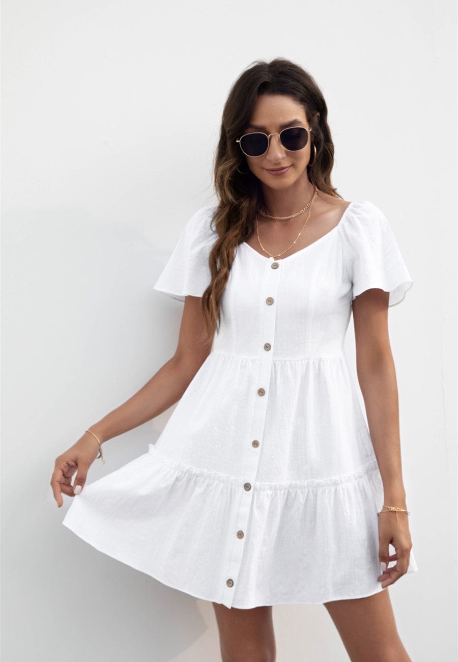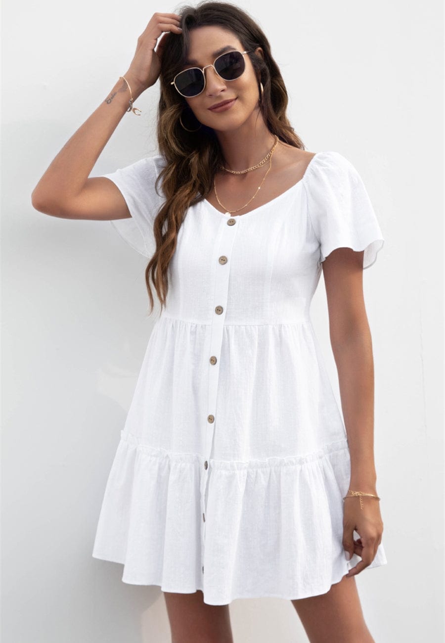 The Anna-Kaci dress is detailed with a cute button down design. Features solid color, round neck line, short sleeves, tiered skirt, and above knee length. Pair it with sunnies and sneakers for an easygoing summer look.