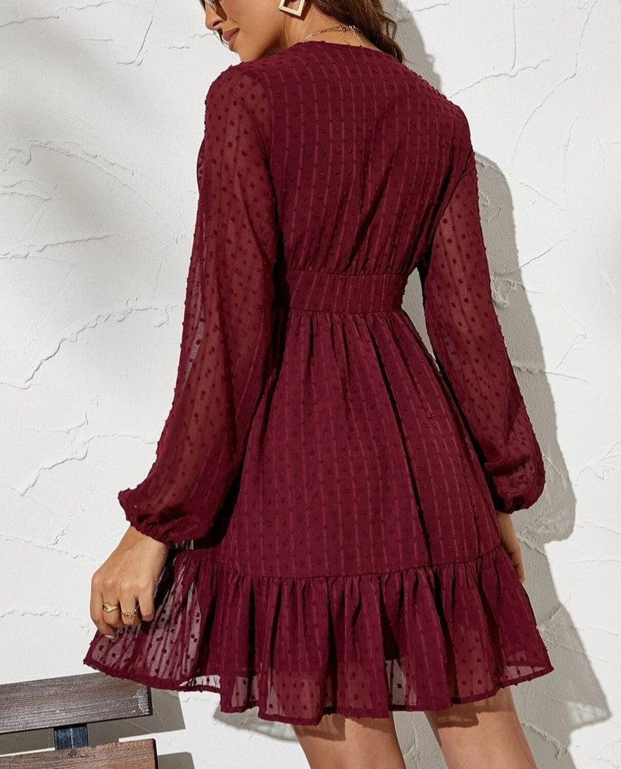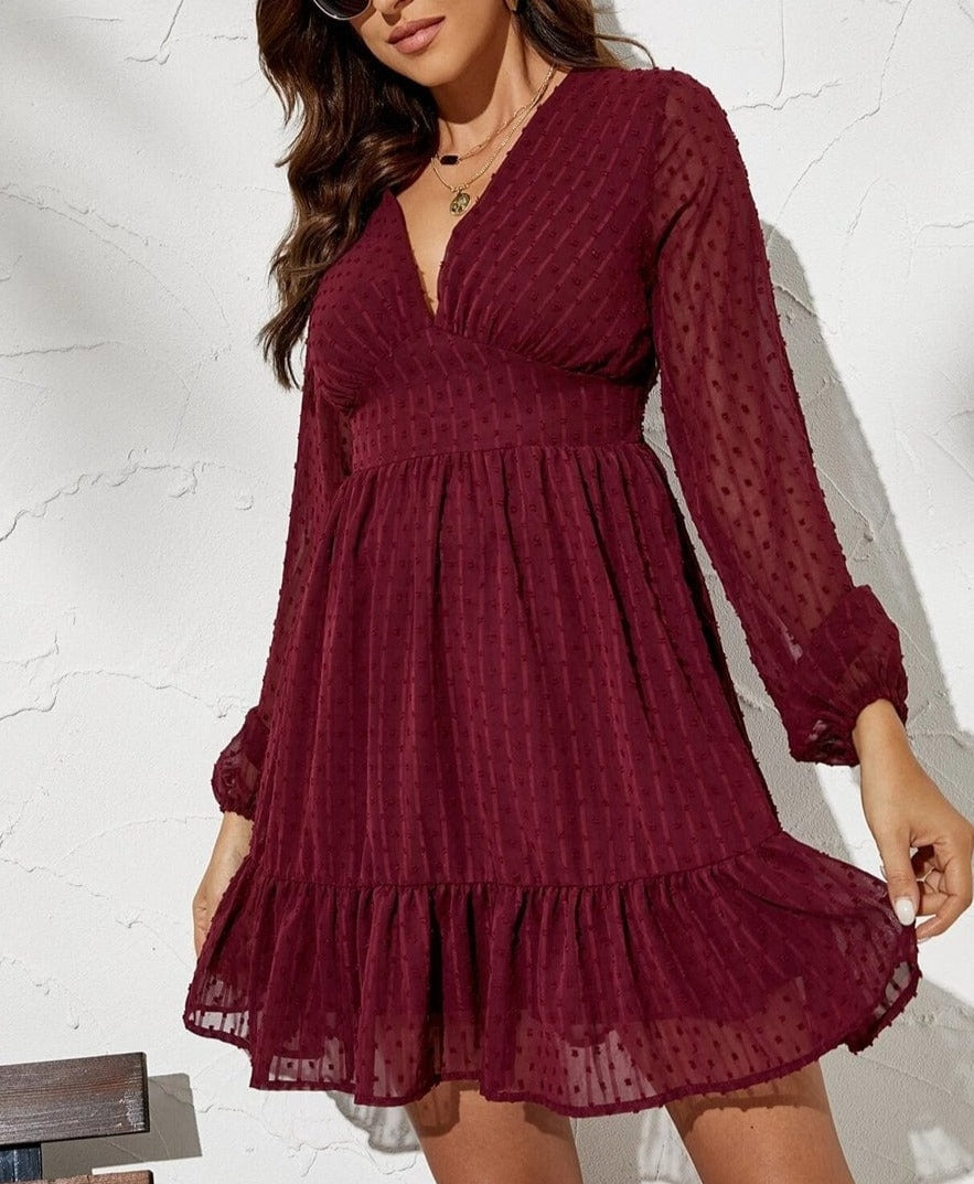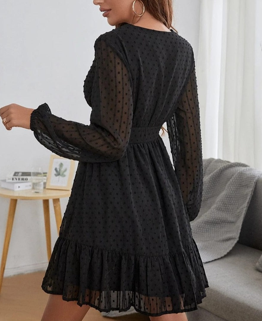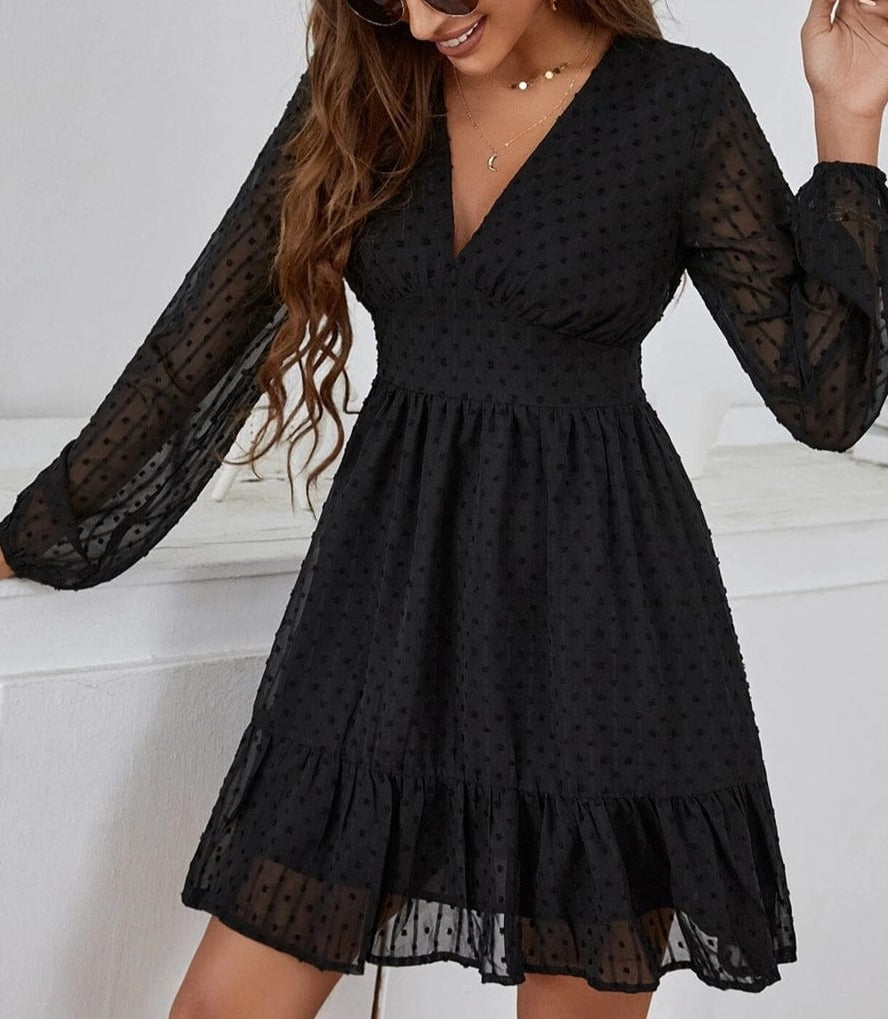 The Anna-Kaci dress is detailed with a beautiful swiss dot patterned fabric. Features a plunge neck line, long sleeves, flowy skirt, ruffle hem, and above knee length. Pair it with a fedora hat and boots for a magnificent look.