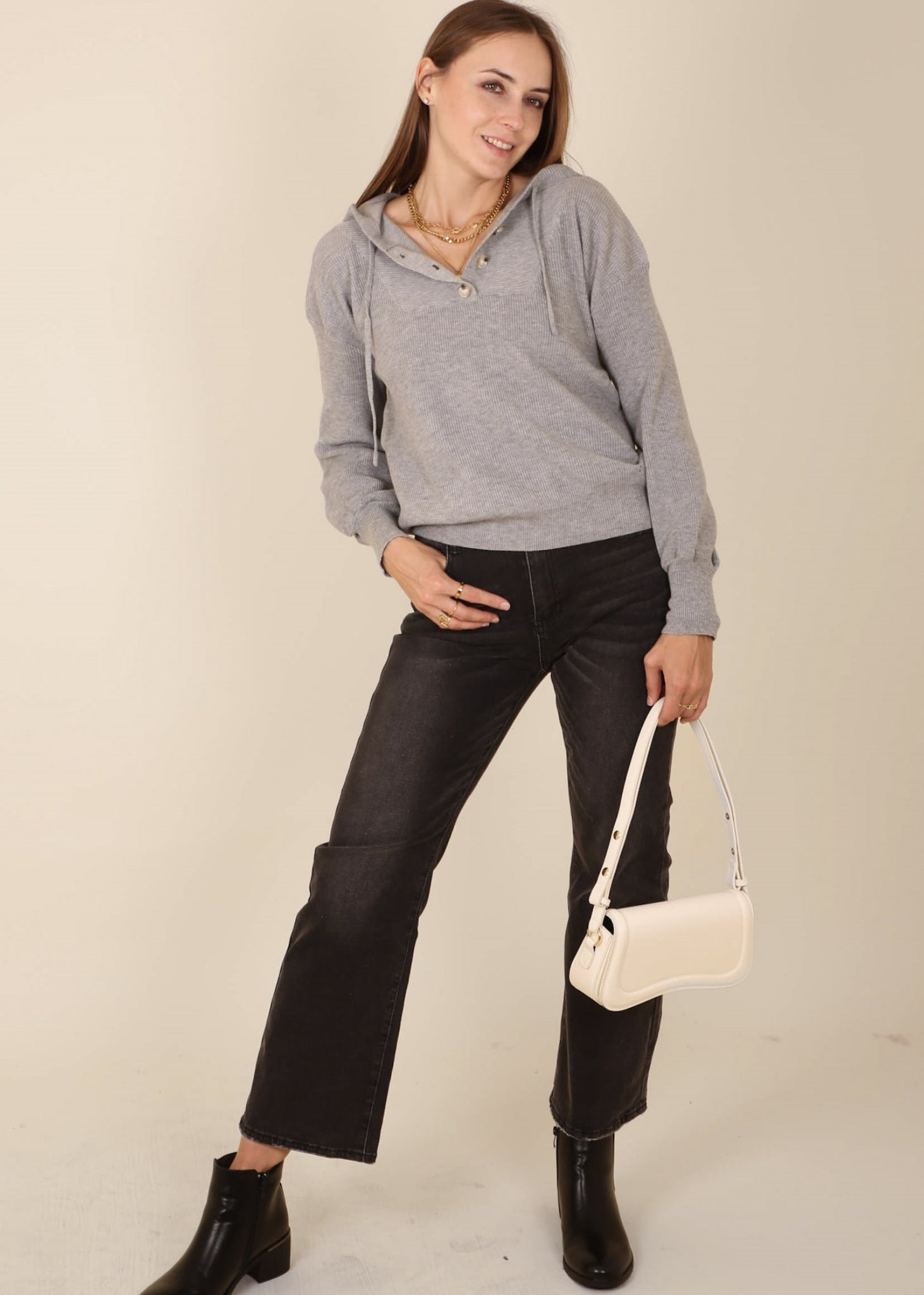 The Anna-Kaci hoodie is detailed with a classic henley button design. Features a ribbed knit material, drop shoulder, hood, long sleeves, and loose fit. Pair it with mom jeans and sneakers for a comfy look.