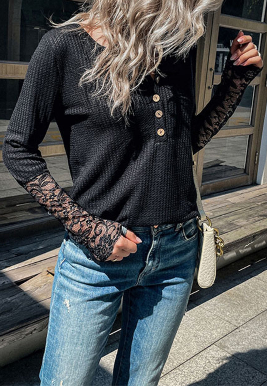 The Anna-Kaci blouse is detailed with beautiful half lace sleeves. Features a v neck line, henley style, textured knit material, long sleeves, and regular fit. Pair it with cuffed jeans and sneakers for an easygoing look.