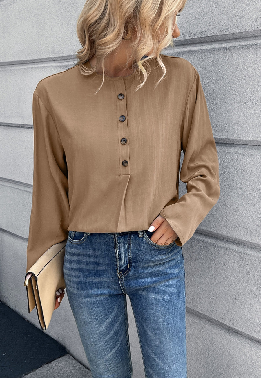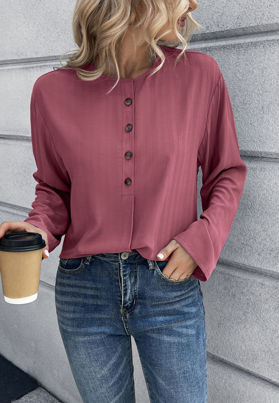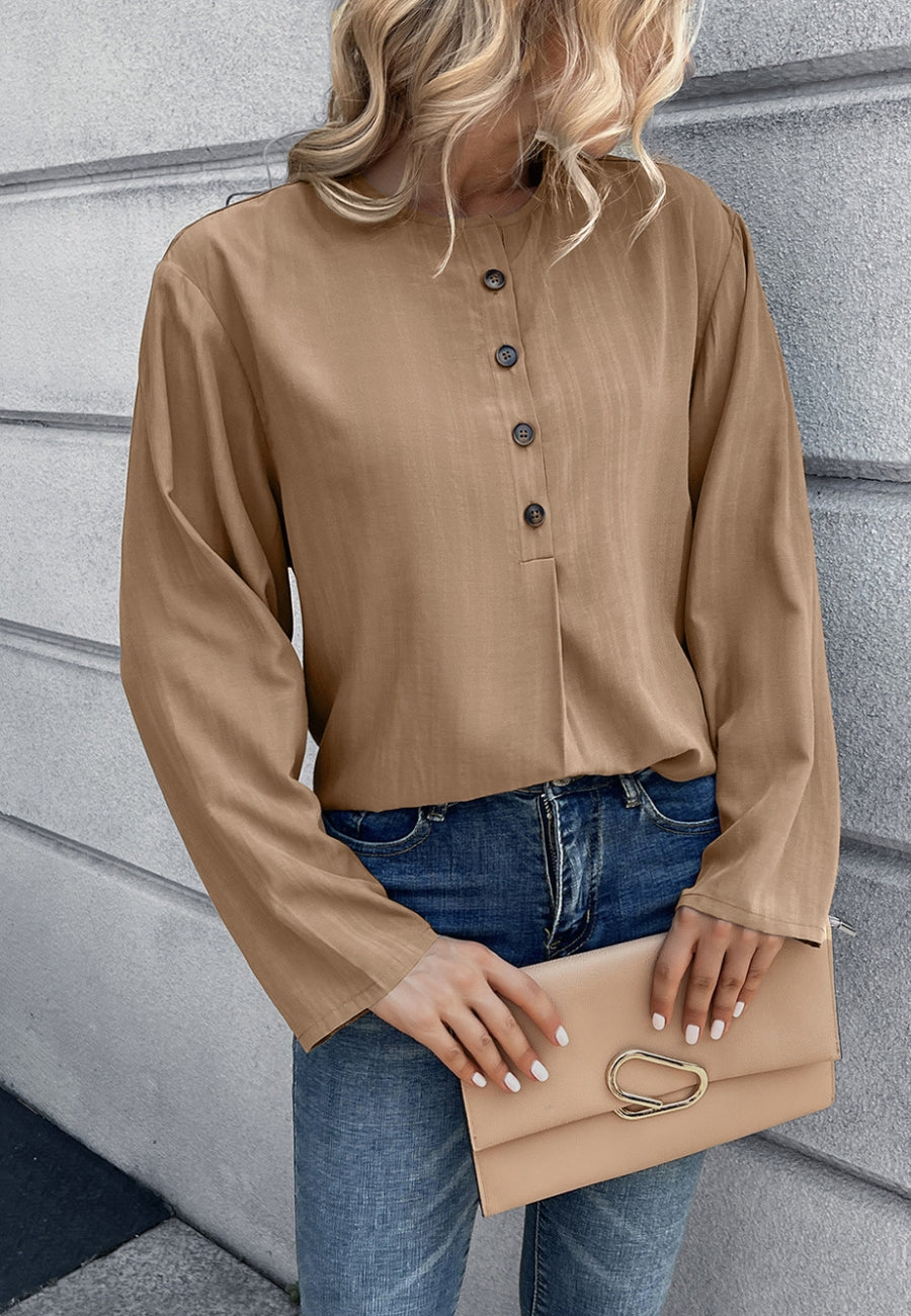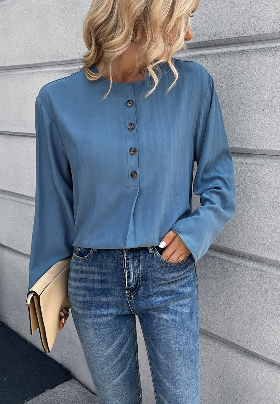 The Anna-Kaci blouse is detailed with a fun contrast button down design. Features a round neck line, solid color, long sleeves, and regular fit. Pair it with boyfriend jeans and sneakers for an easygoing look.