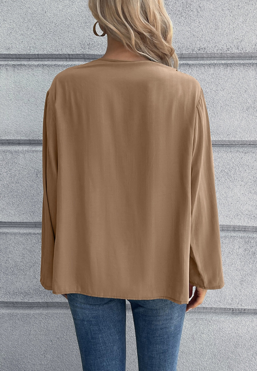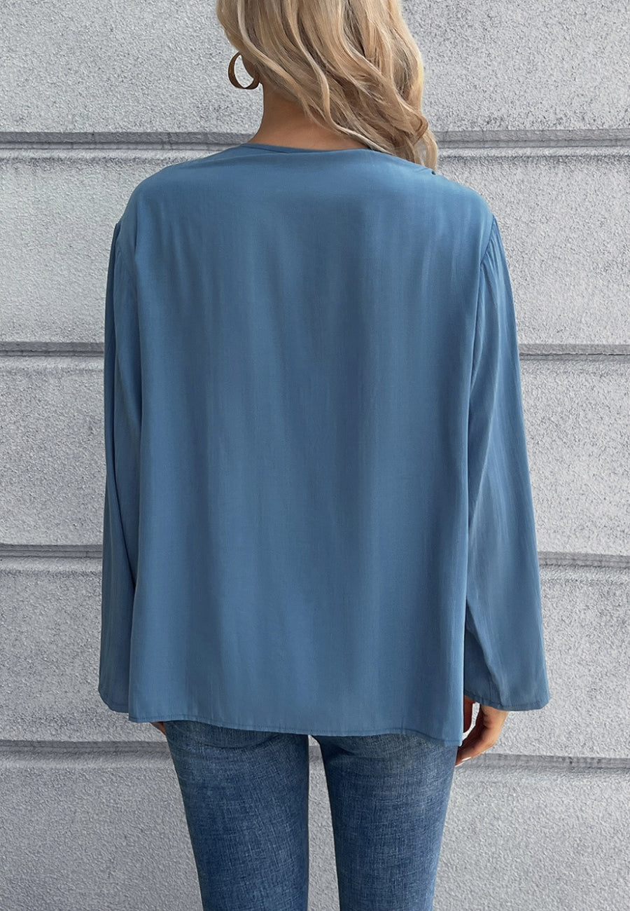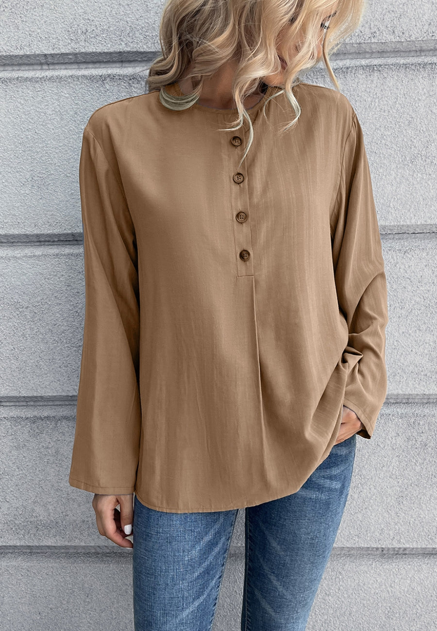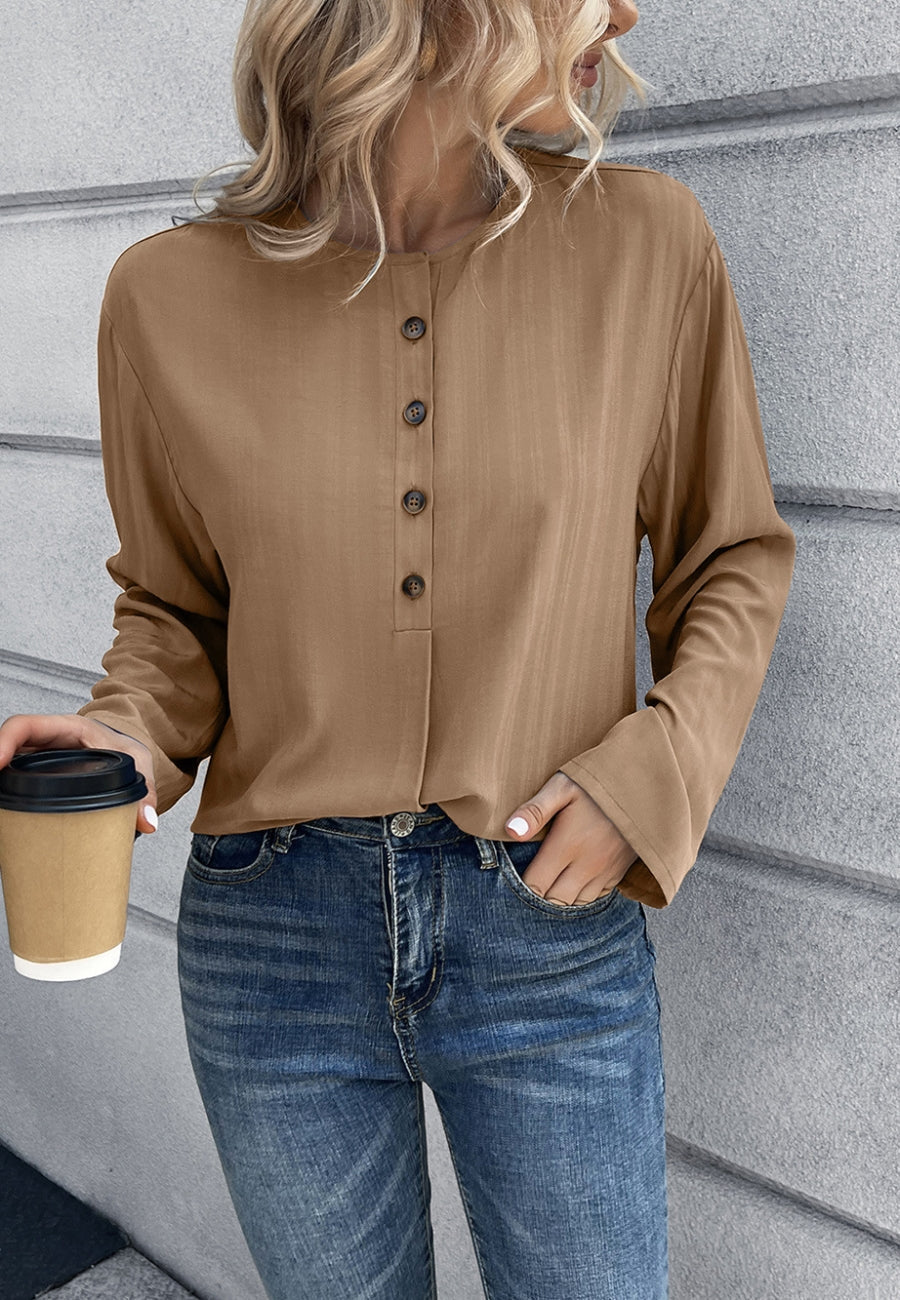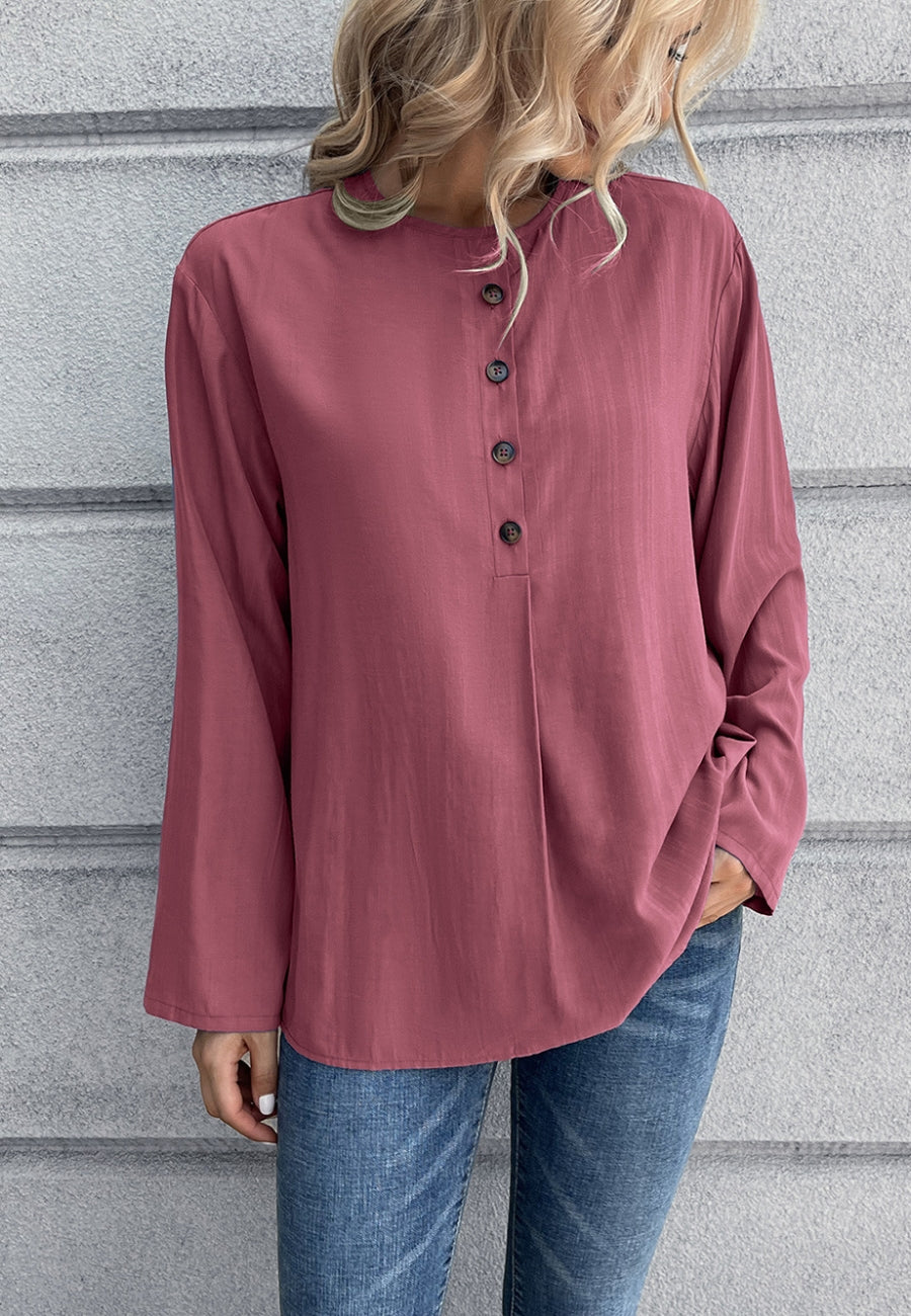 The Anna-Kaci blouse is detailed with a fun contrast button down design. Features a round neck line, solid color, long sleeves, and regular fit. Pair it with boyfriend jeans and sneakers for an easygoing look.