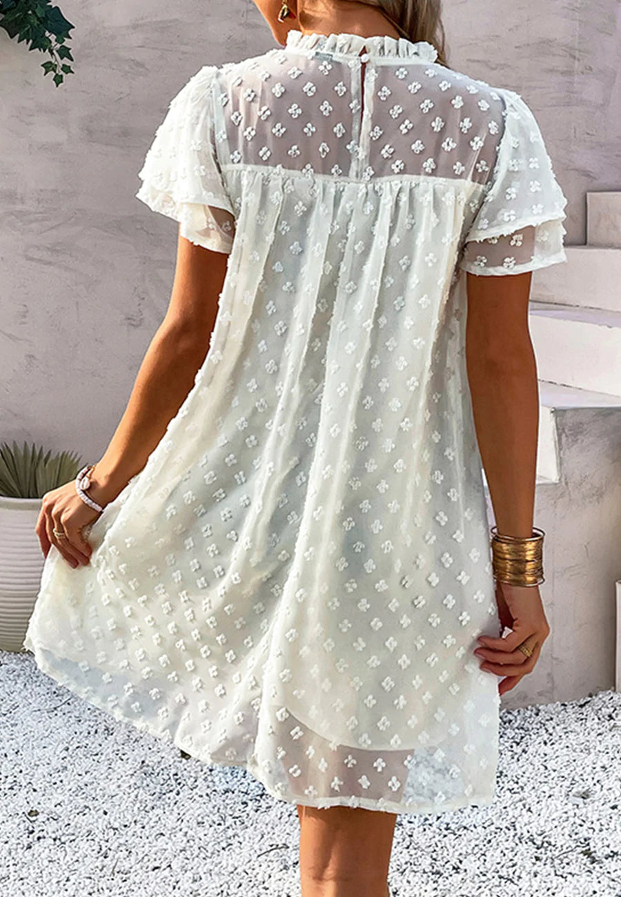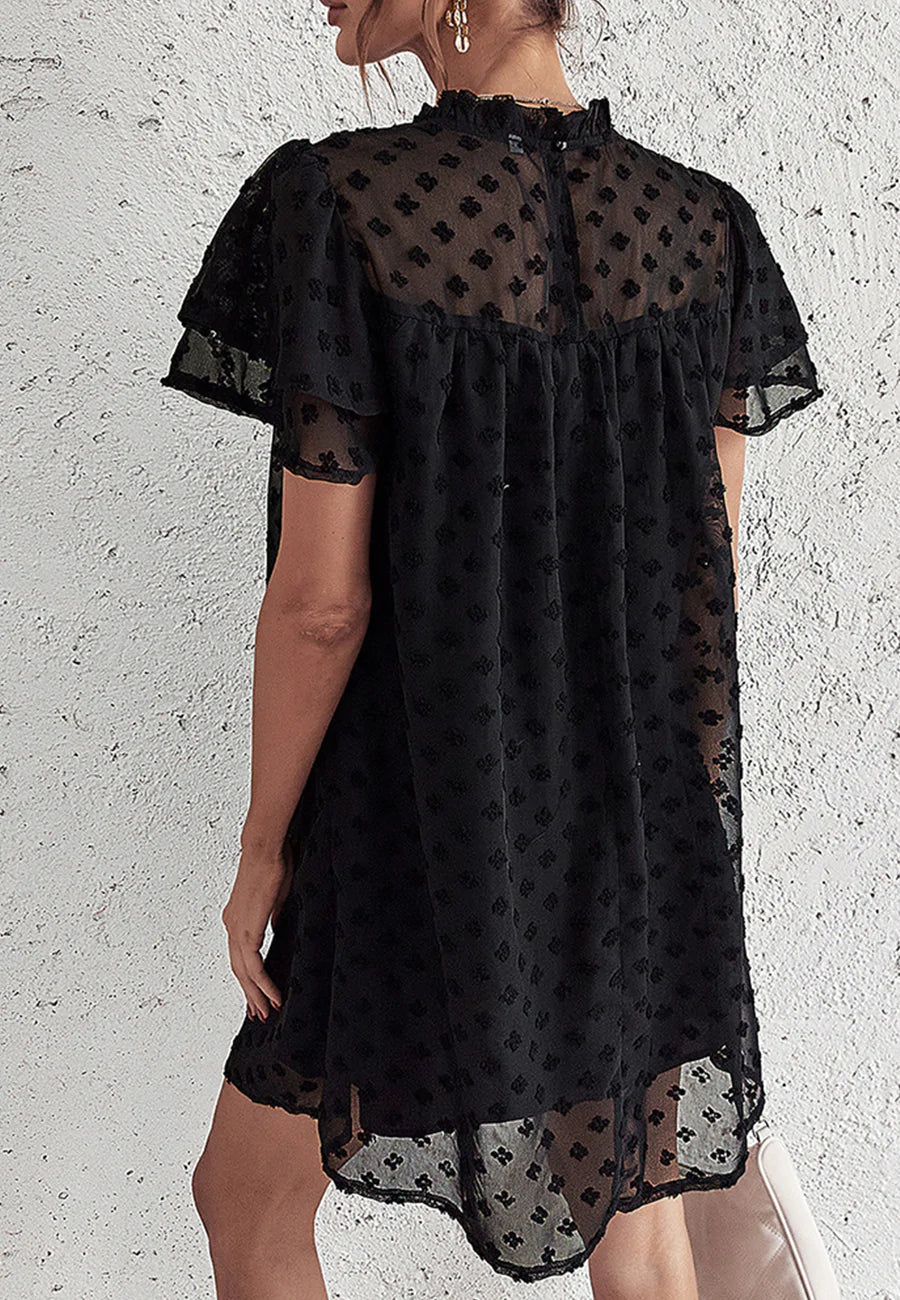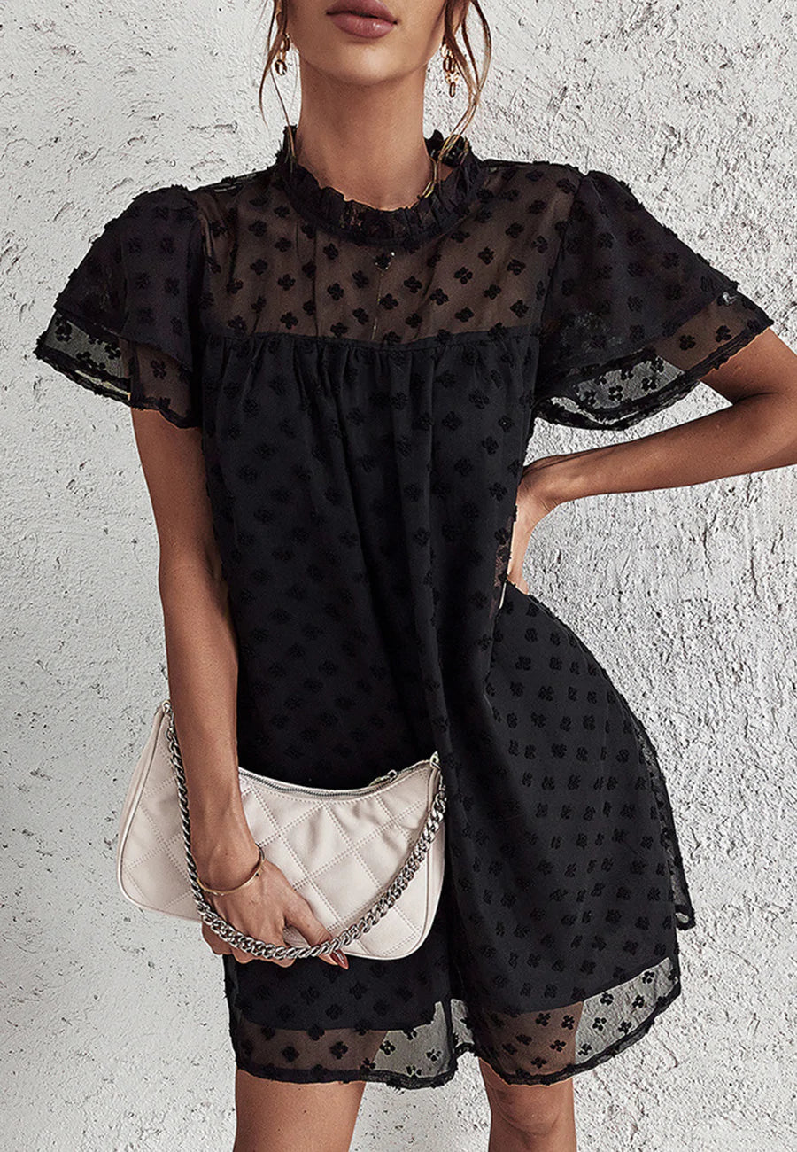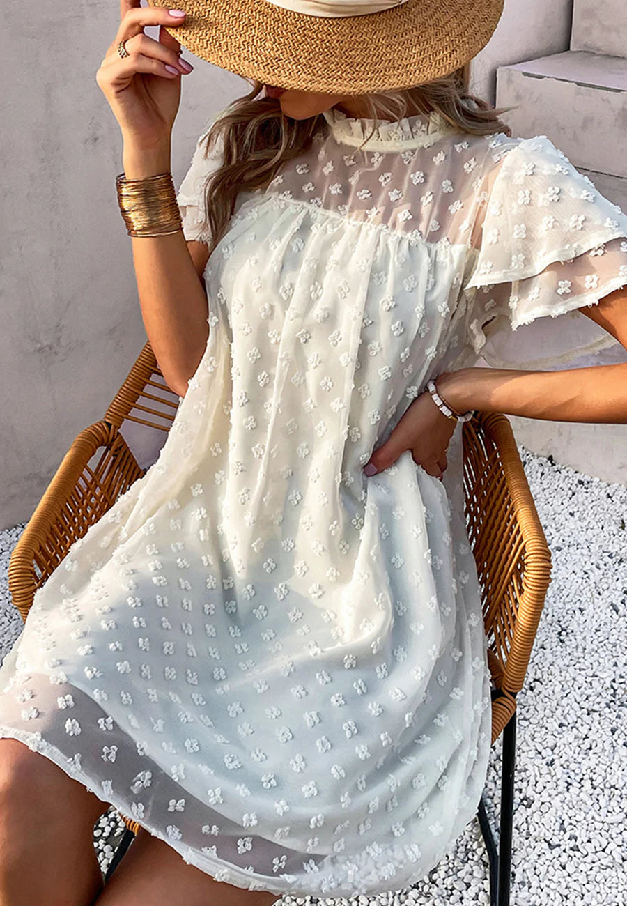 ??he Anna-Kaci dress is detailed with beautiful tiered flutter sleeves. Features a ruffle neck, sheer textured material, shift dress silhouette, and above knee length. Pair it with strappy sandals and a handbag for a gorgeous look.