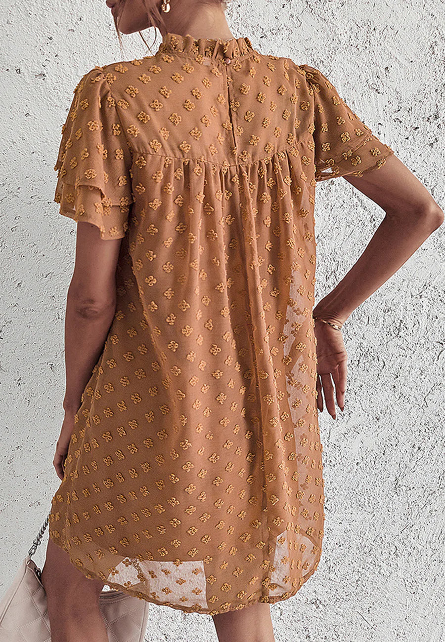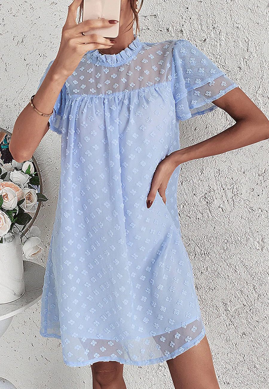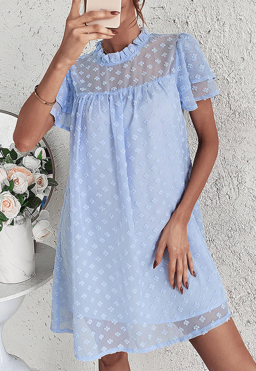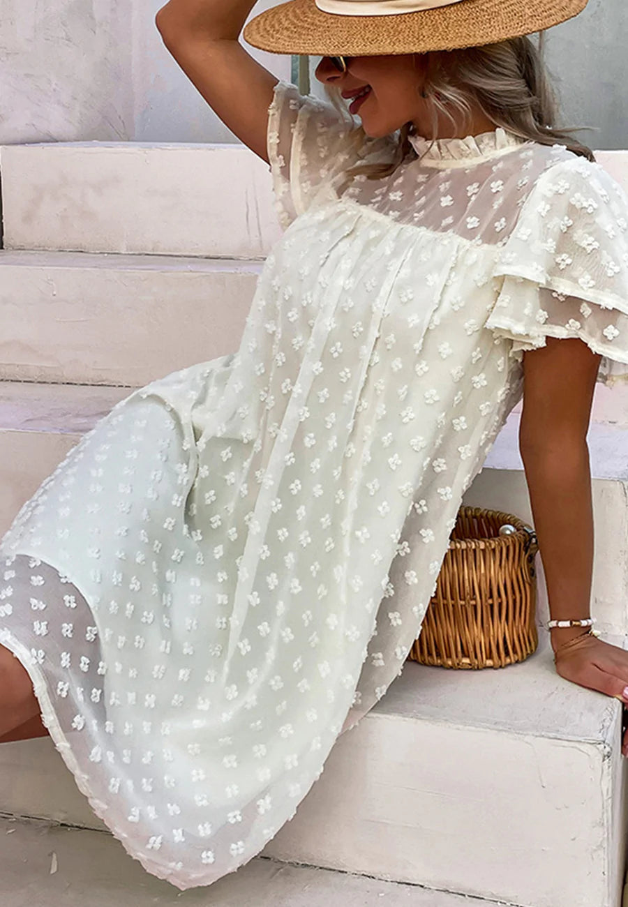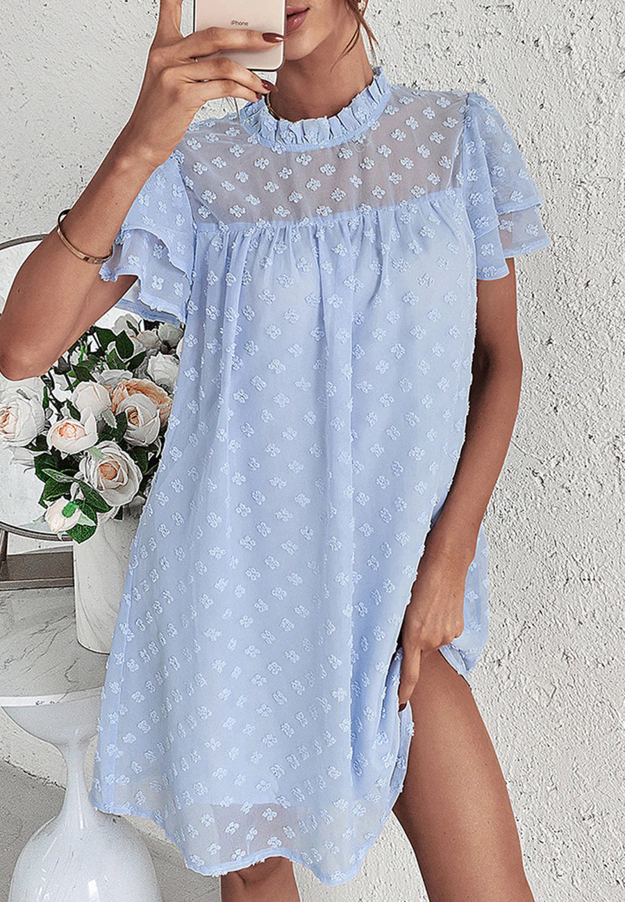 ??he Anna-Kaci dress is detailed with beautiful tiered flutter sleeves. Features a ruffle neck, sheer textured material, shift dress silhouette, and above knee length. Pair it with strappy sandals and a handbag for a gorgeous look.
