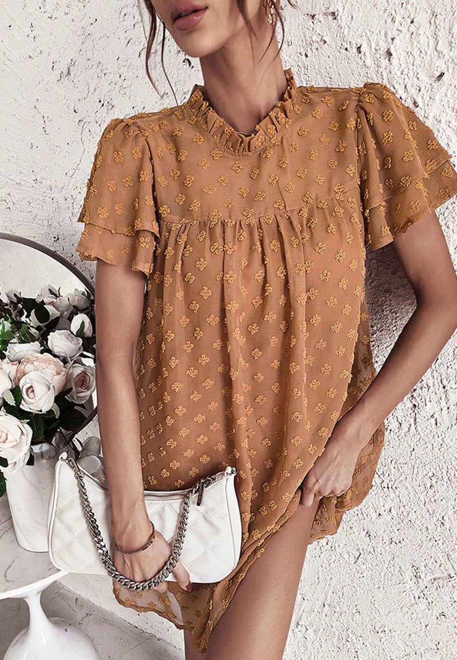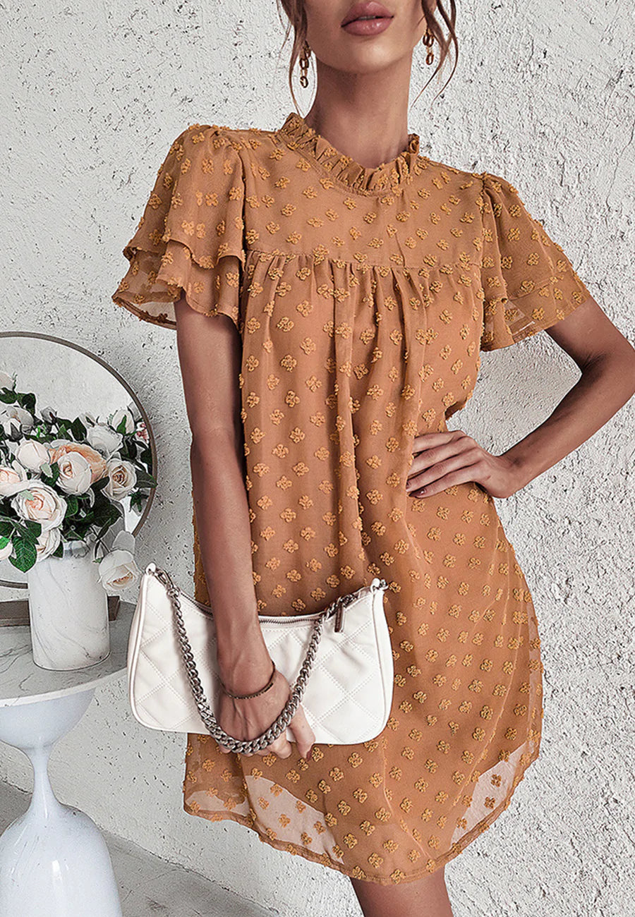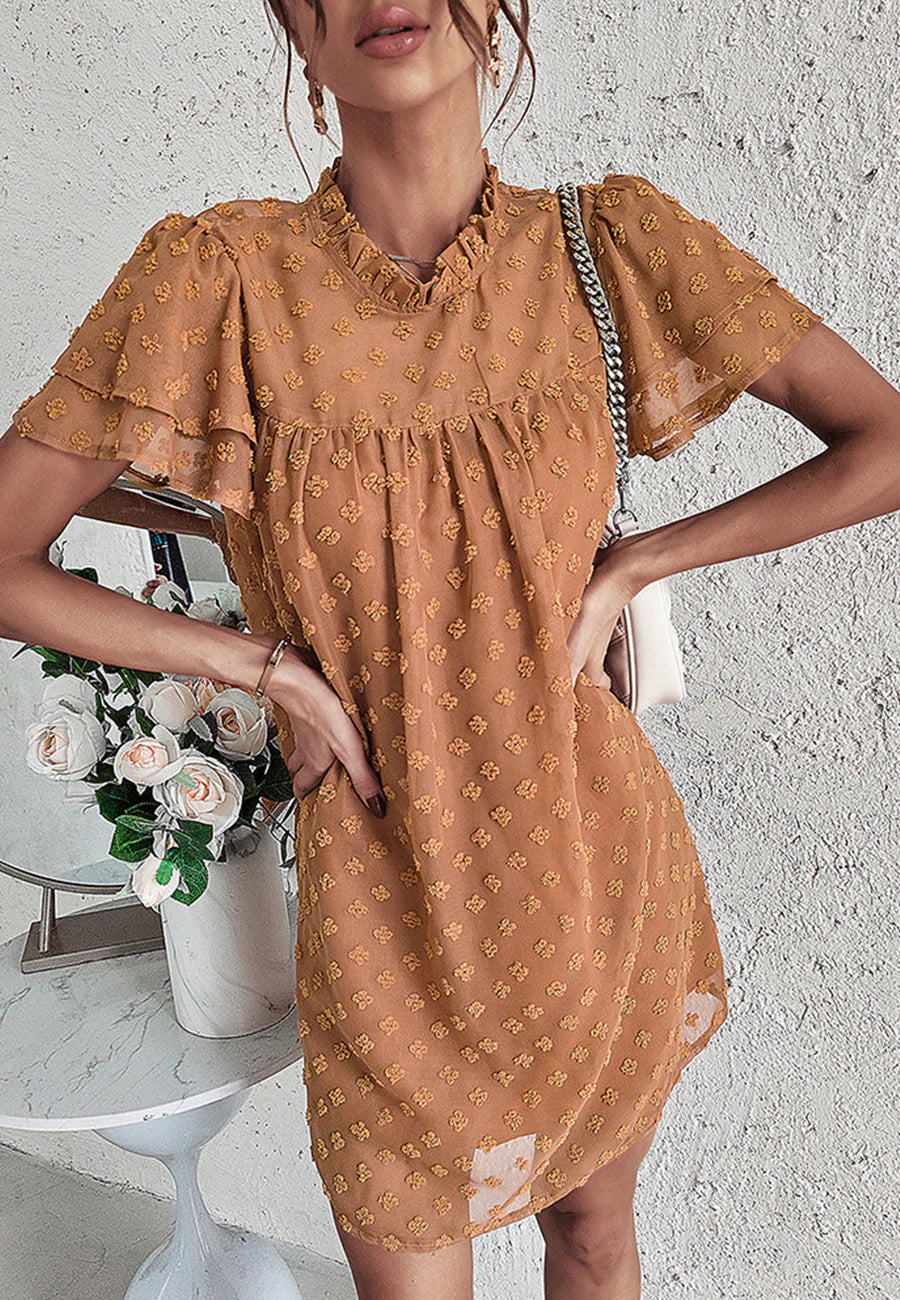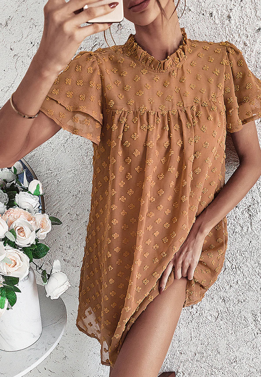 ??he Anna-Kaci dress is detailed with beautiful tiered flutter sleeves. Features a ruffle neck, sheer textured material, shift dress silhouette, and above knee length. Pair it with strappy sandals and a handbag for a gorgeous look.