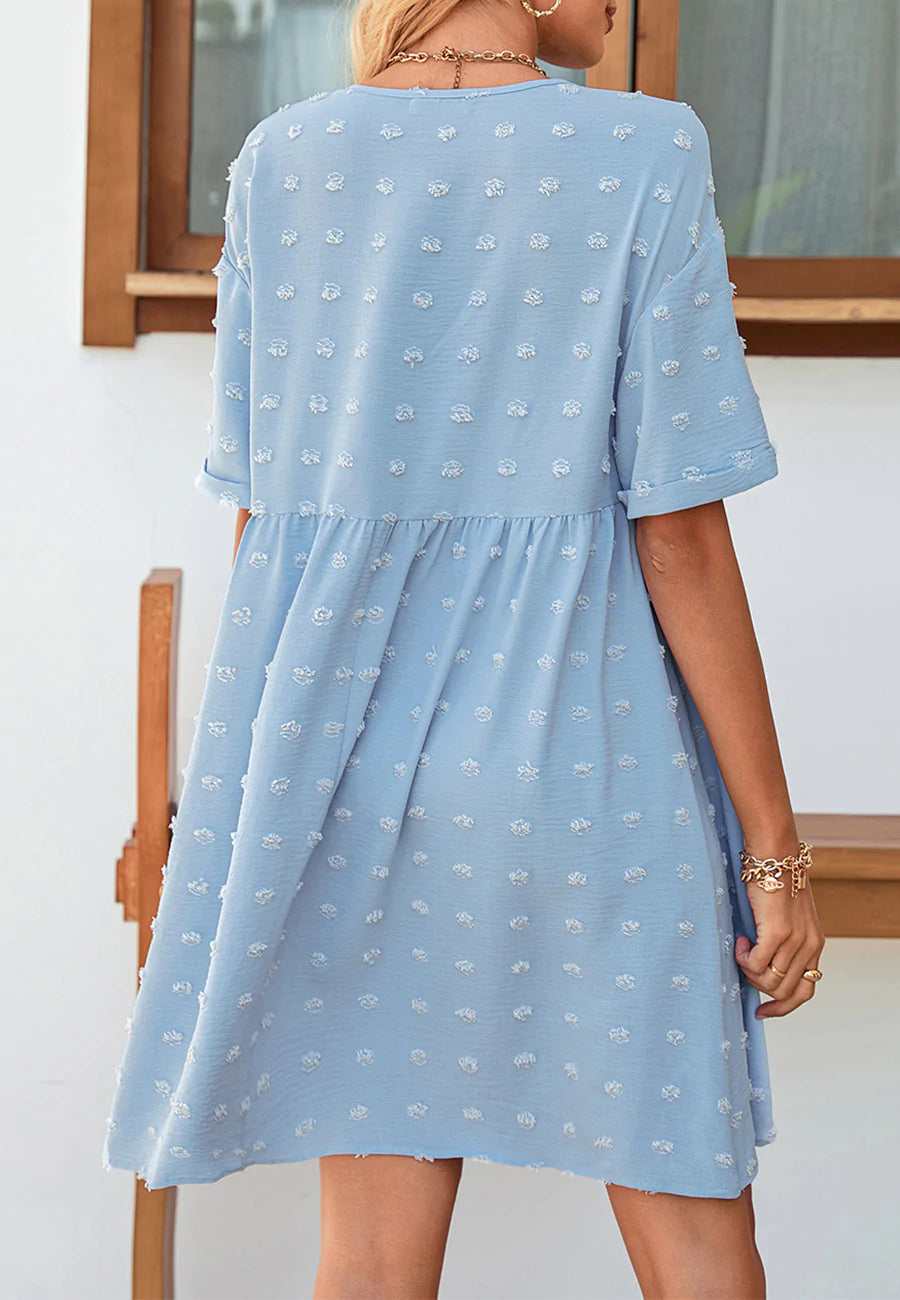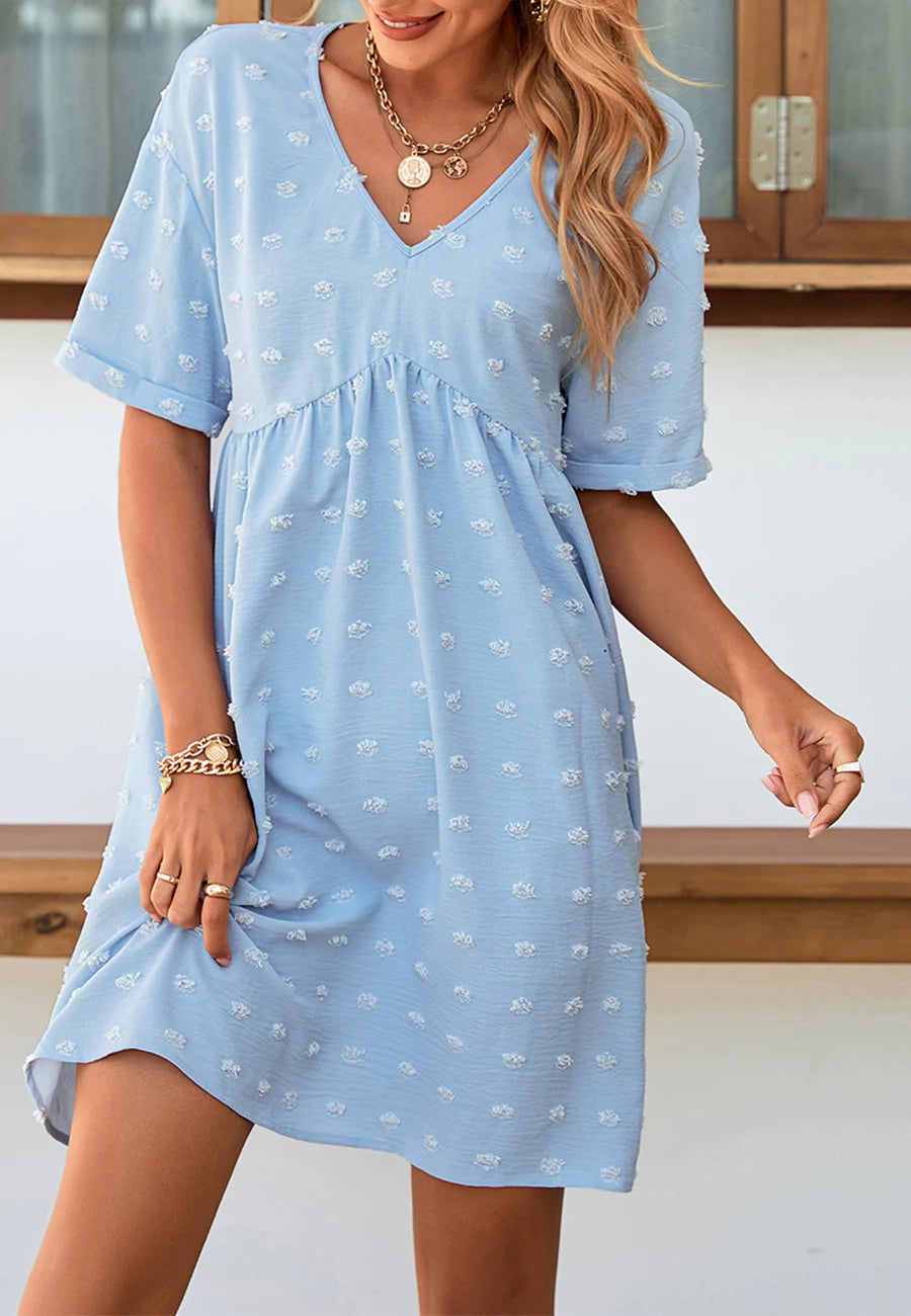 ??he Anna-Kaci dress is detailed with a classic v neck line. Features a swiss dot material. short sleeves, flowy skirt, and above knee length. Pair it with a dainty necklace and heels for a feminine look.