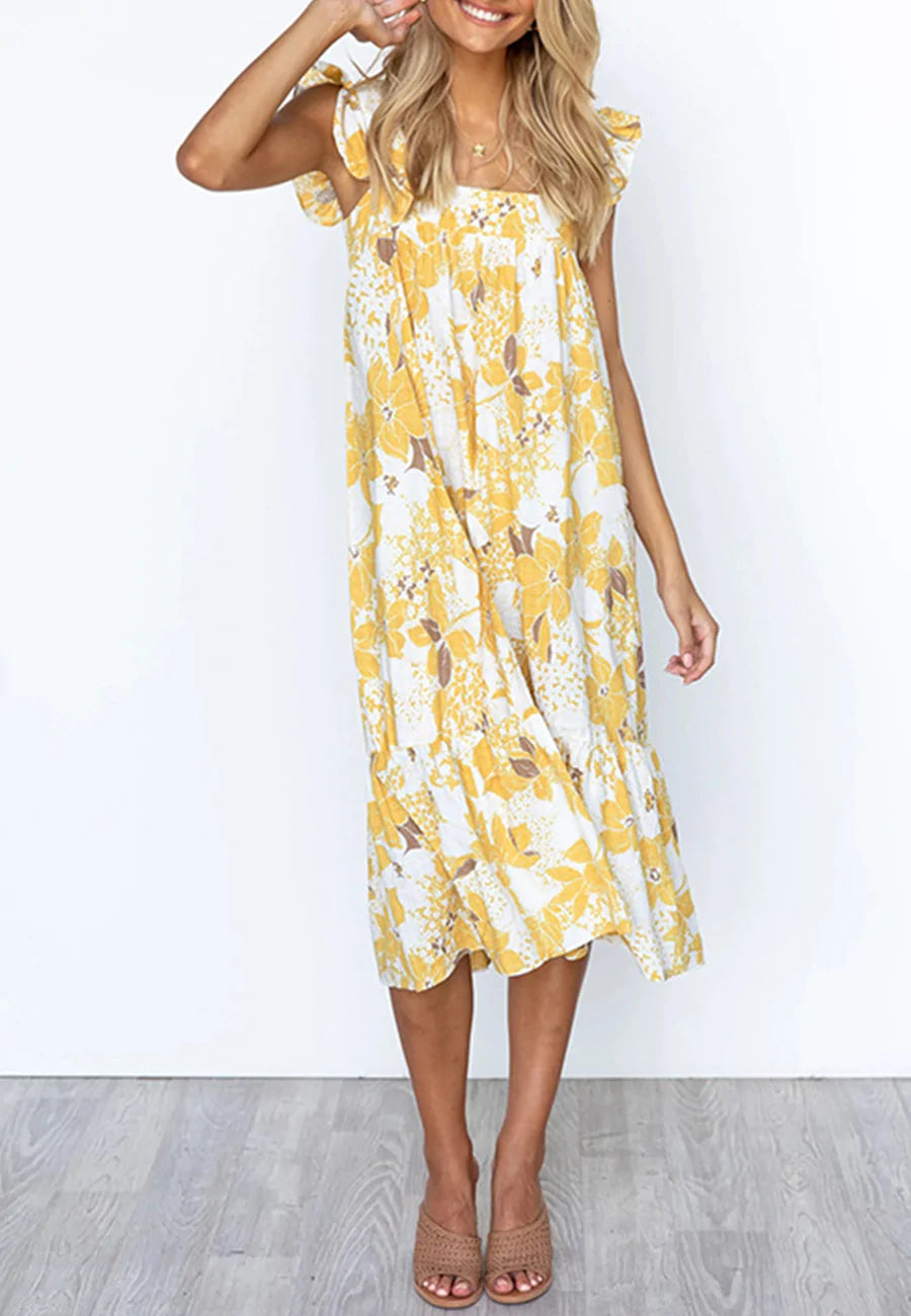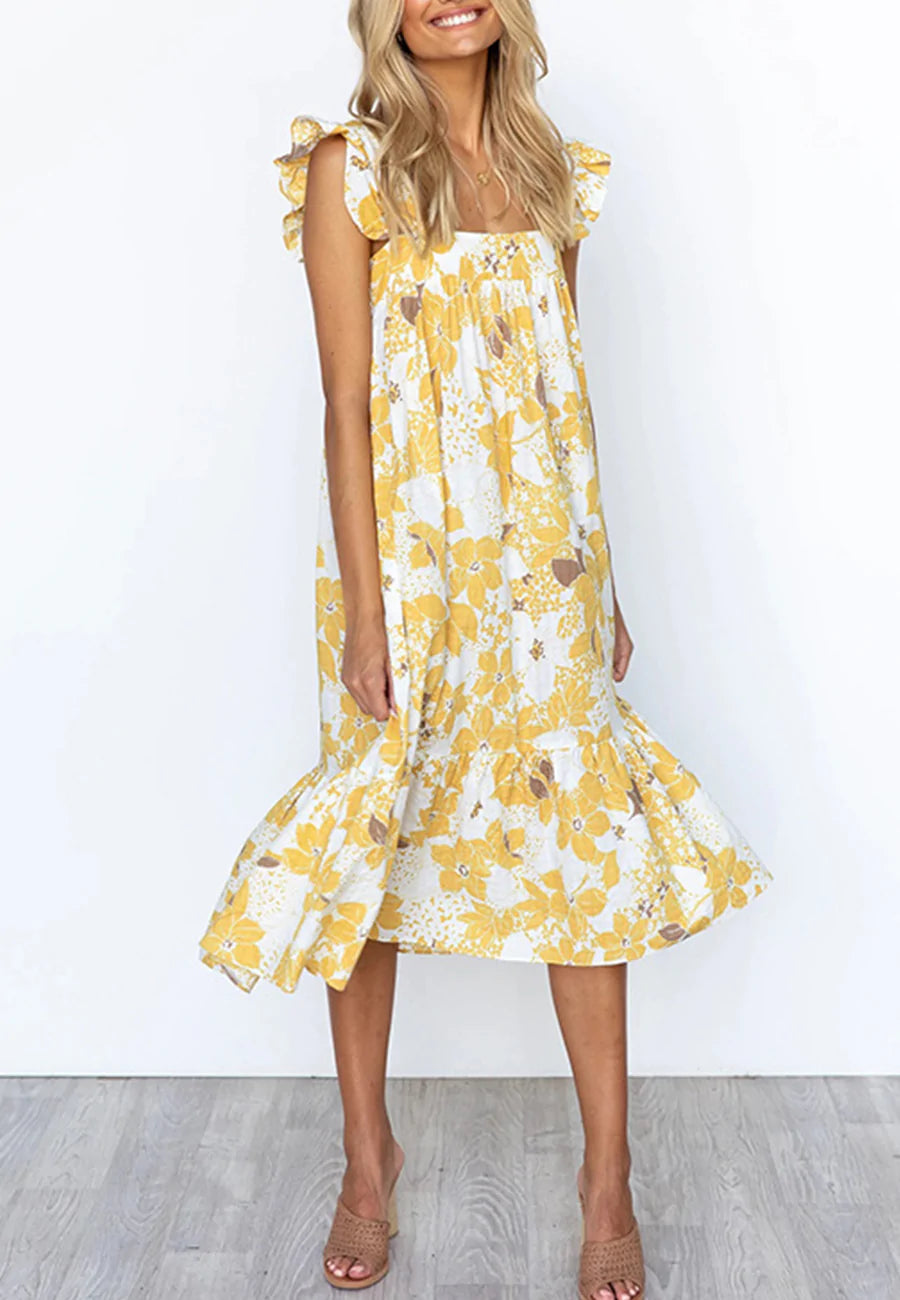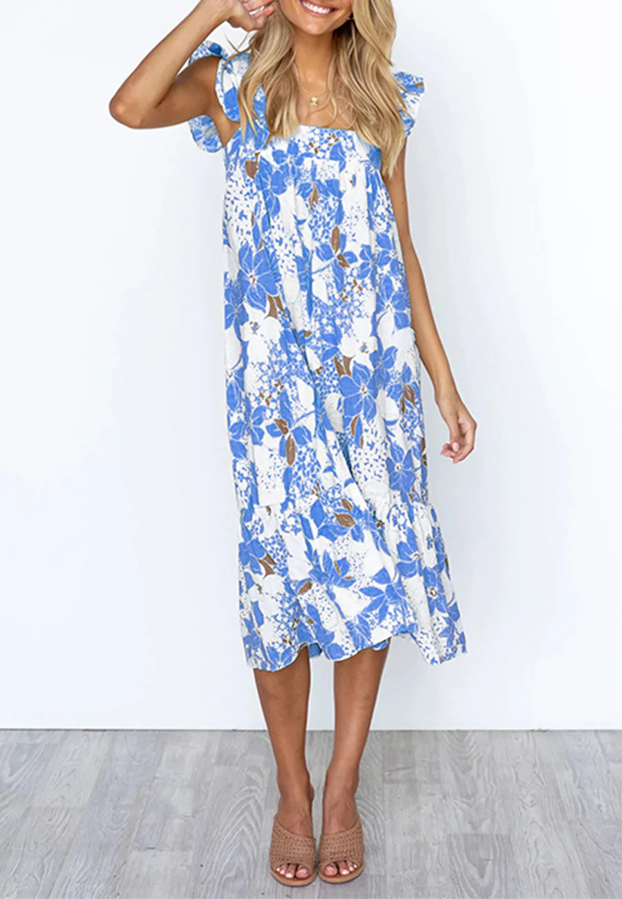 ??he Anna-Kaci dress is detailed with a cute ruffle shoulder straps. Features a straight neck line, floral prints, sleeveless, straight cut silhouette, ruffle hem, and below knee length. Pair it with a straw bag and strappy sandals for a fabulous summer look.