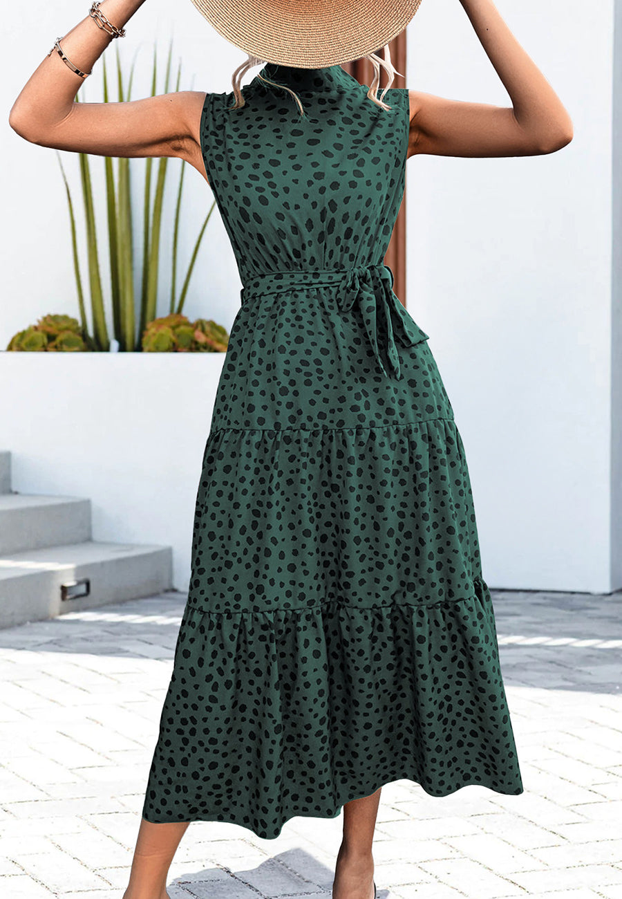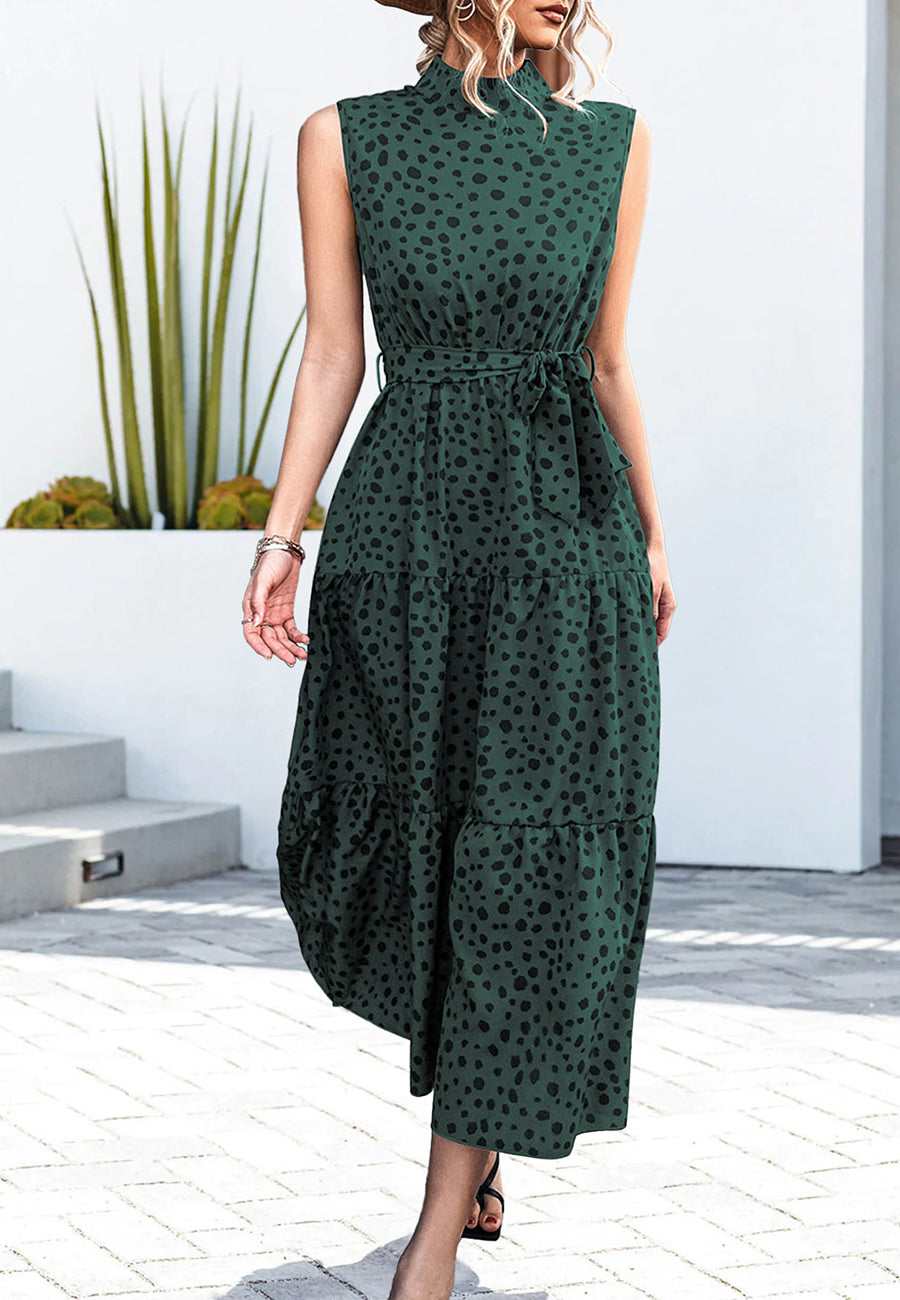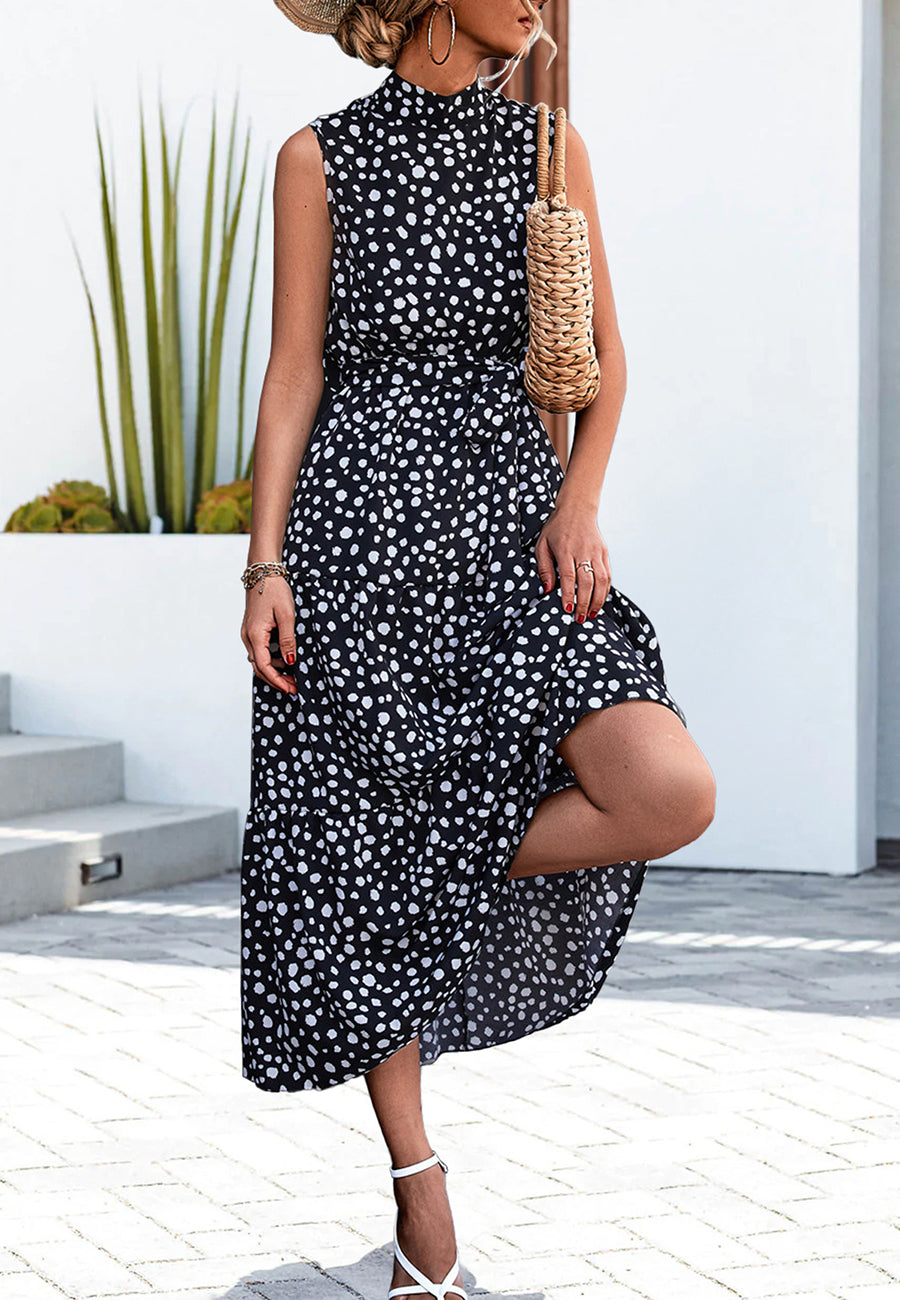 ??he Anna-Kaci dress is detailed with a bold cheetah print. Features a high neck line, sleeveless, tiered skirt, tie waist detail, and above ankle length. Pair it with a handbag and heels for an elegant look.