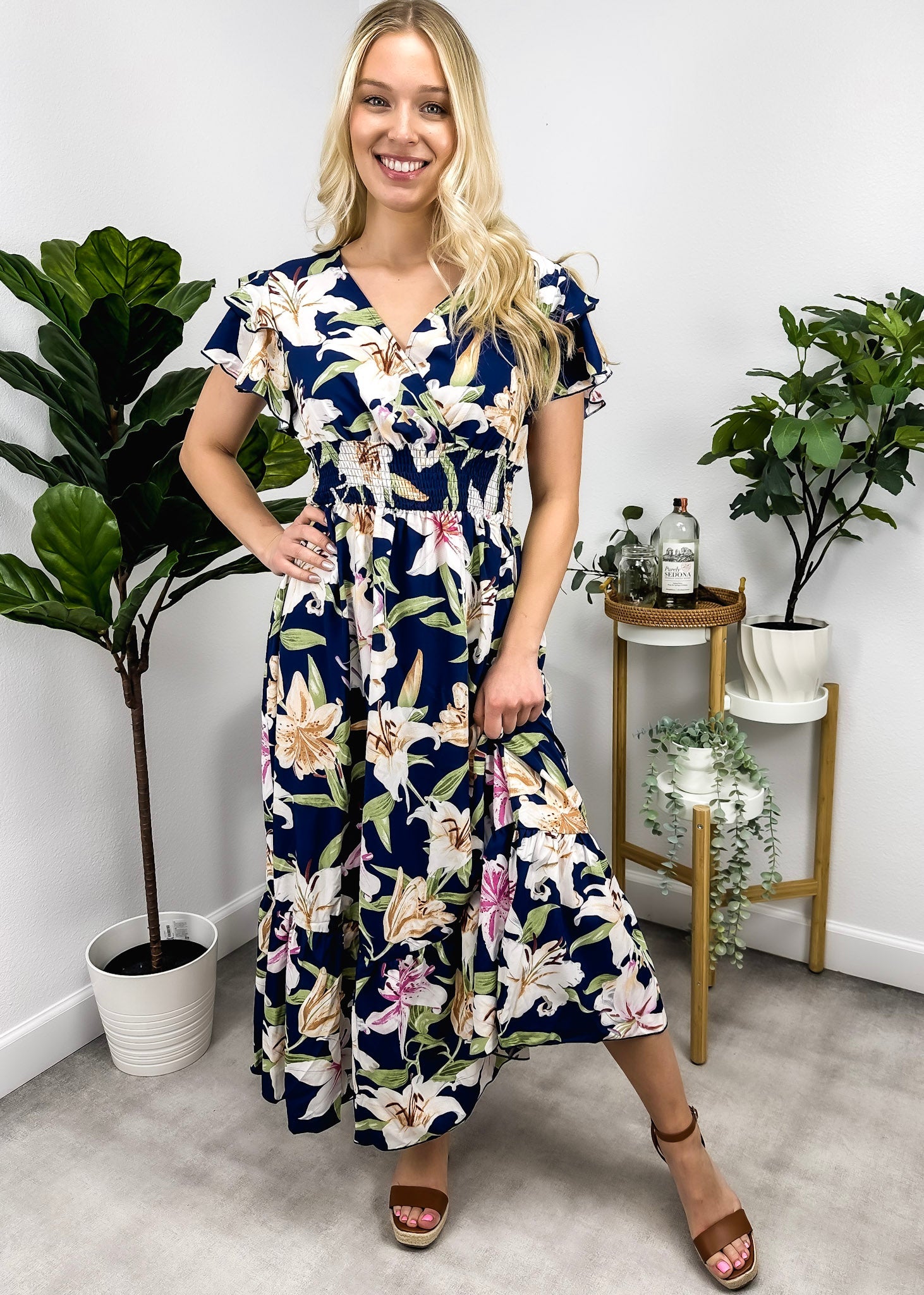 The Anna-Kaci dress is detailed with a flattering shirred waist. Features a floral print, surplice neck line, ruffle sleeves, flowy skirt, and mid-calf length. Pair it with a necklace and stilettos for an elegant look.