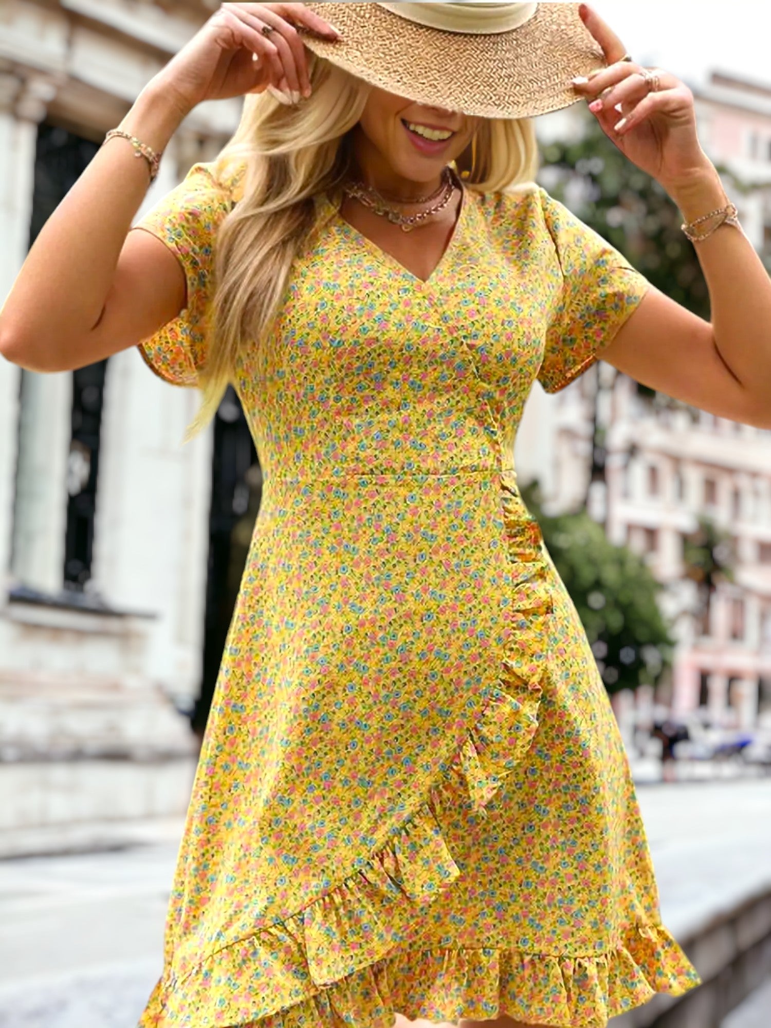 The Anna-Kaci dress is detailed with beautiful ruffle details. Features a floral print, surplice neck line, short sleeves, A-line silhouette, and above knee length. Pair it with tassel earrings and sandals for a cute look.