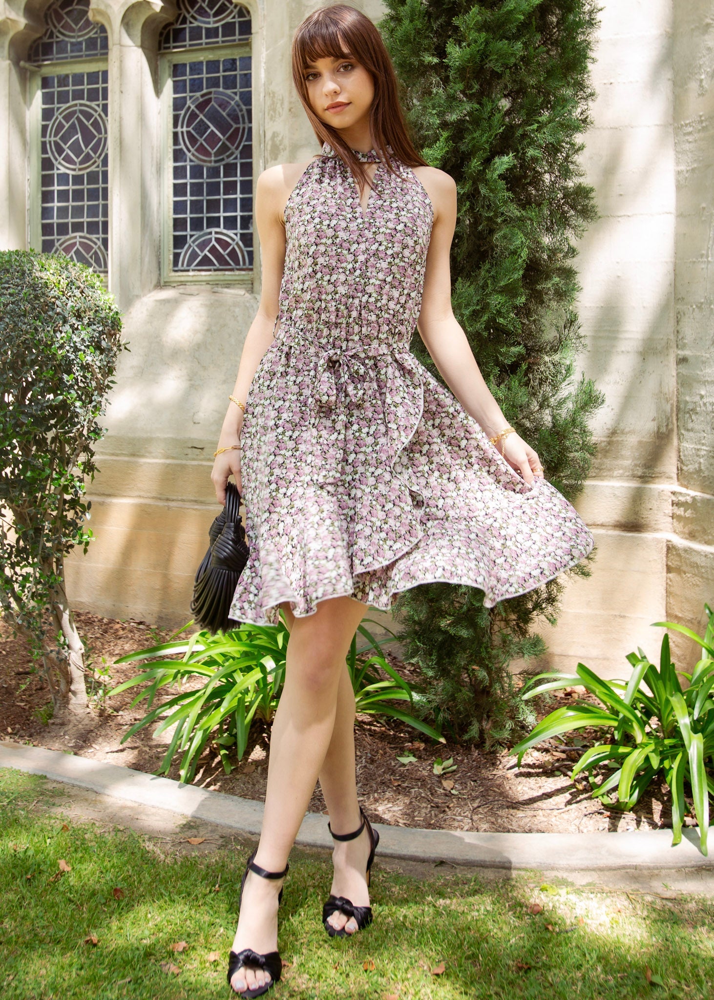 The Anna-Kaci dress is detailed with a cool cutout front design. Features a floral print, halter neck line, tie waist detail, ruffle hem, and above knee length. Pair it with a bandana and sandals for a lovely look.