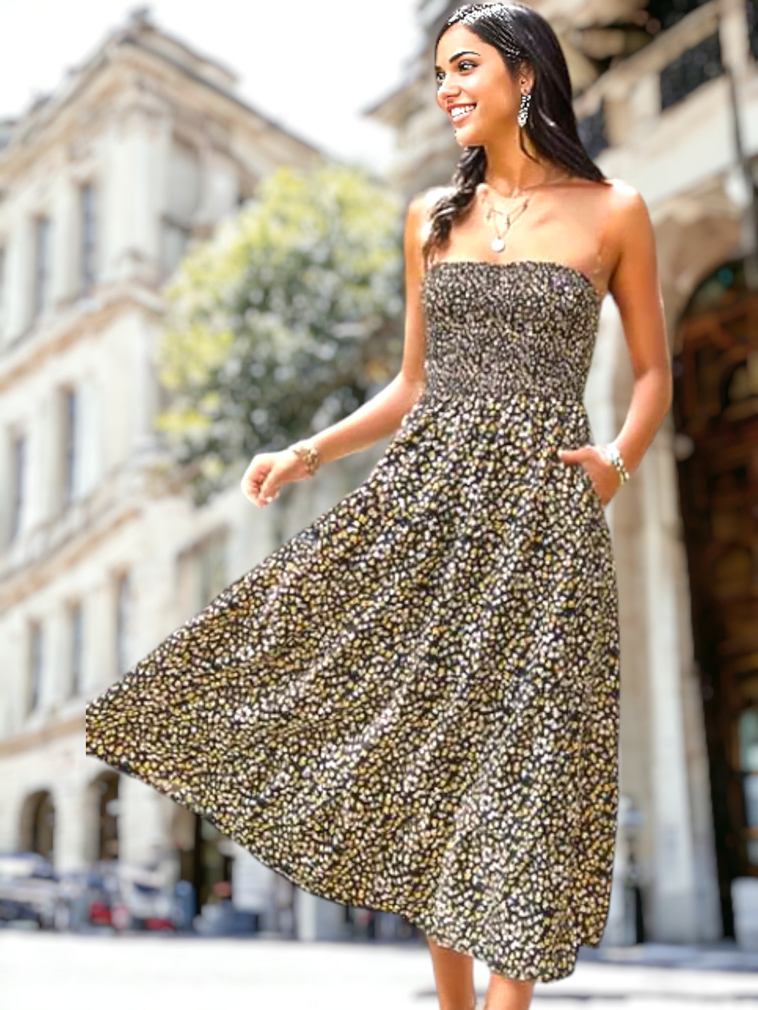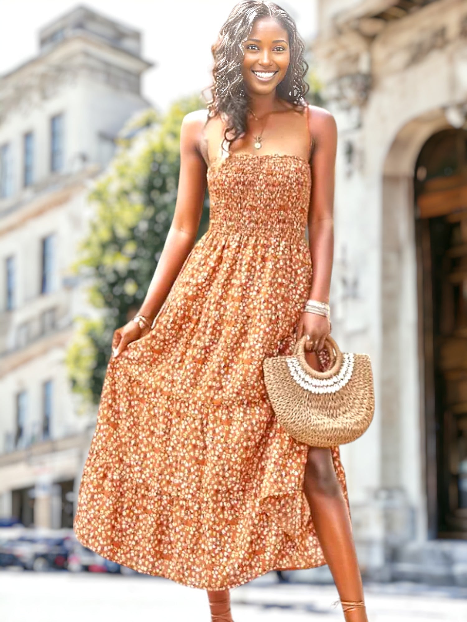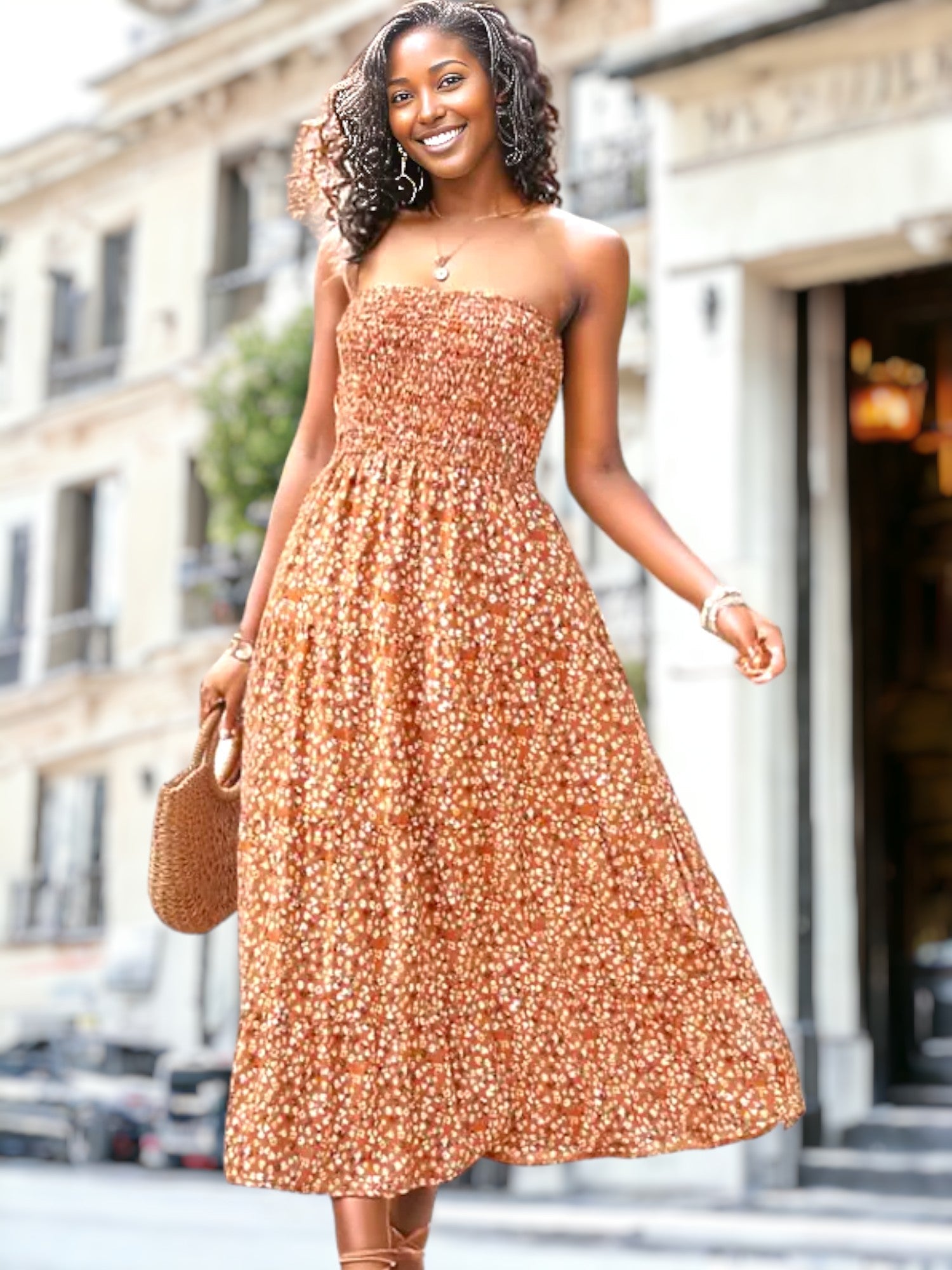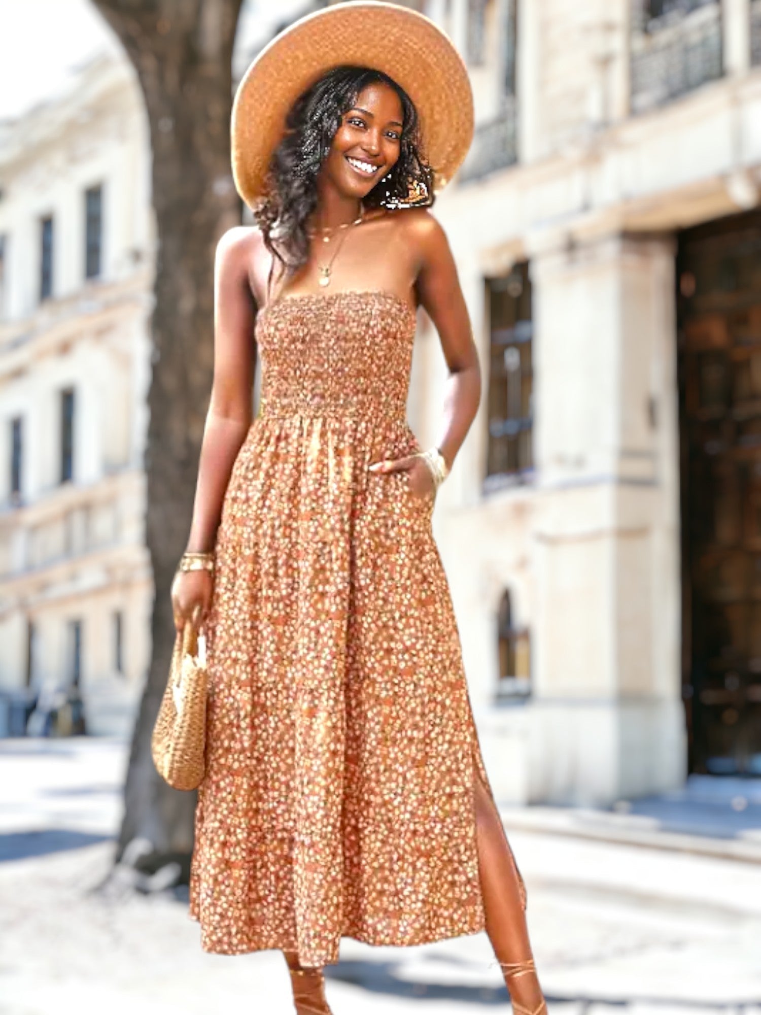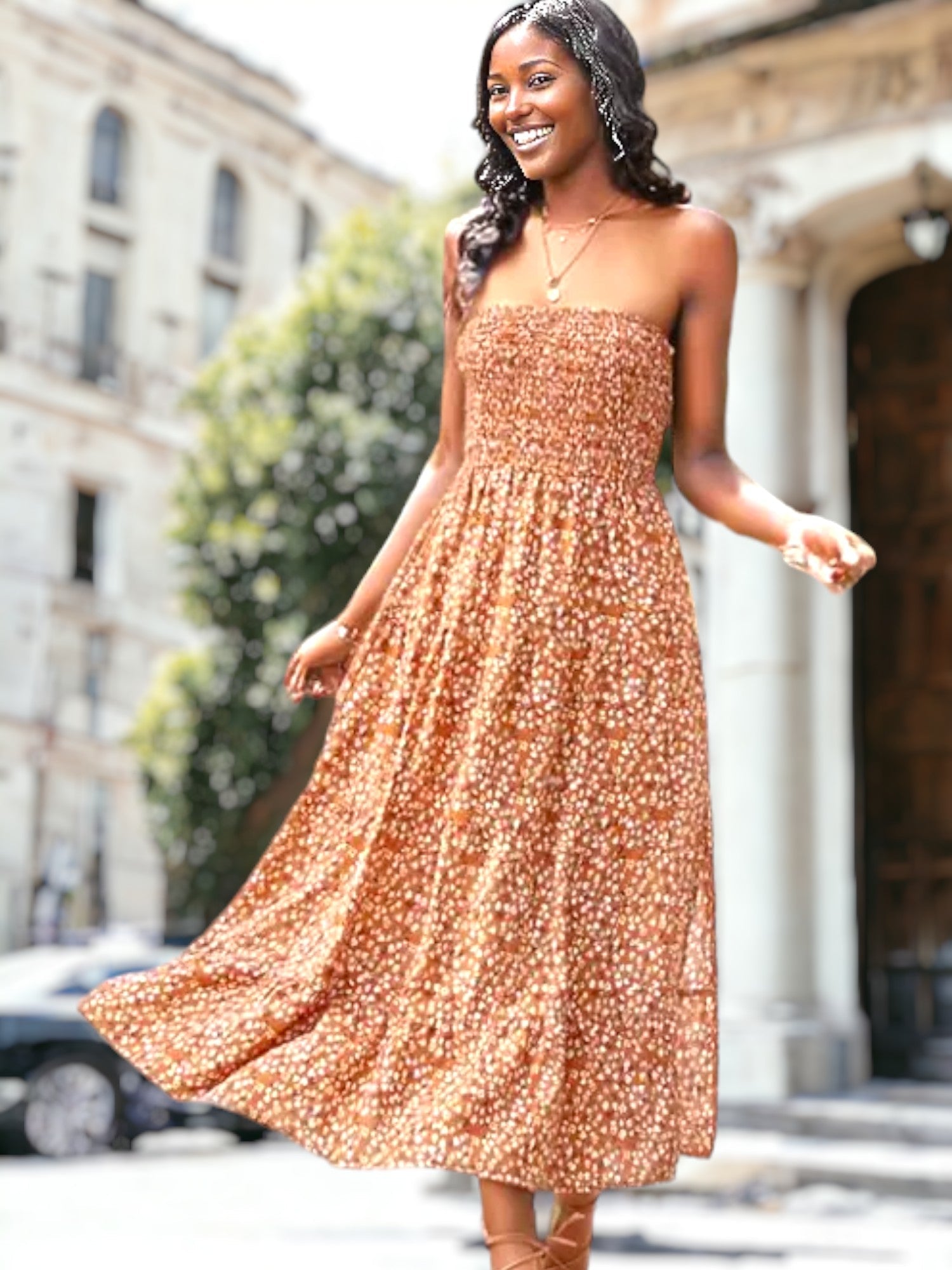 The Anna-Kaci dress is detailed with feminine floral prints. Features a strapless design, straight neck line, tiered design, side slit, and mid-calf length. Pair it with a necklace and heels for a stunning look.