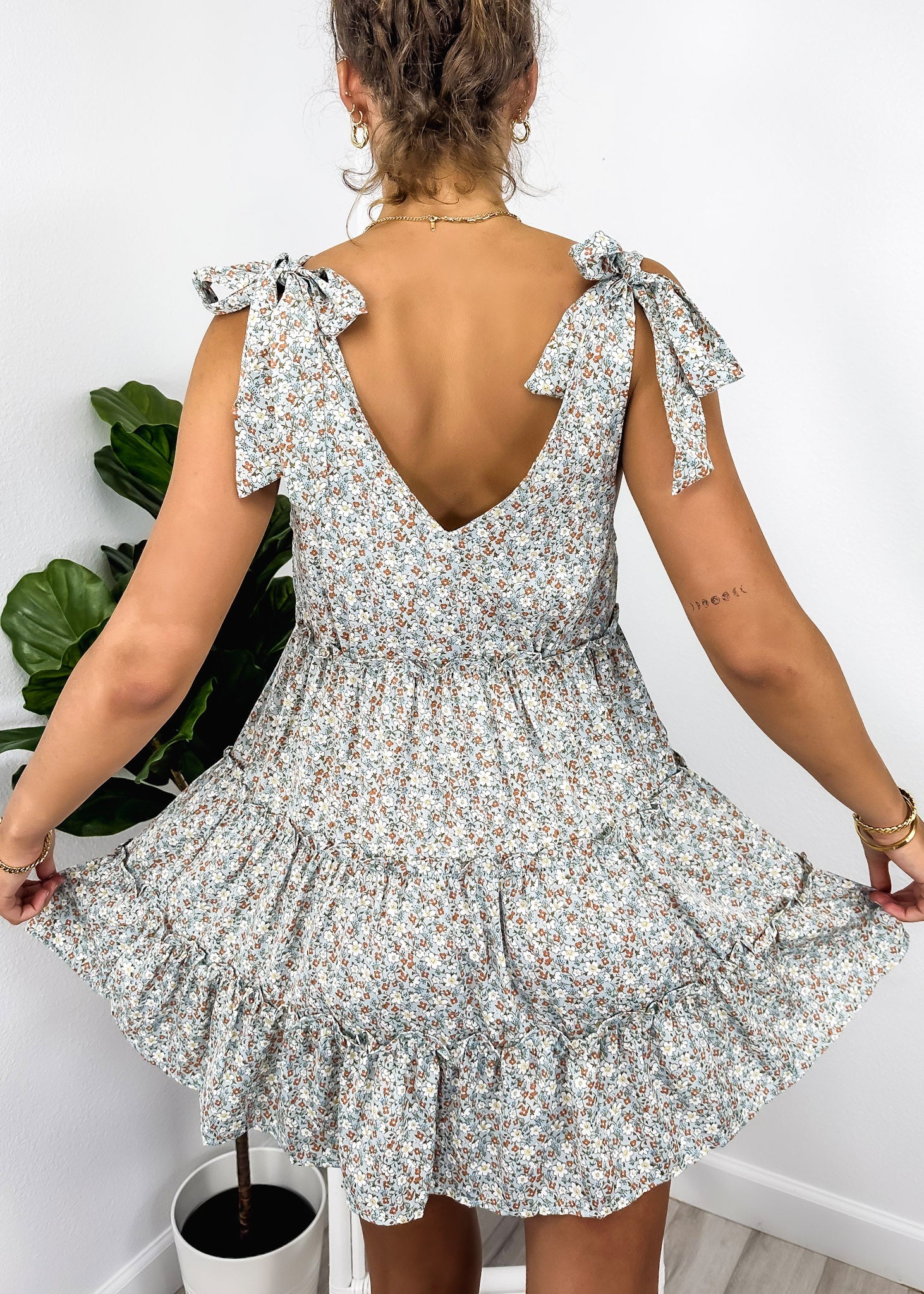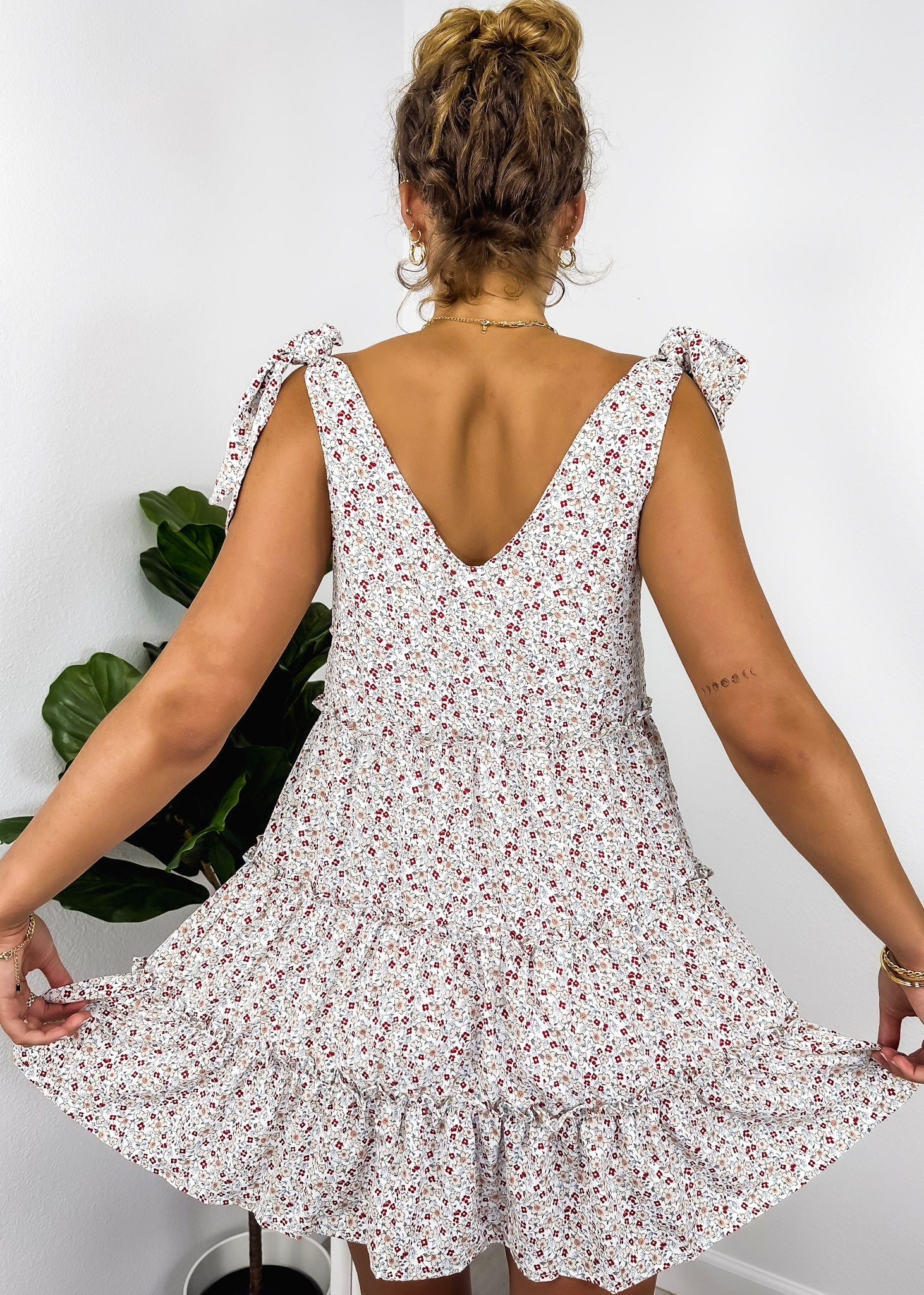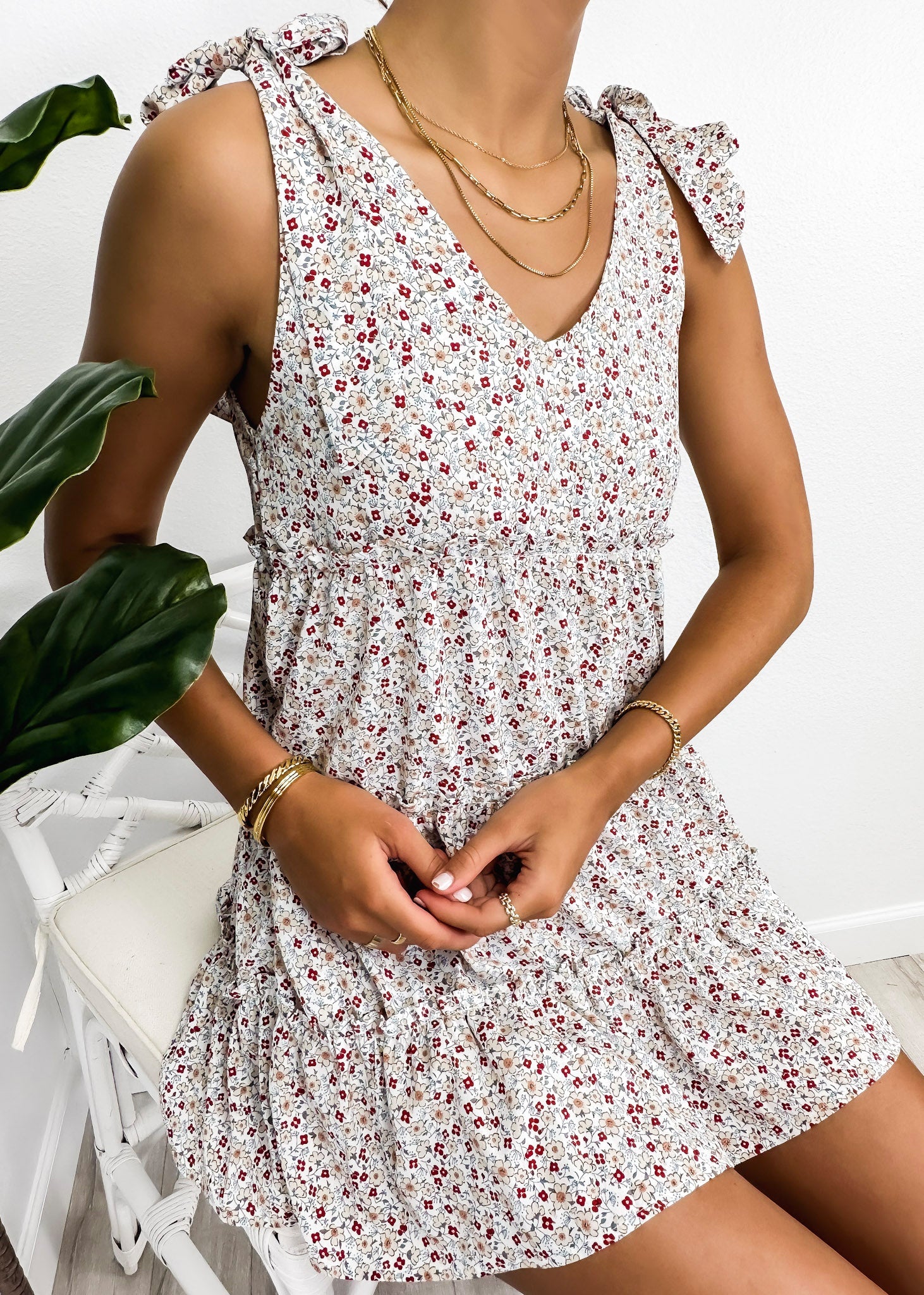 The Anna-Kaci dress is detailed with a cute ruffle tiered design. Features a floral print, plunge neck line, tie shoulder detail, A-line silhouette, and above knee length. Pair it with a necklace and heels for a stunning look.