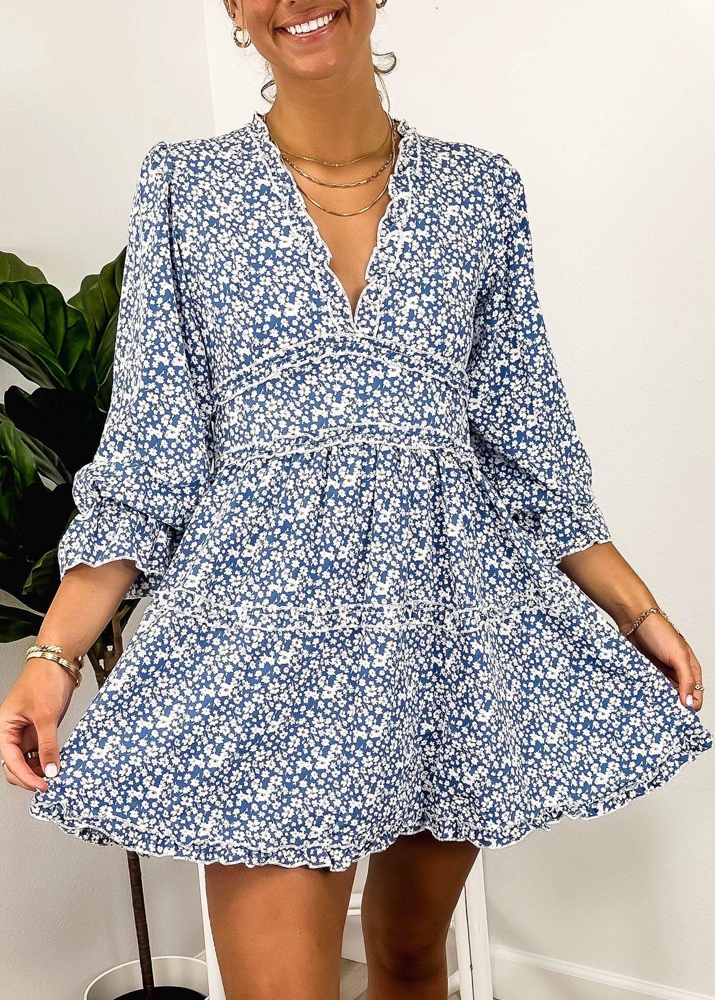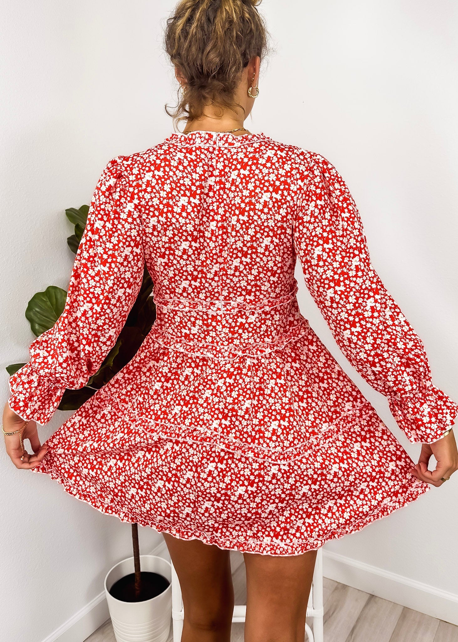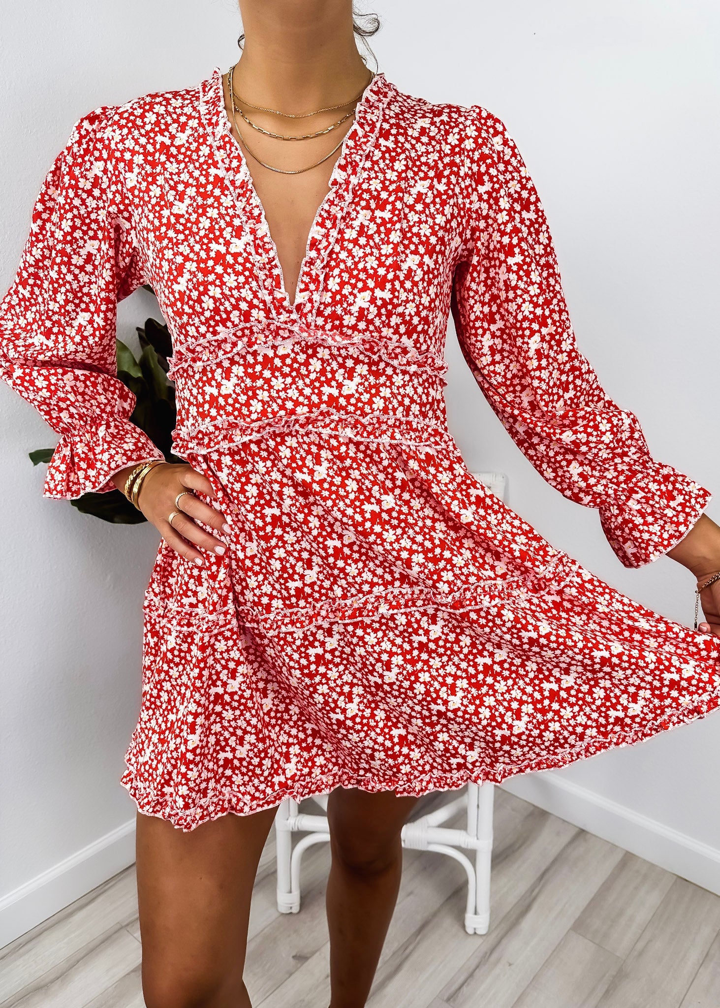 The Anna-Kaci dress is detailed with a cute ruffle detail. Features a floral print, plunge neck line, bishop sleeves, flowy skirt, and above knee length. Pair it with a hair bow and heels for a feminine look.