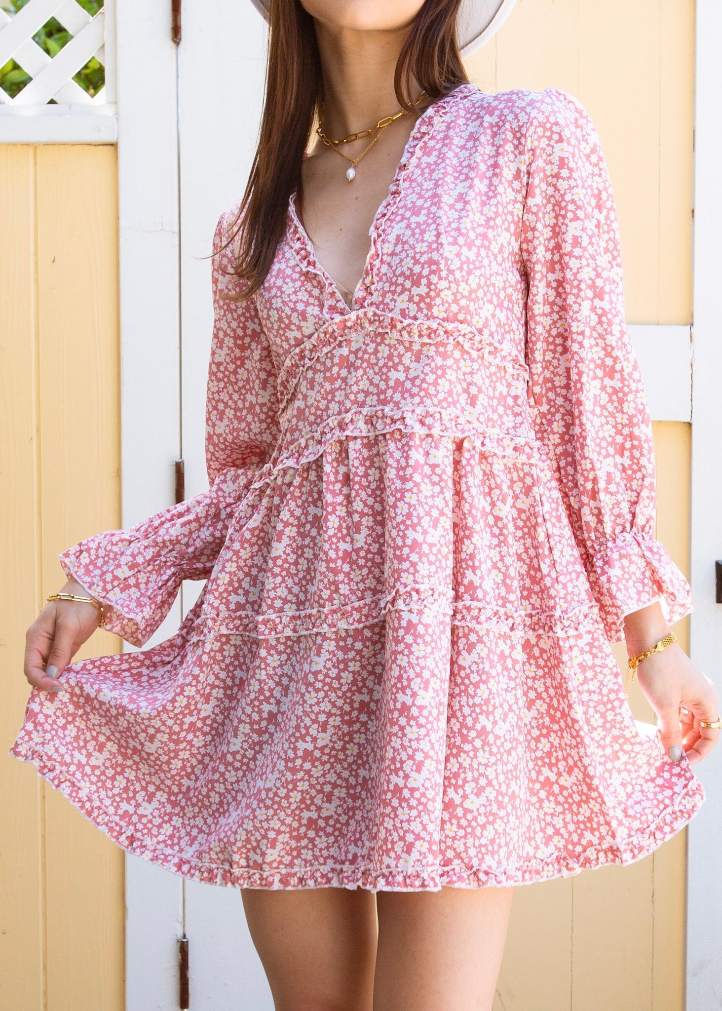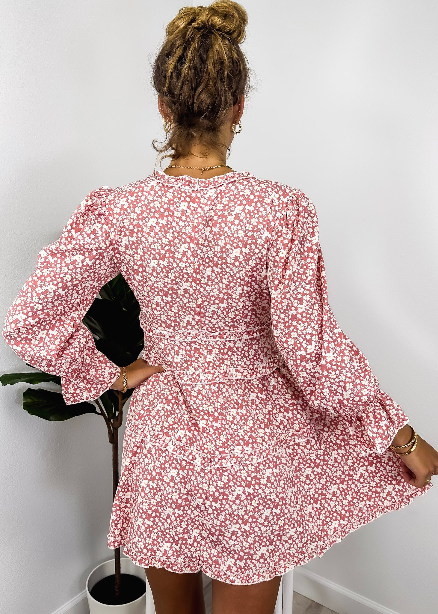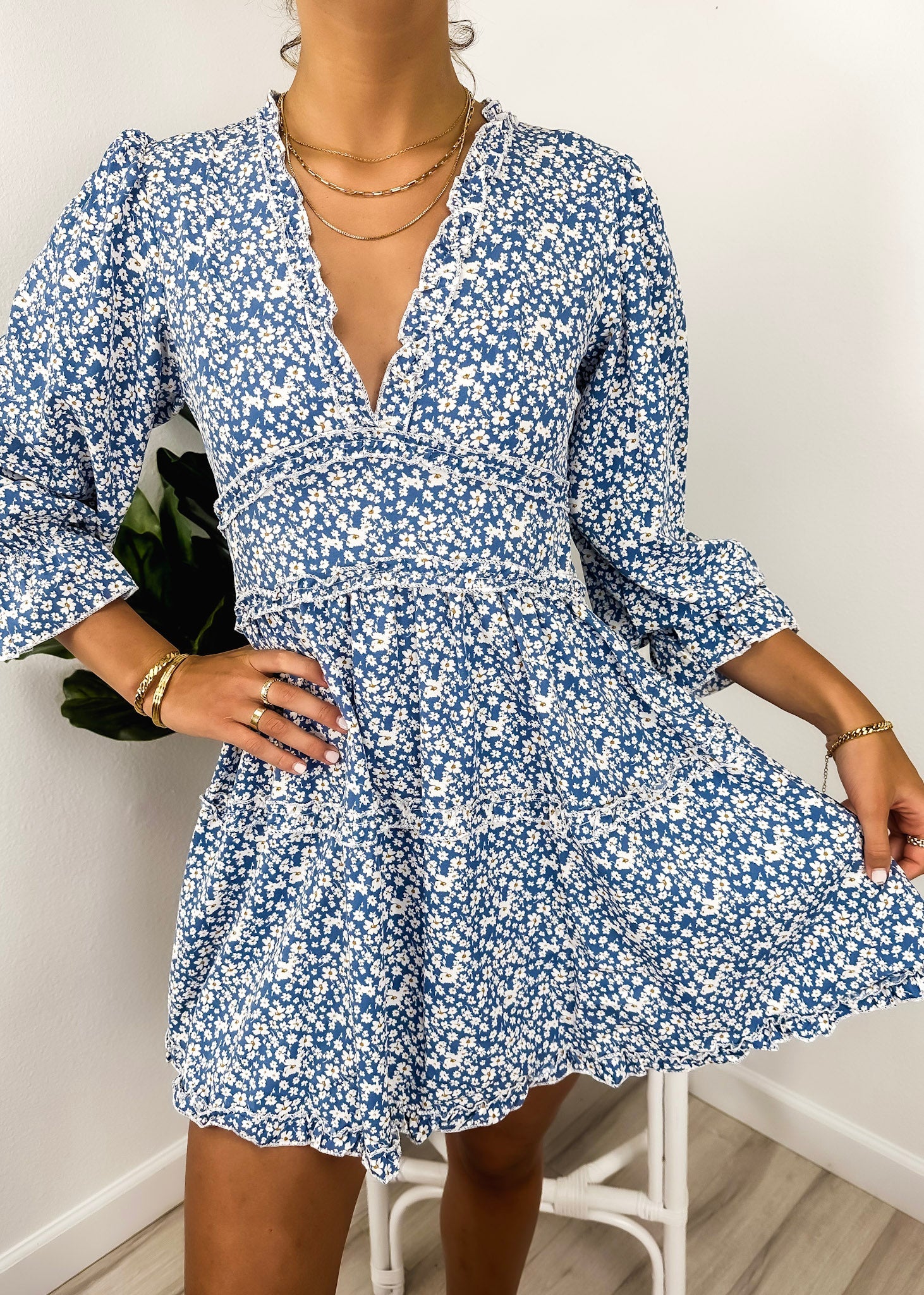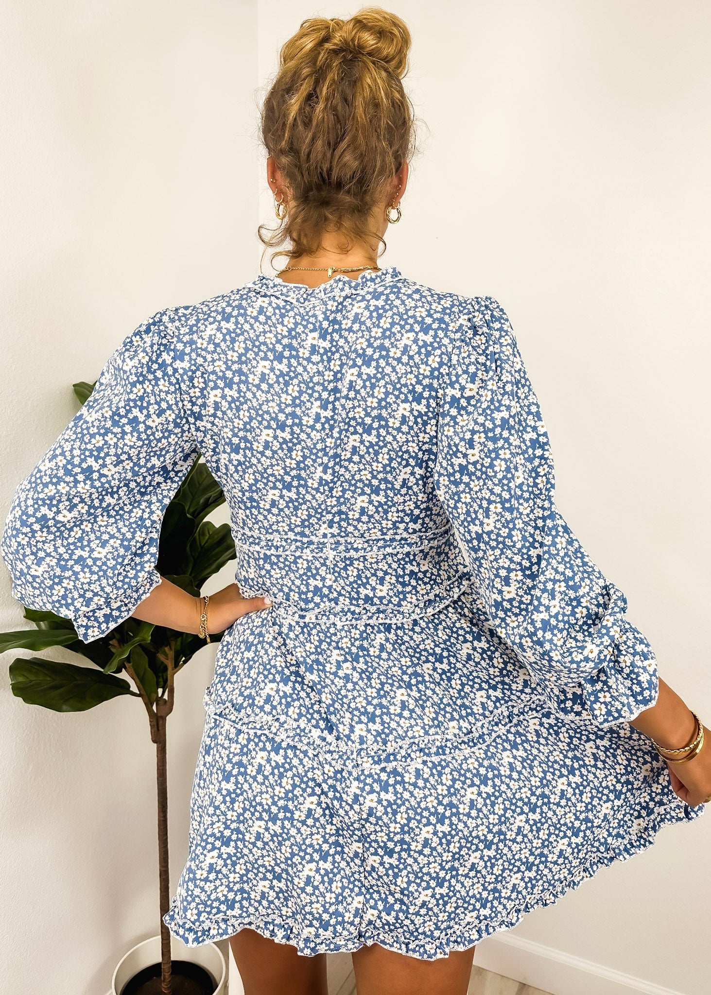 The Anna-Kaci dress is detailed with a cute ruffle detail. Features a floral print, plunge neck line, bishop sleeves, flowy skirt, and above knee length. Pair it with a hair bow and heels for a feminine look.