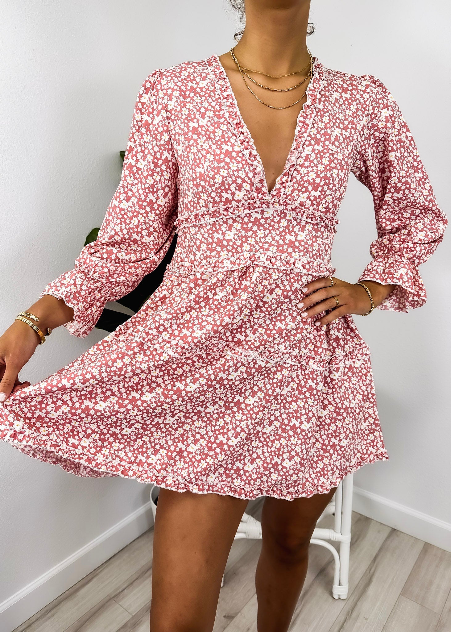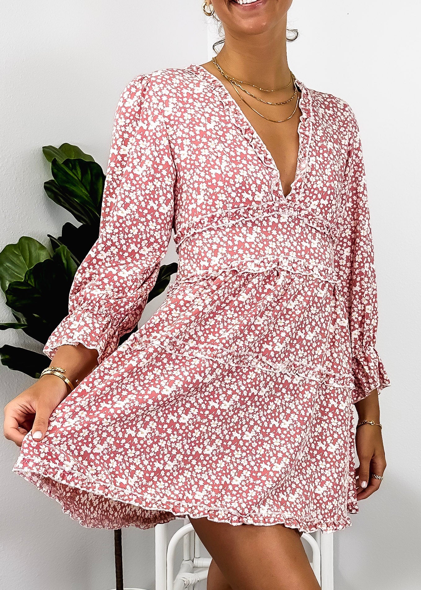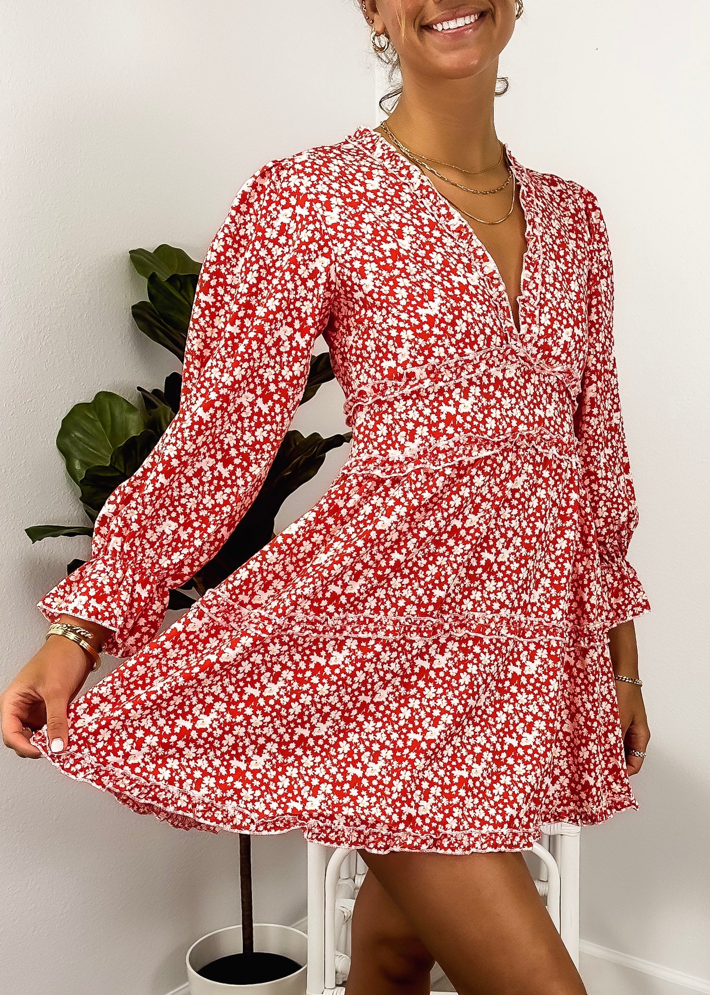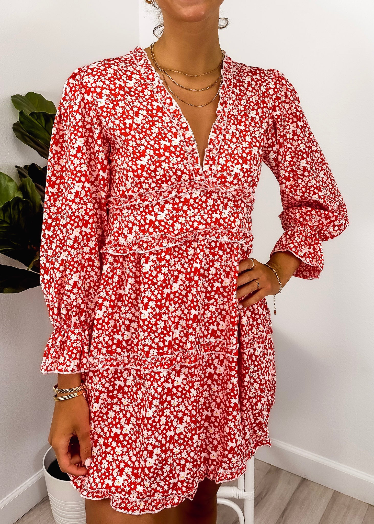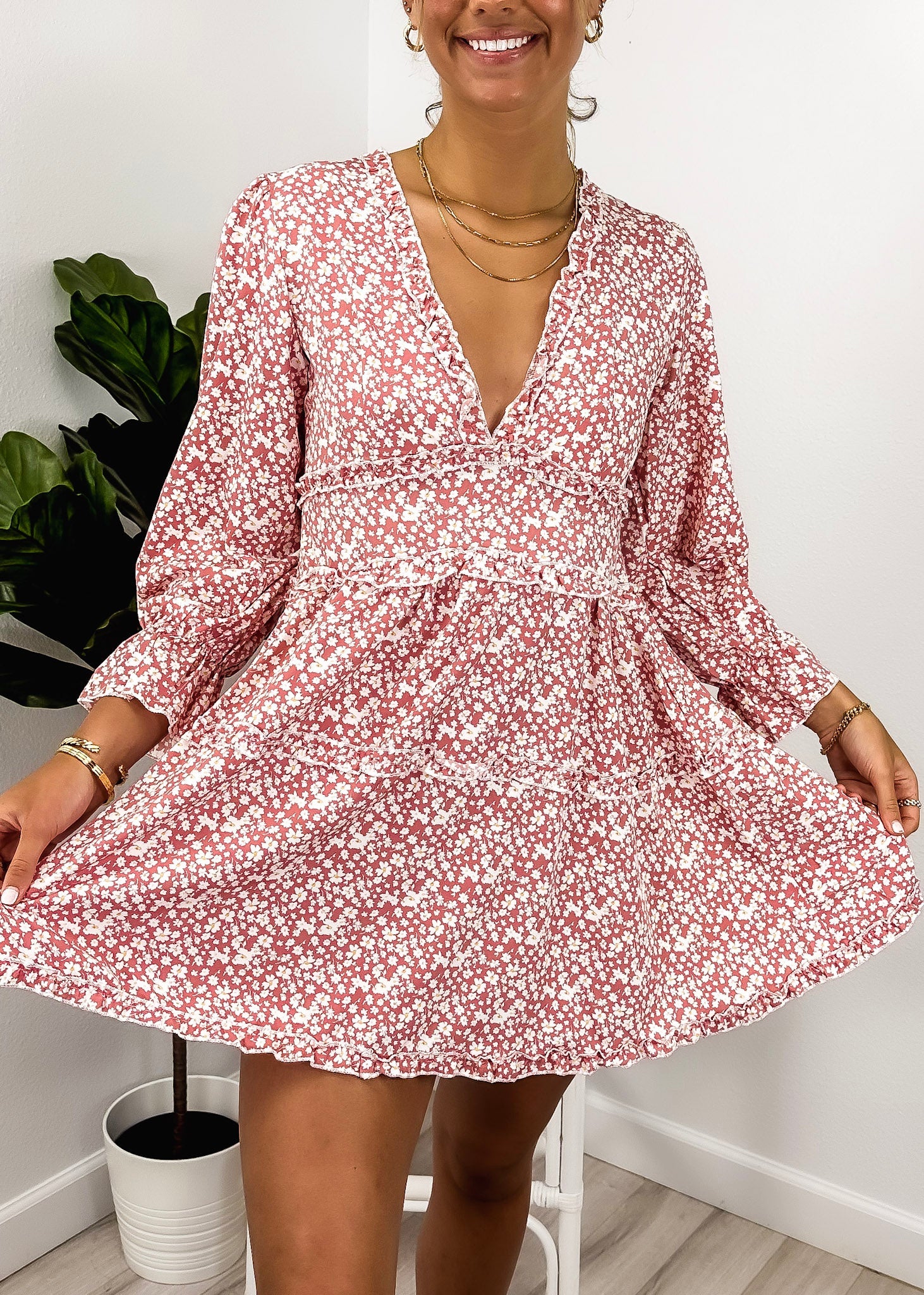 Ruffle Plunge Neck Floral Dress