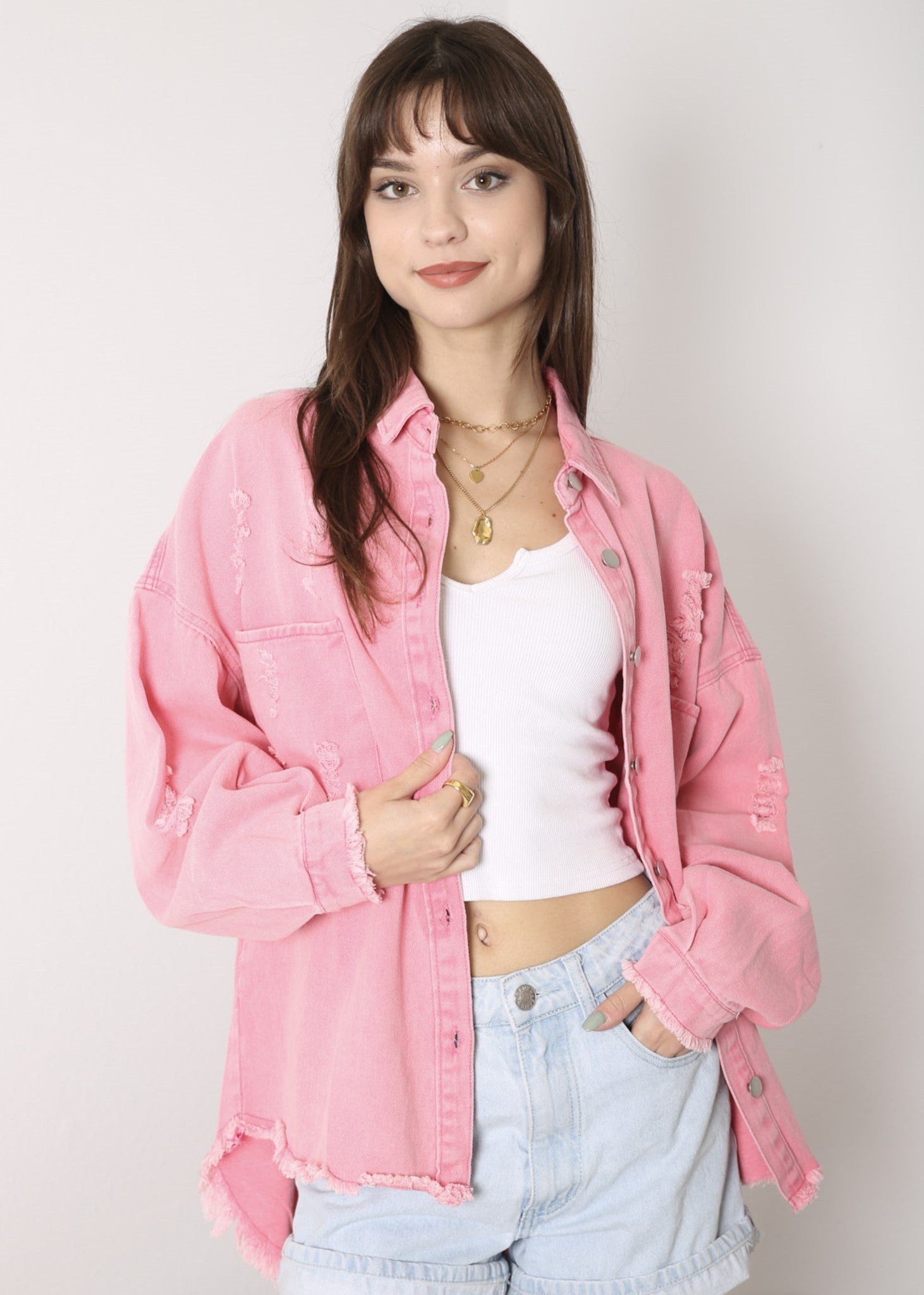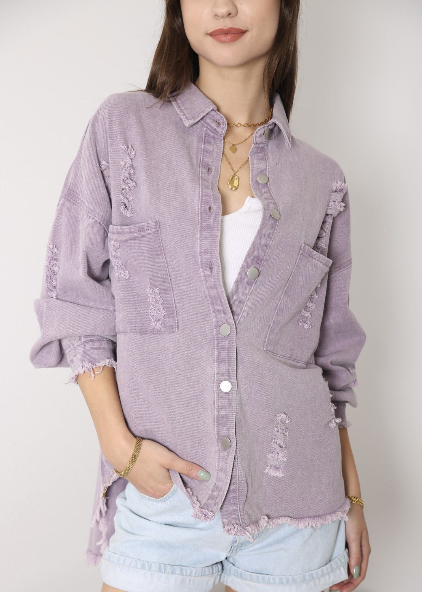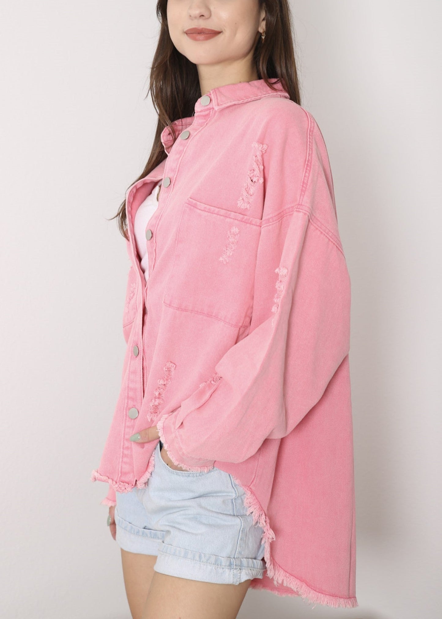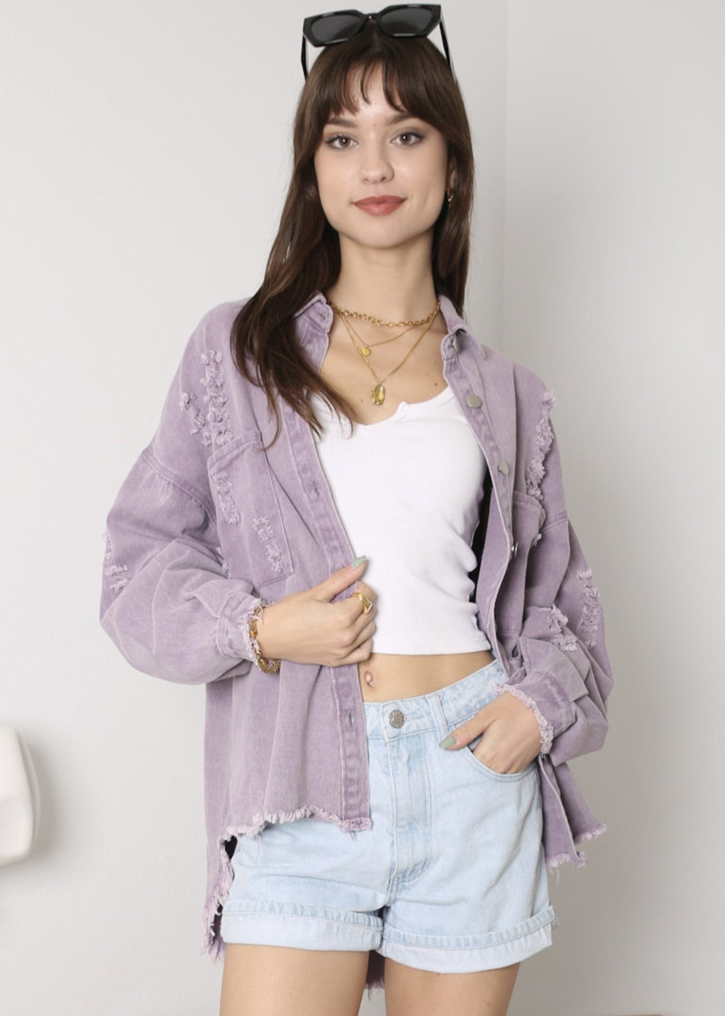 The Anna-Kaci distressed denim jacket features a casual loose fit, button closure, and classic jean jacket shapes.