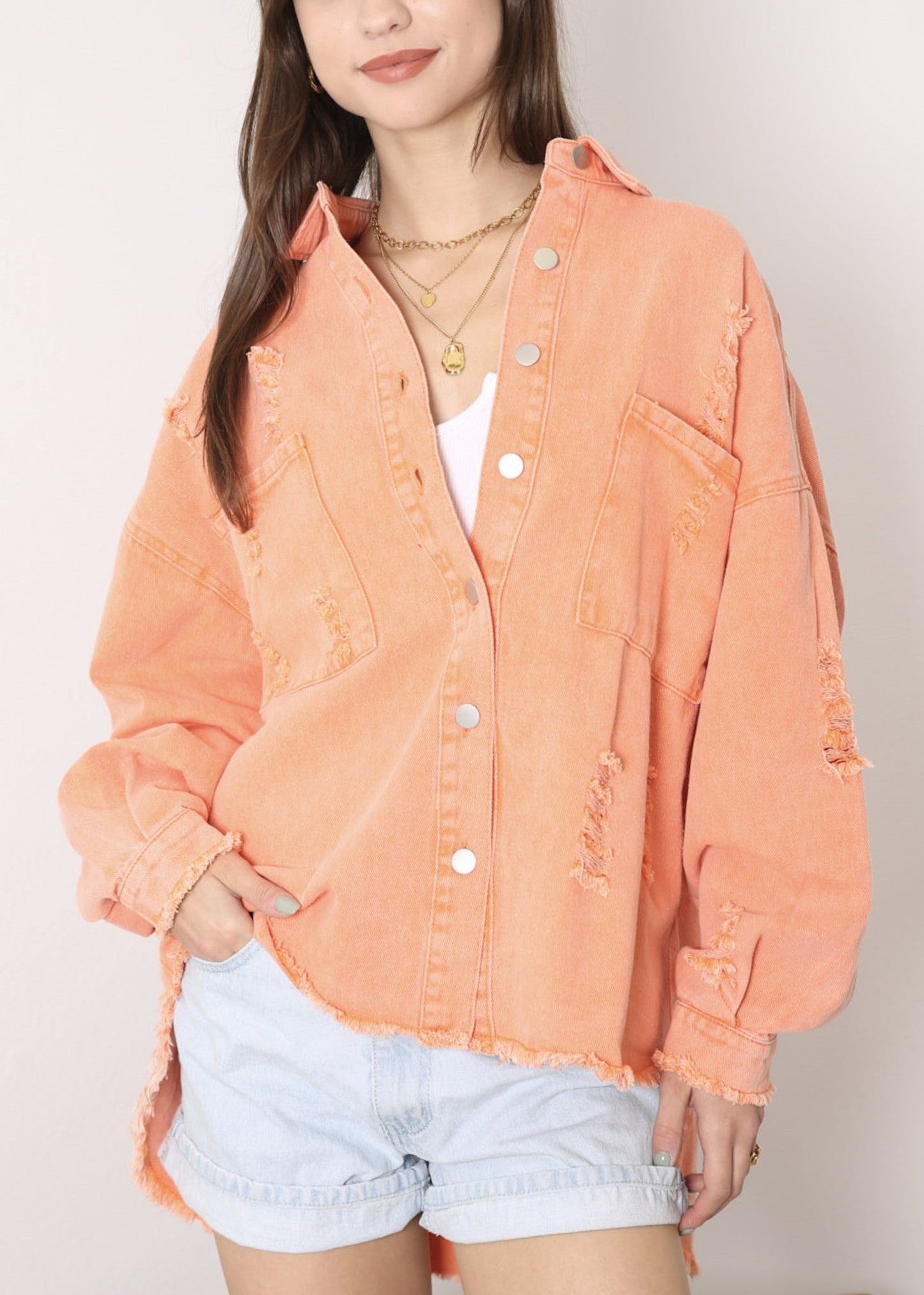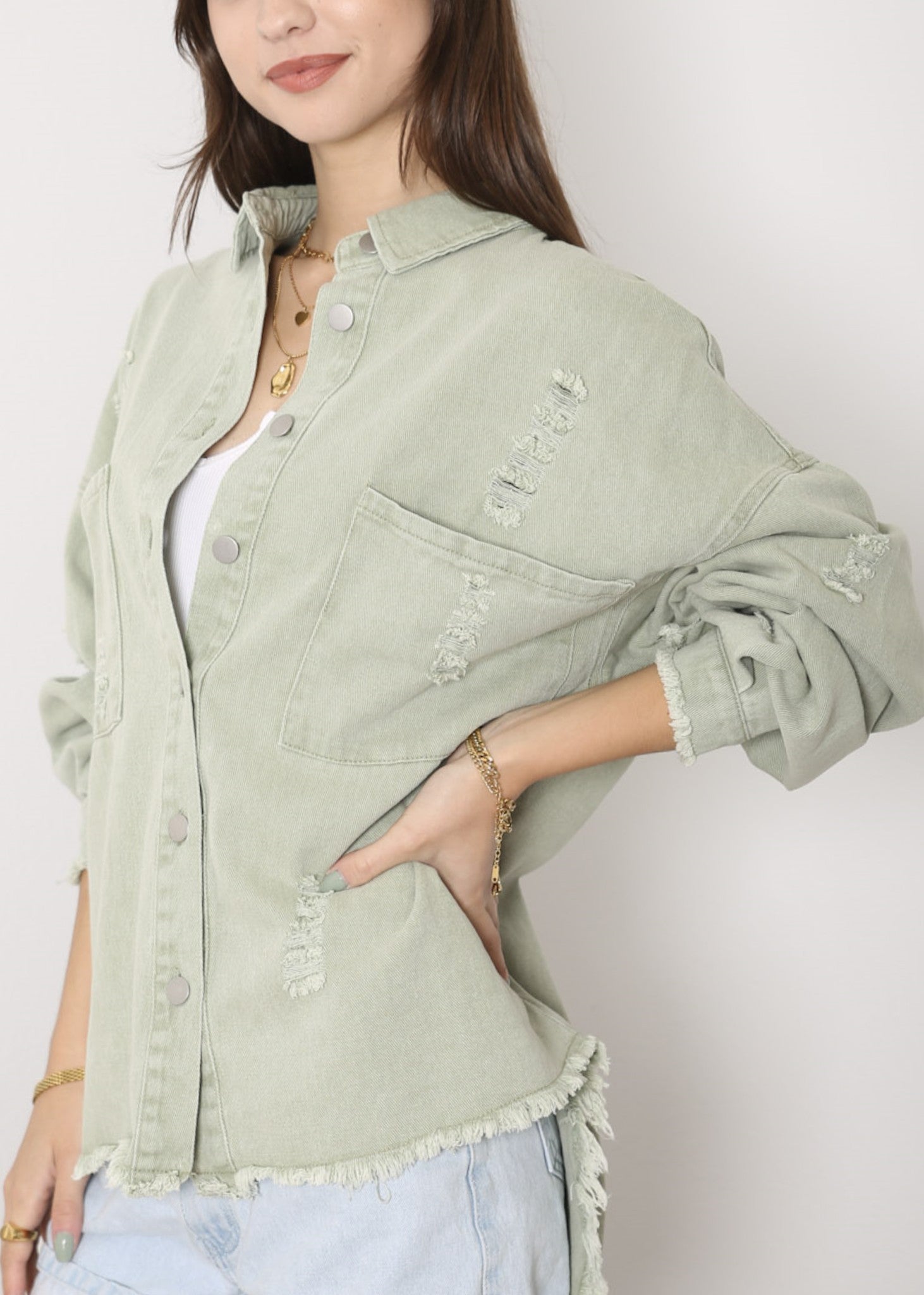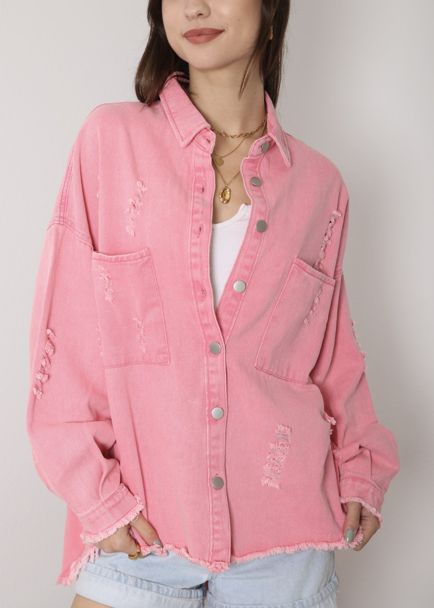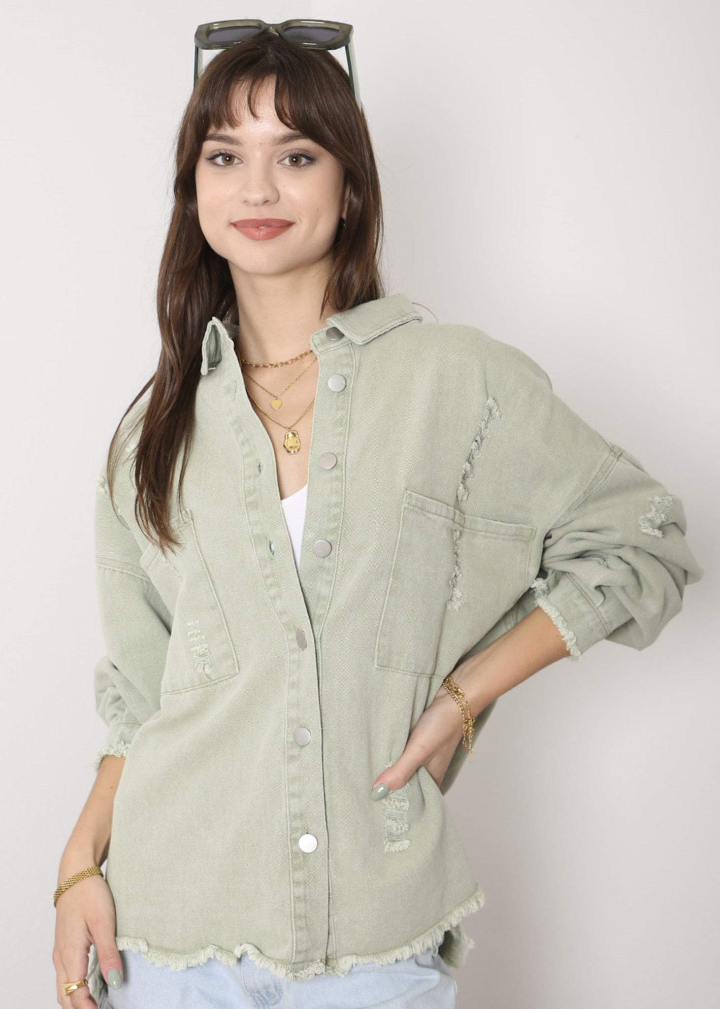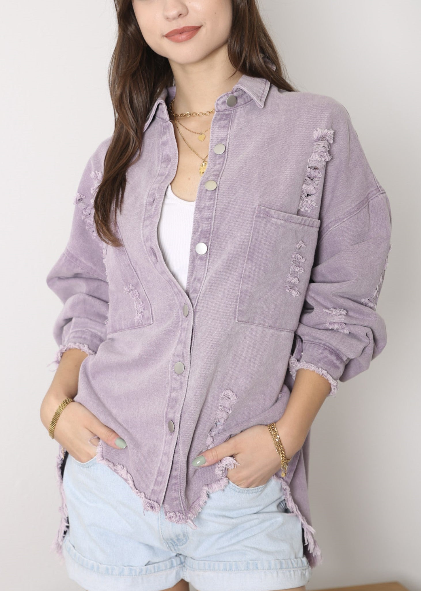 The Anna-Kaci distressed denim jacket features a casual loose fit, button closure, and classic jean jacket shapes.