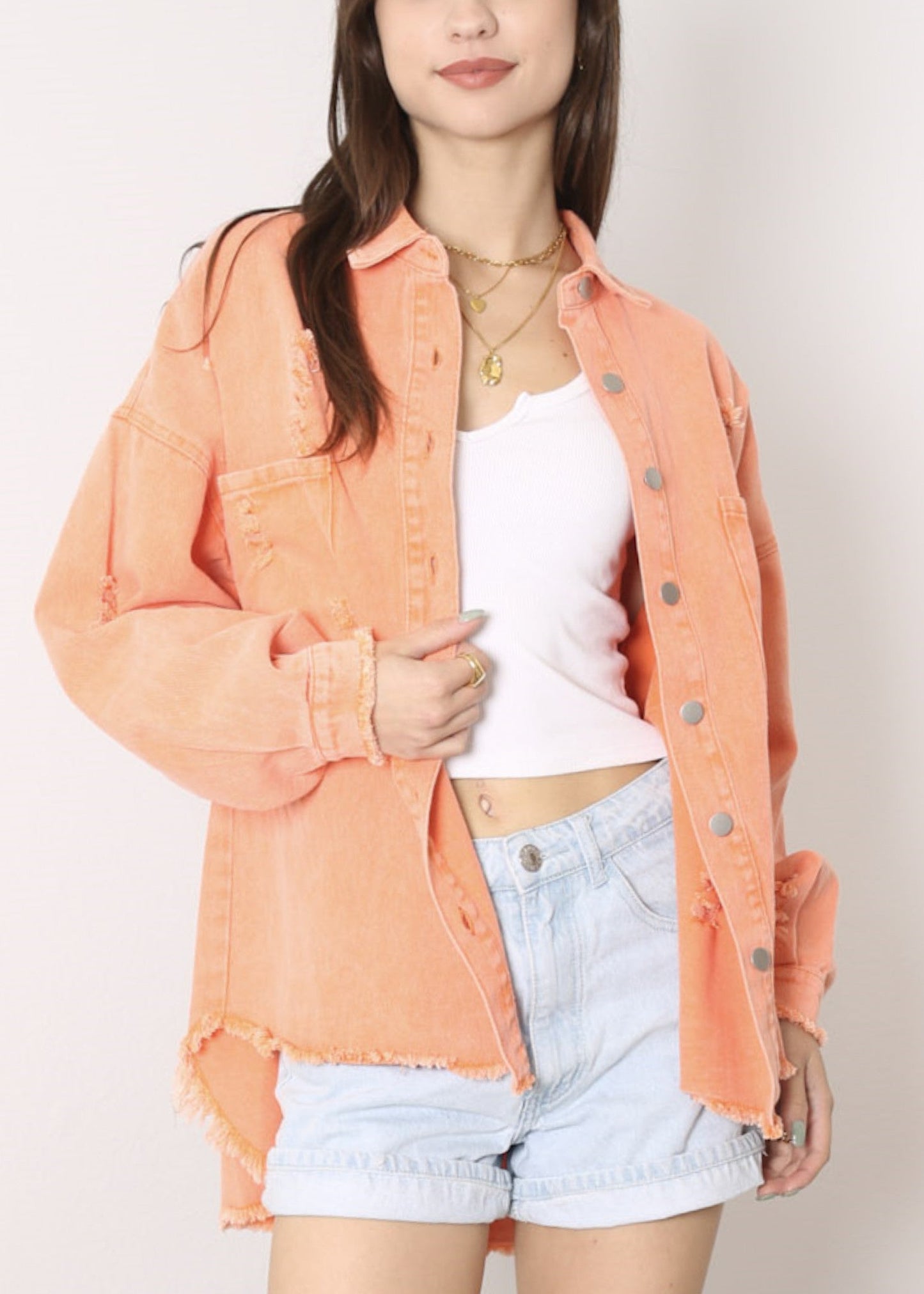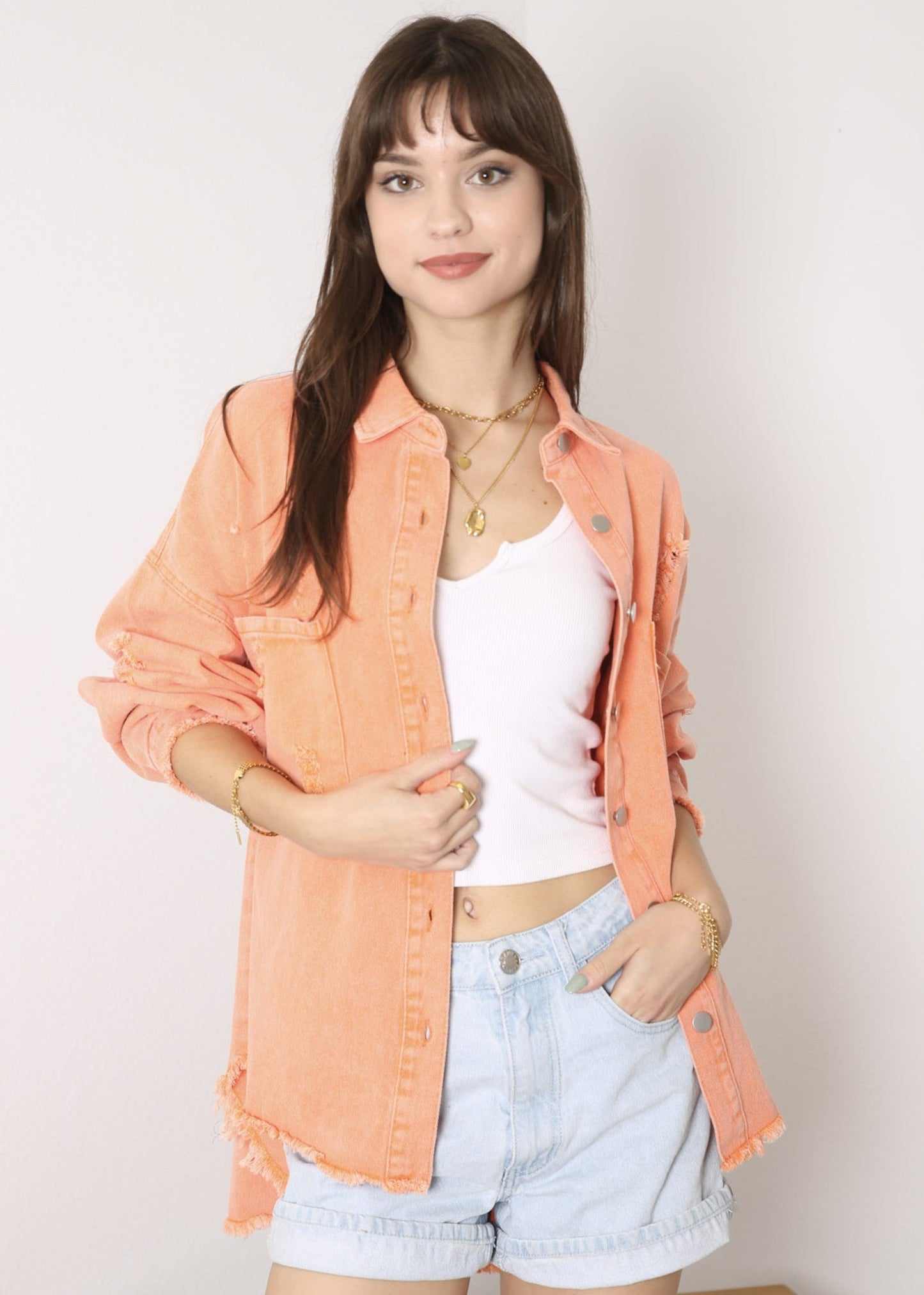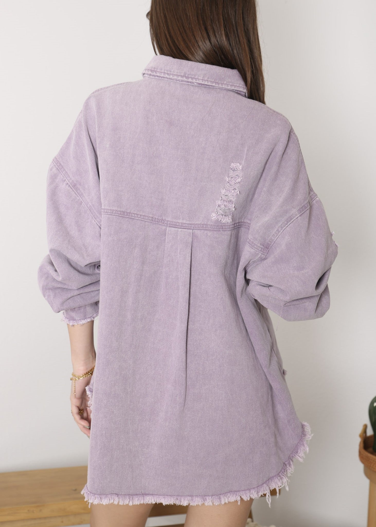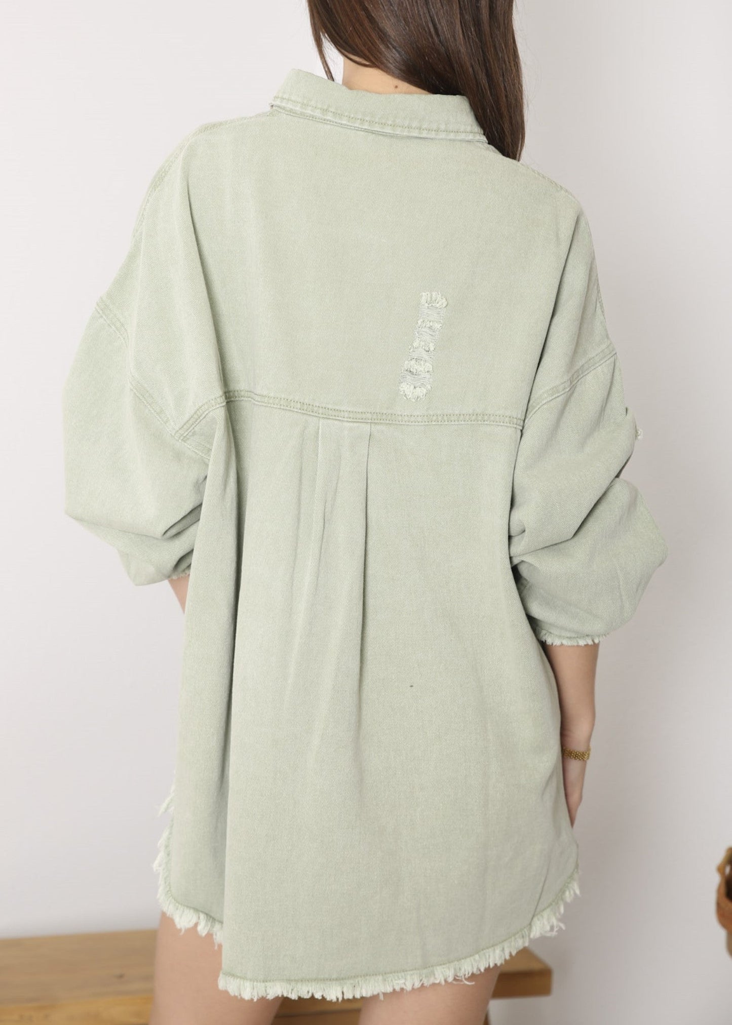 The Anna-Kaci distressed denim jacket features a casual loose fit, button closure, and classic jean jacket shapes.