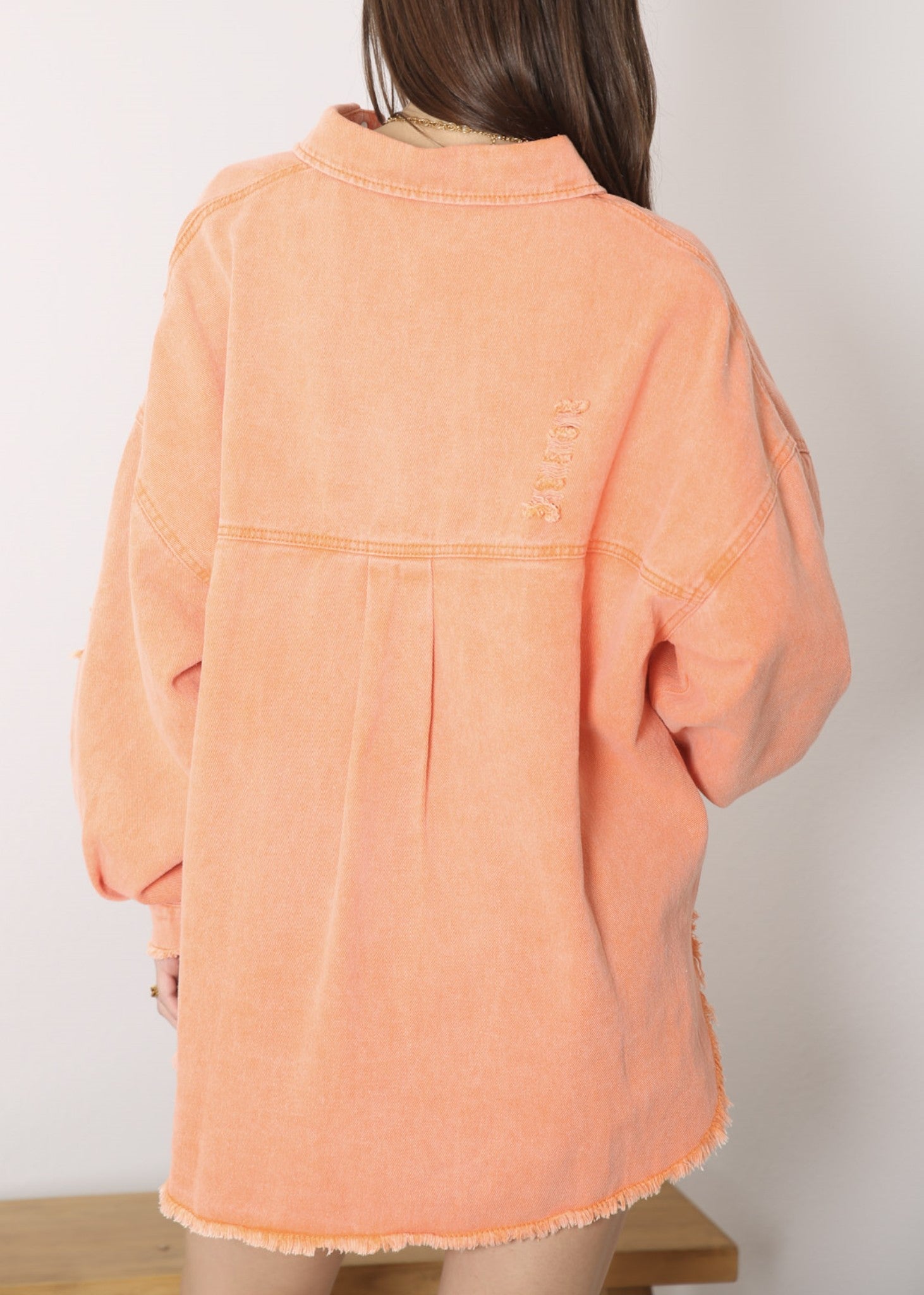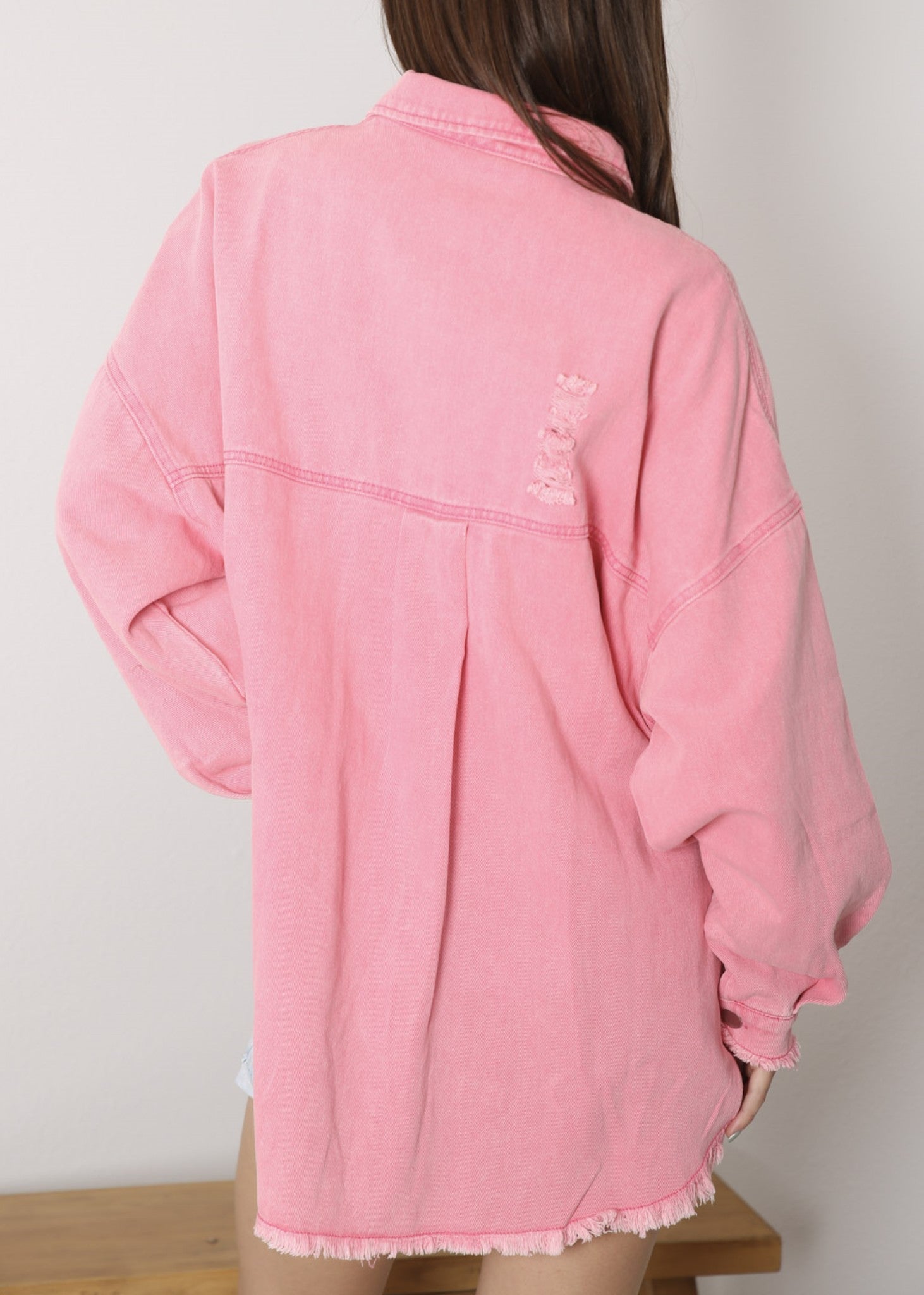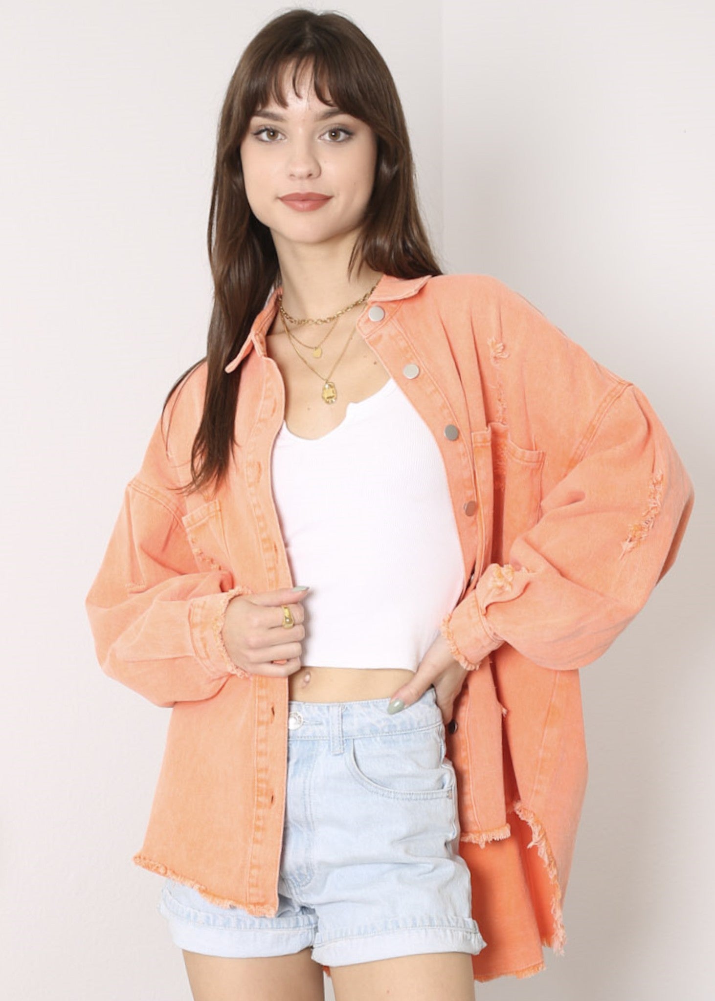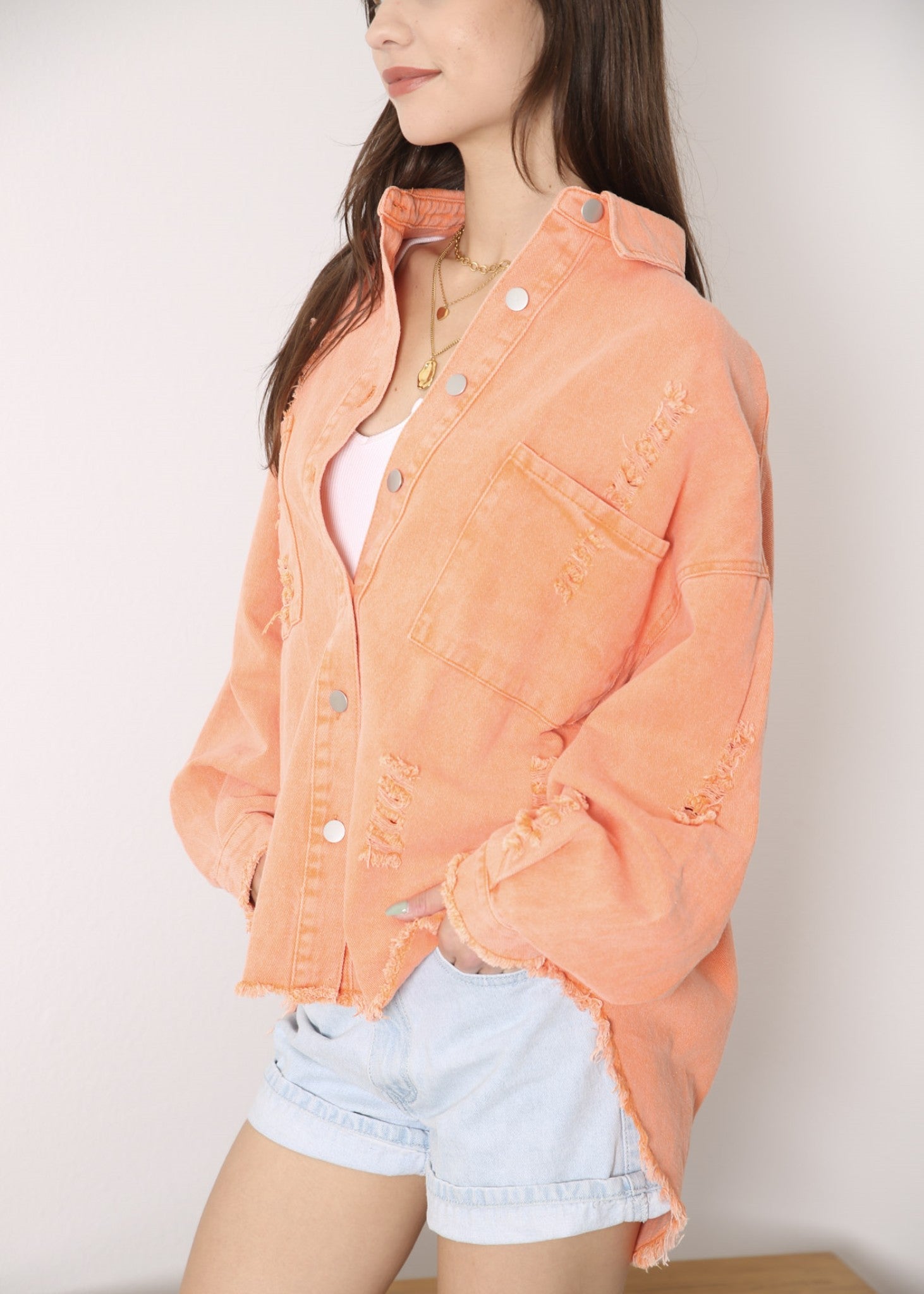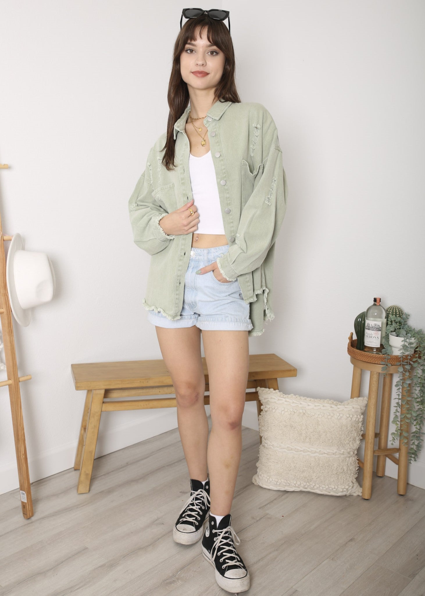 The Anna-Kaci distressed denim jacket features a casual loose fit, button closure, and classic jean jacket shapes.
