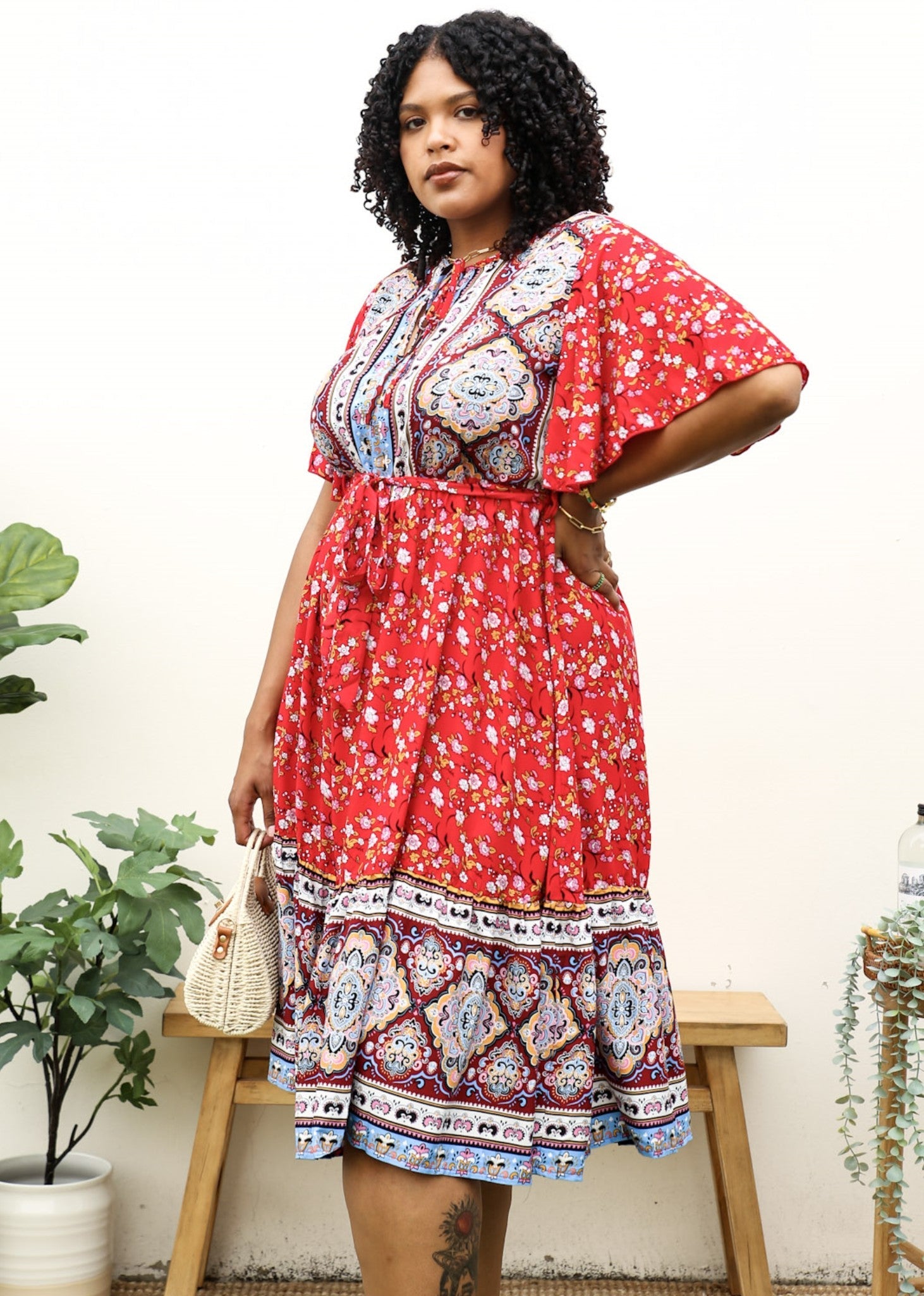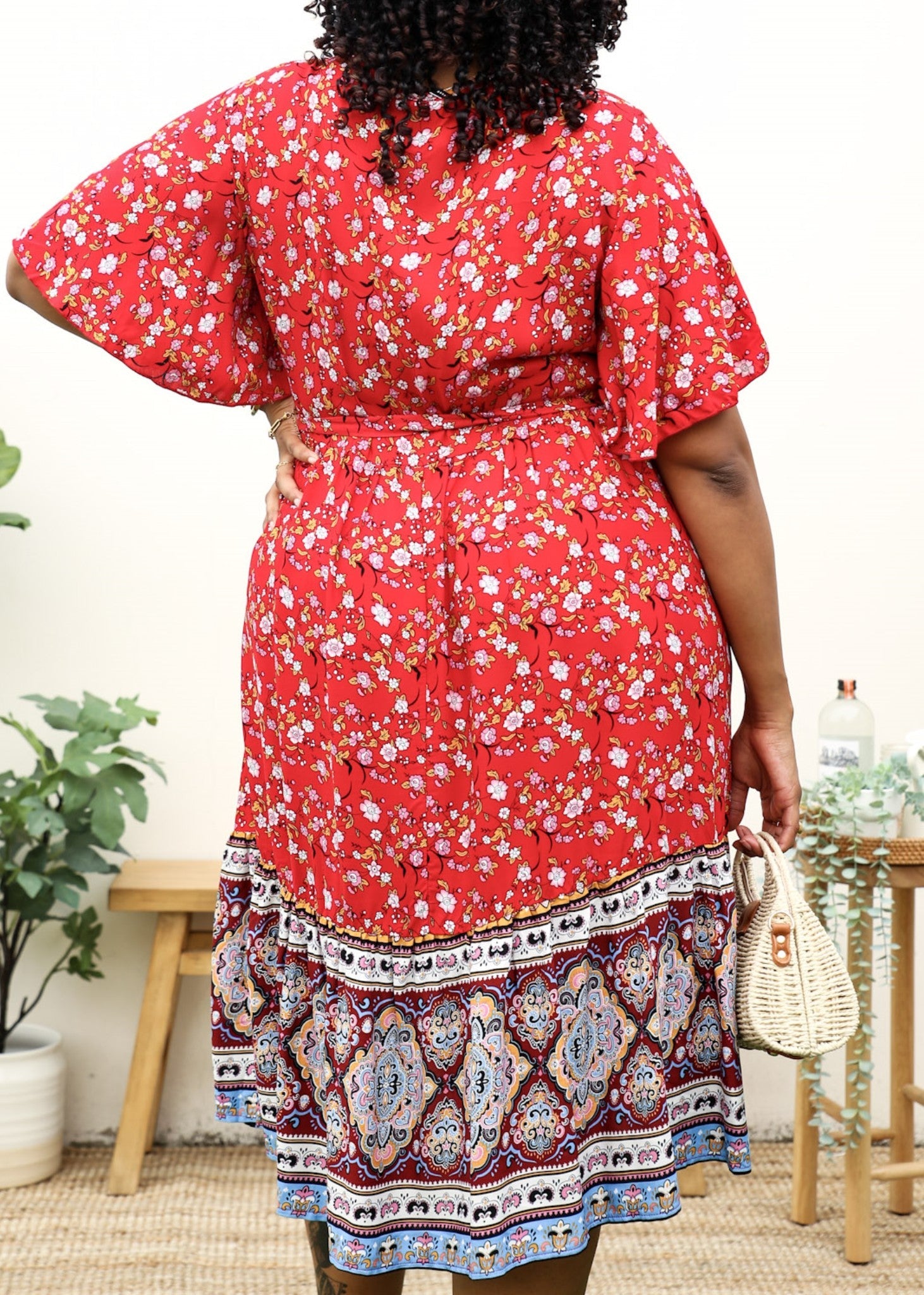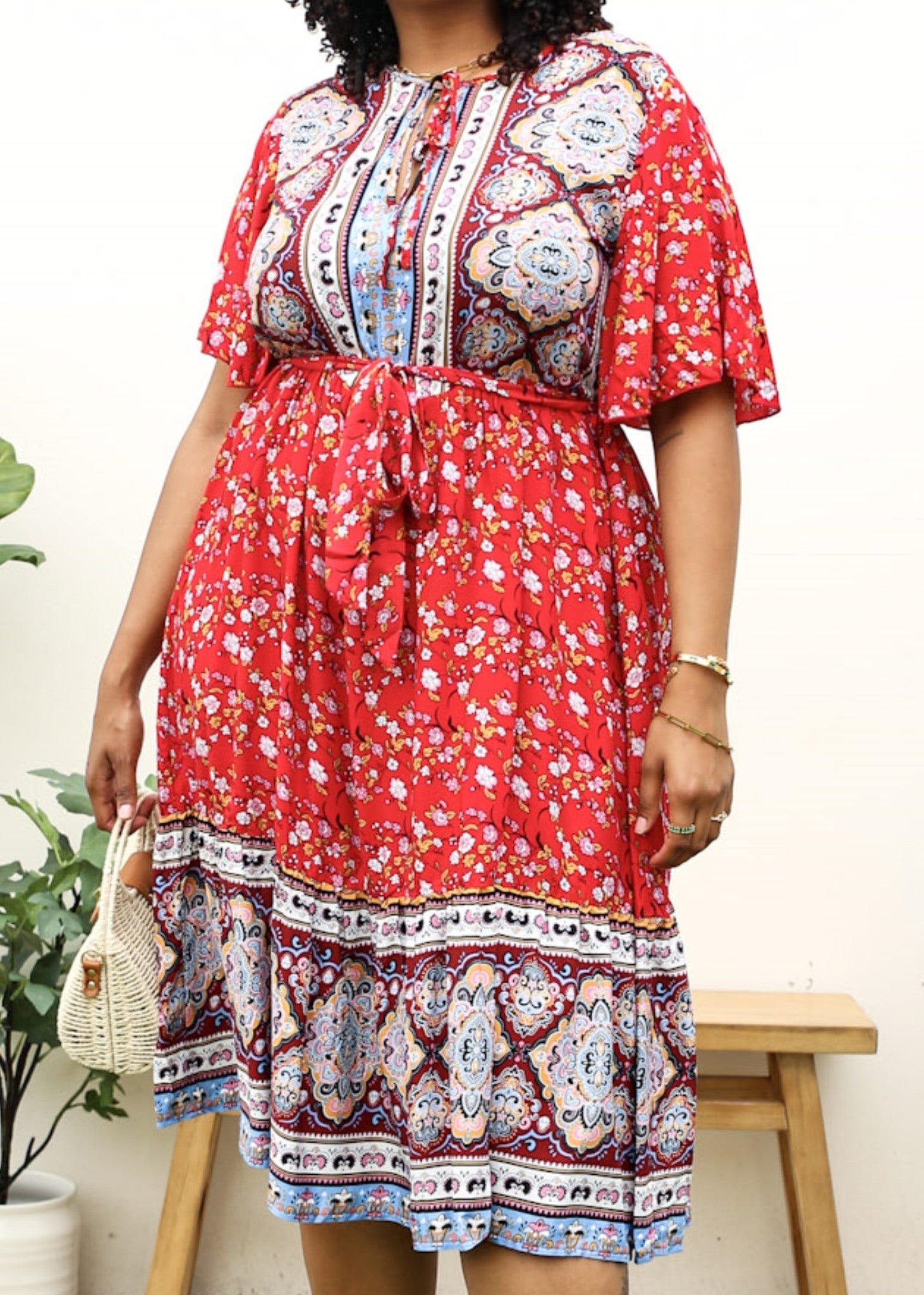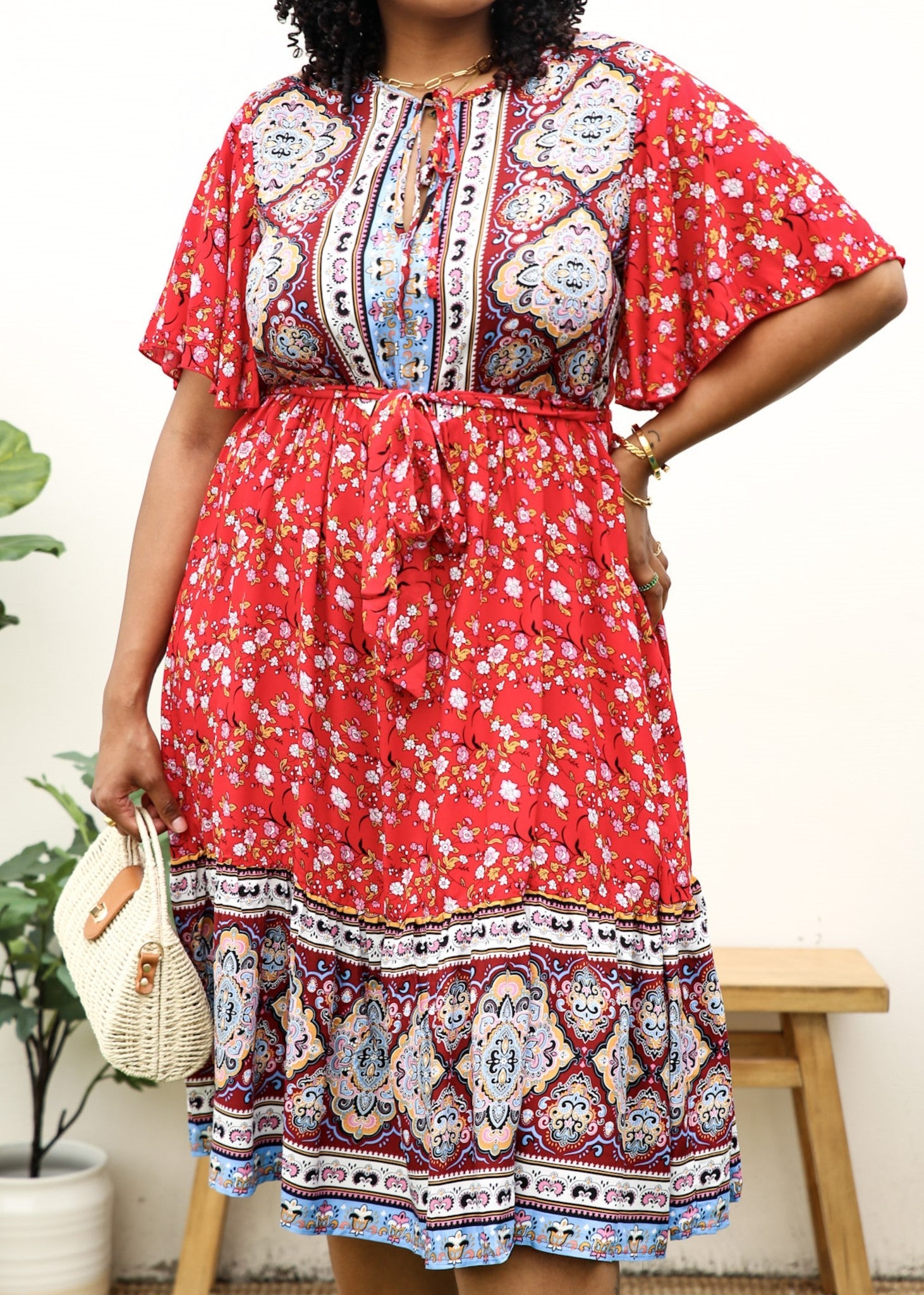 Embrace boho-chic vibes with the Anna-Kaci plus size midi dress. This red dress features a front keyhole tied neck and a beautiful paisley floral boho print, exuding charm and elegance. The short sleeves and tied belt waist create a flattering silhouette. Whether you're attending a garden party or a special occasion, this midi dress pairs beautifully with heels and delicate accessories for a romantic and fashionable look.
