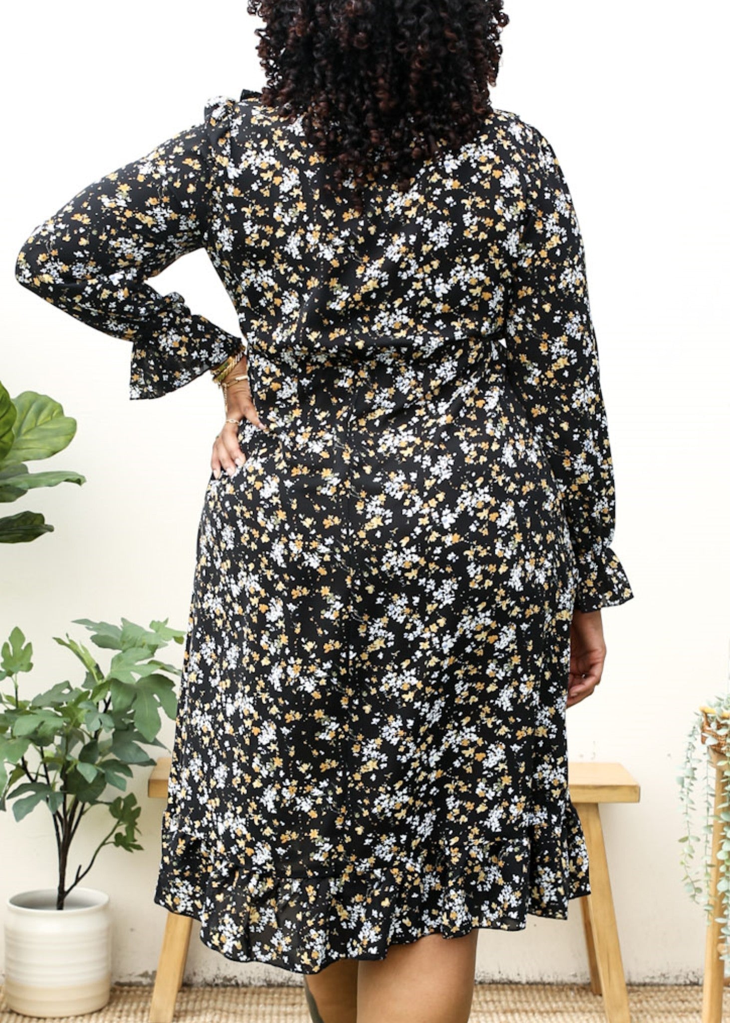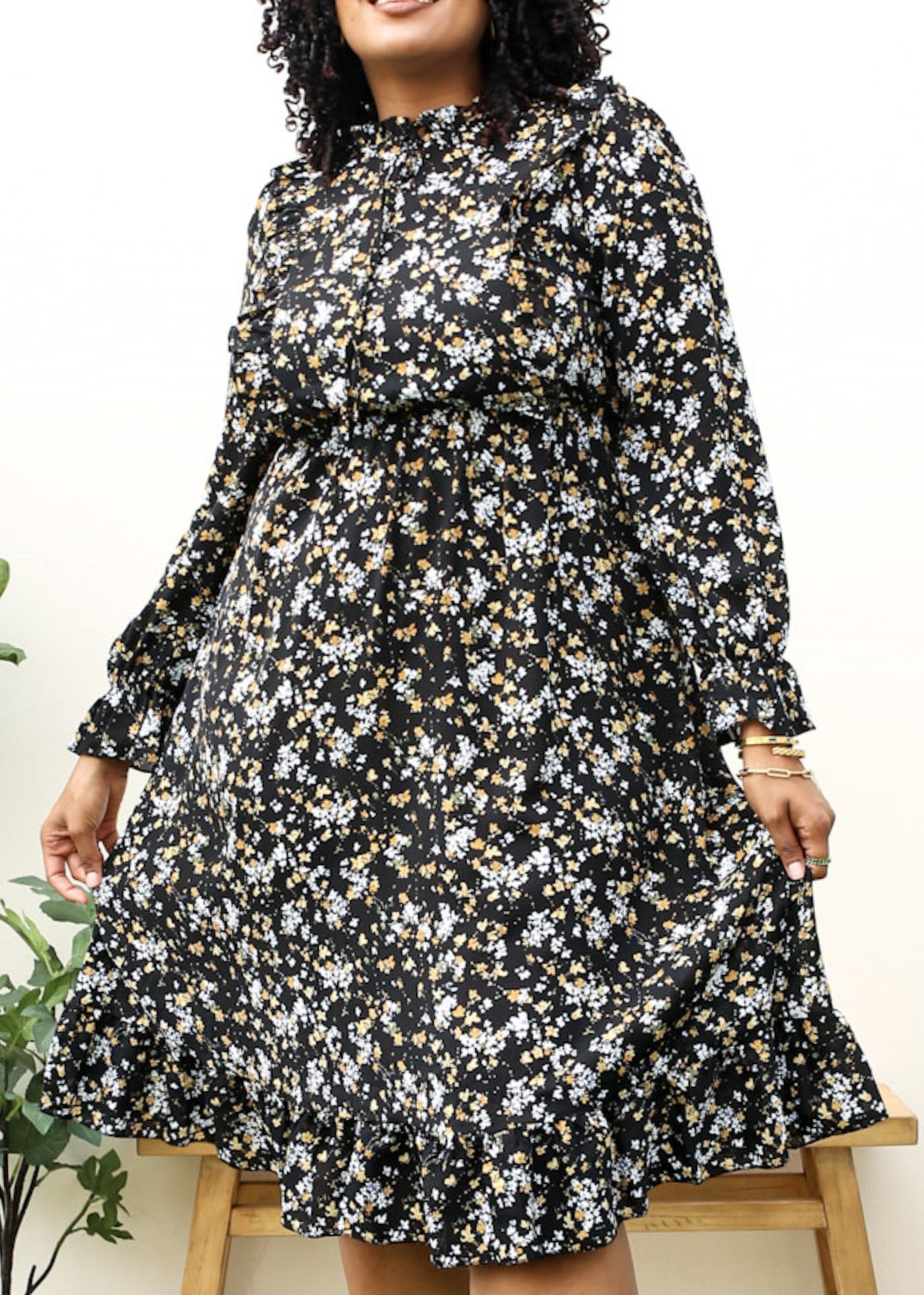Plus Size High Neck Ruffle Cuffs Floral Print Black Midi Dress